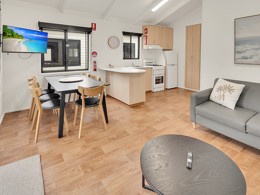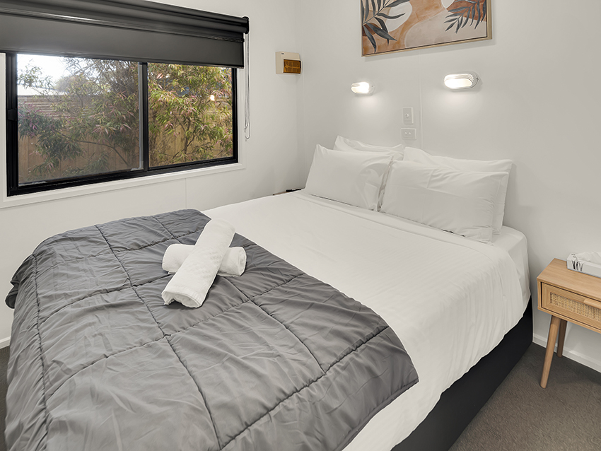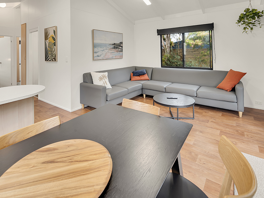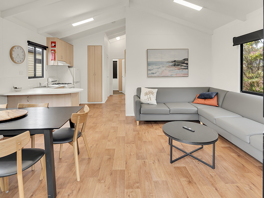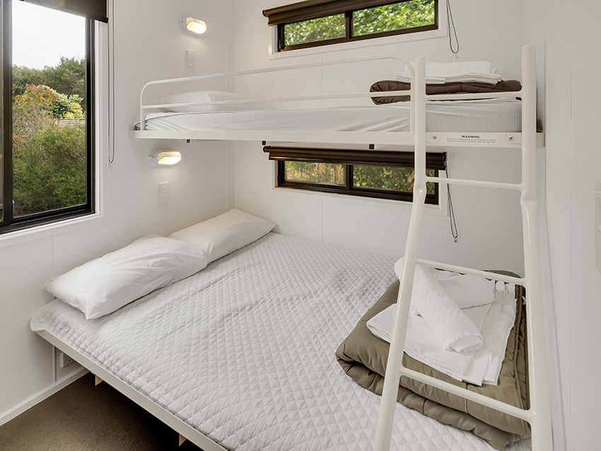These 3 Bedroom Villas sleep up to seven guests with a queen bed in the main bedroom, a double bed with single upper bunk in the second bedroom and a bunk in the third bedroom, as well as a bathroom, living area, kitchen and private deck with BBQ.