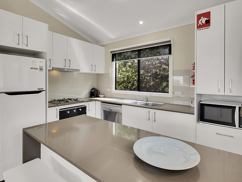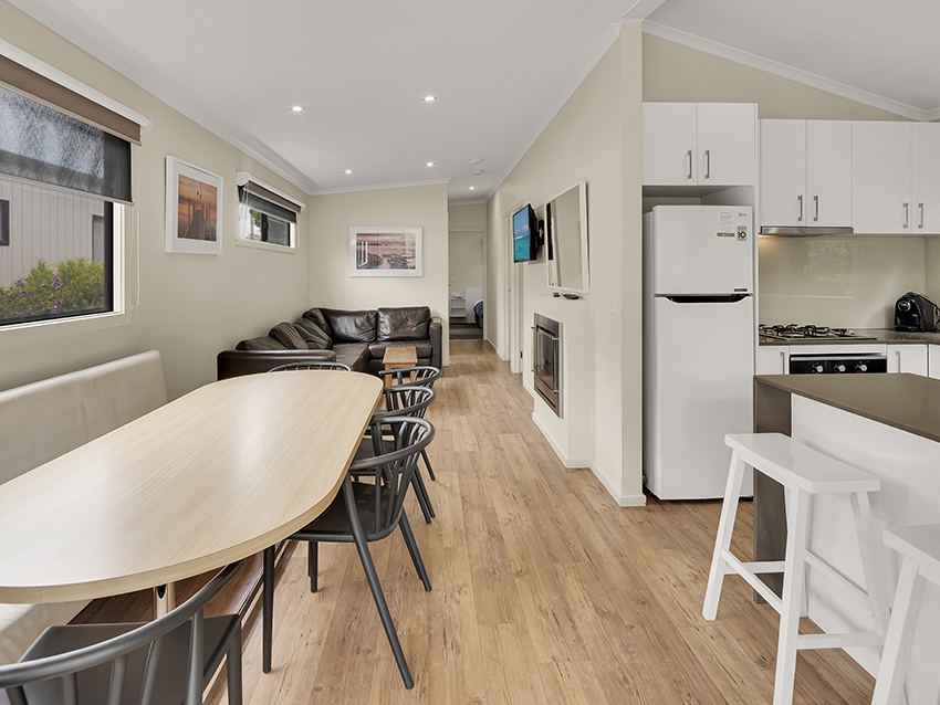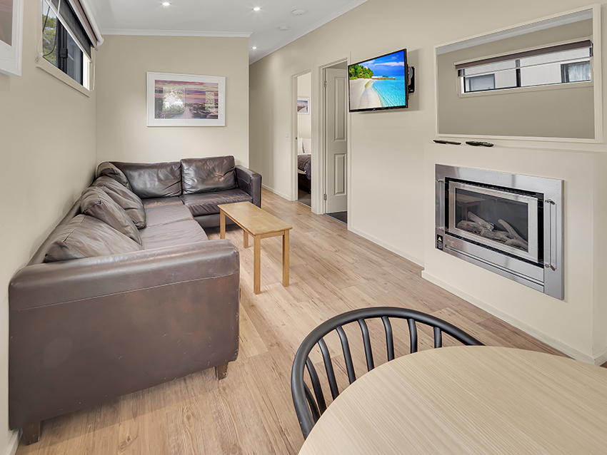 Our Superior Villas sleep up to eight guests with a king bed in the main bedroom, a queen bed in the second bedroom and two bunks in the third bedroom, as well as 2 bathrooms, living area, kitchen, and a private deck with BBQ, plus a luxurious gas log fire.