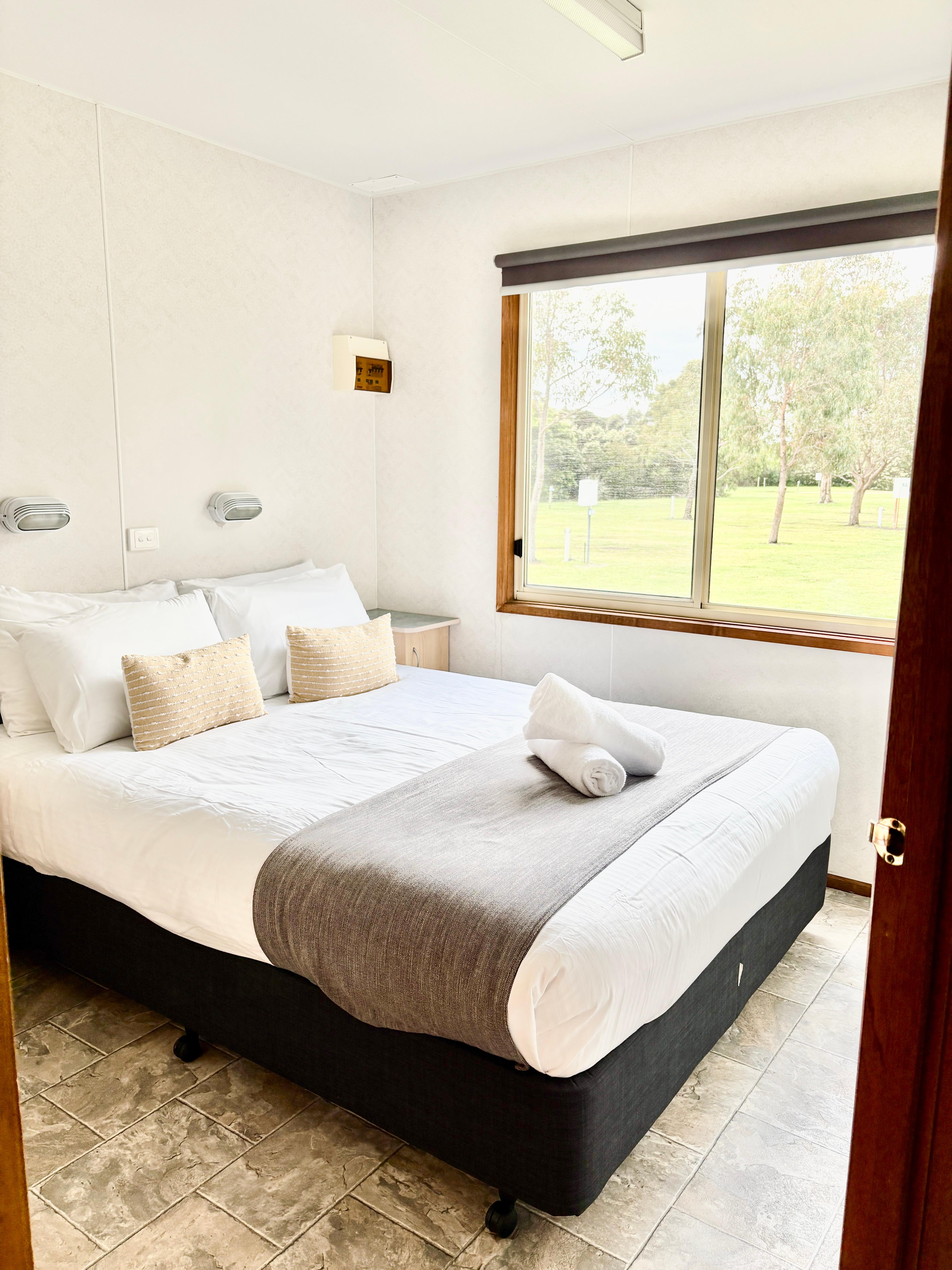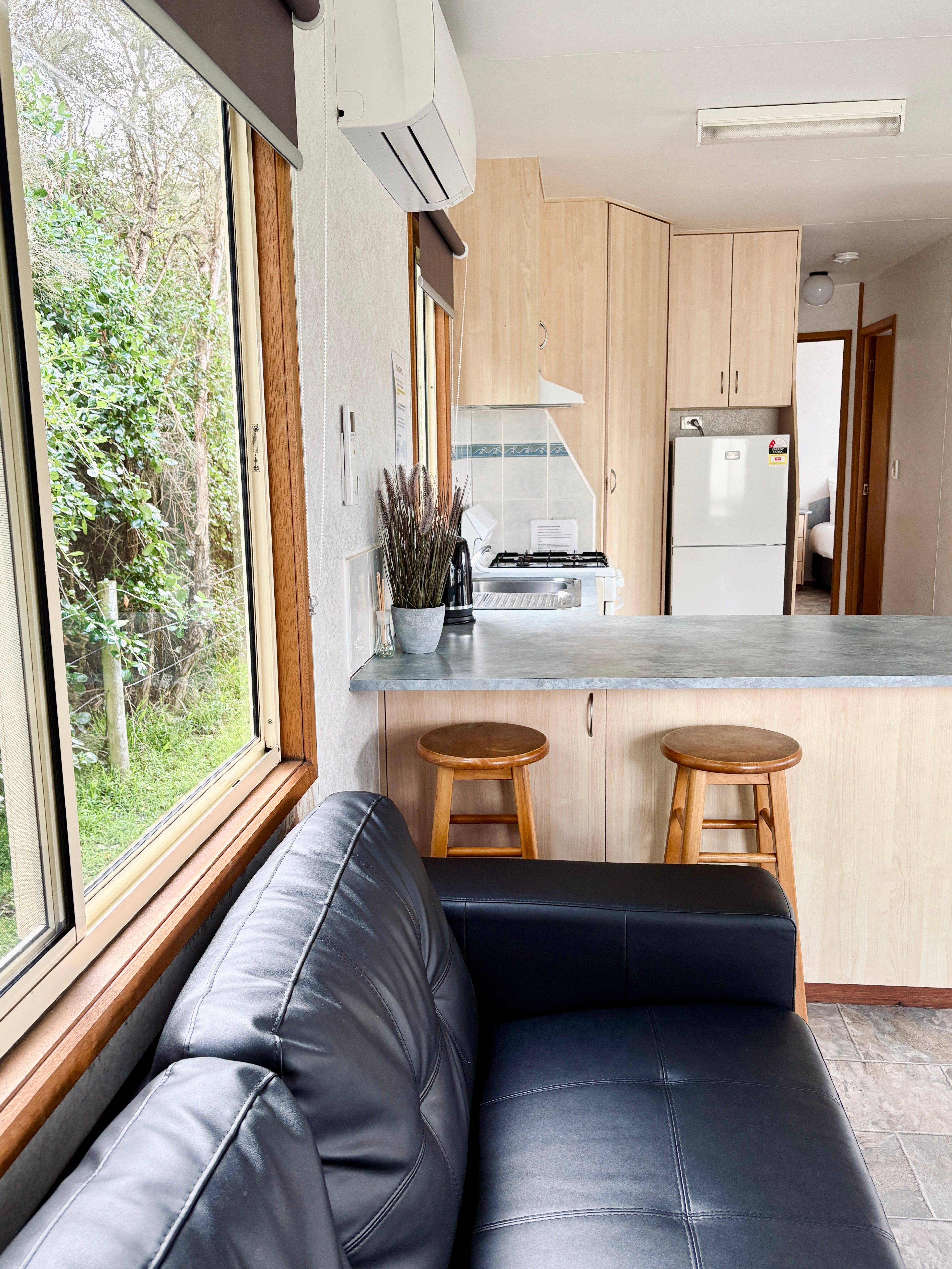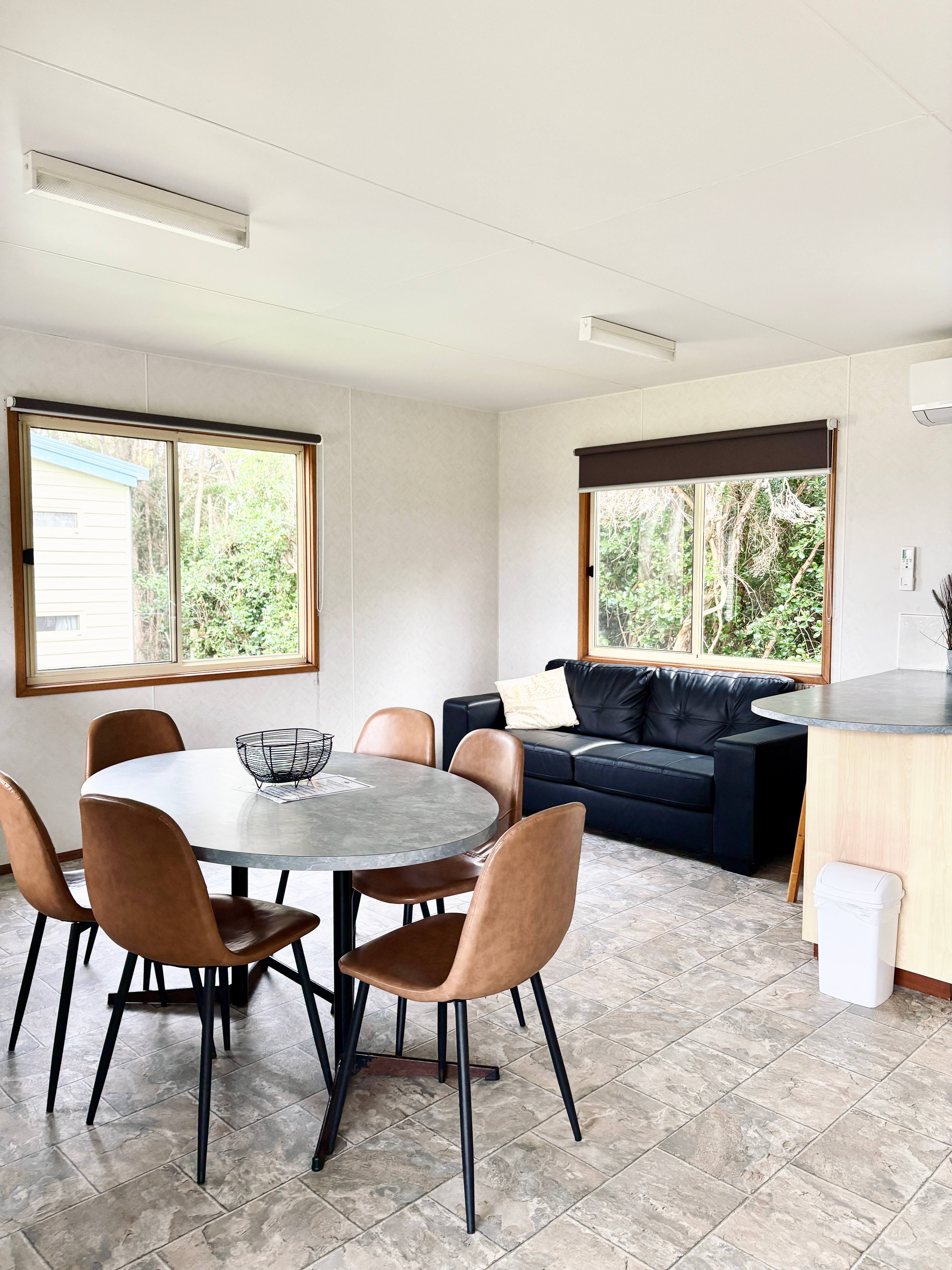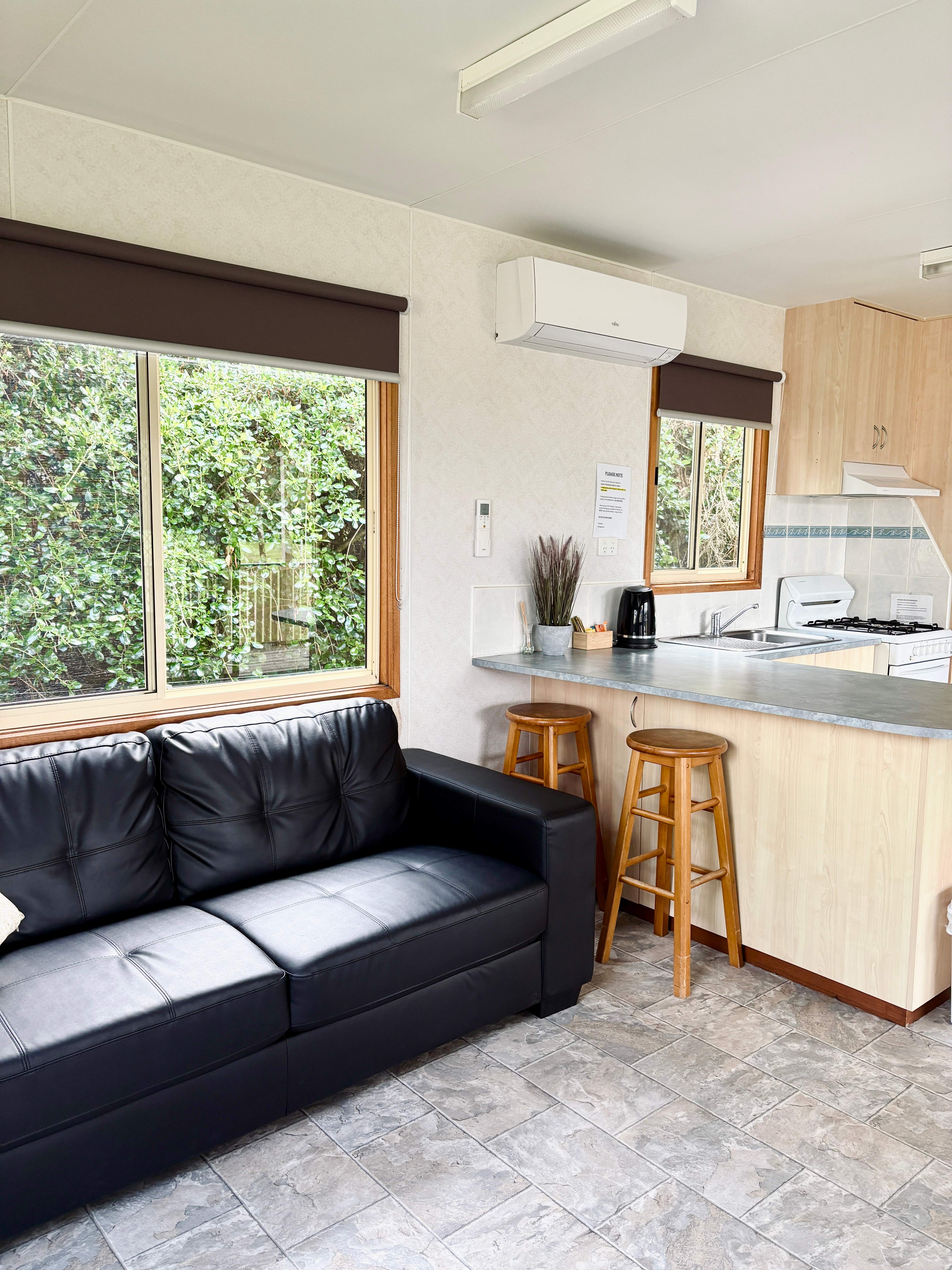 Self-contained cabin with a fully equipped kitchen, ensuite, air-conditioning/heating, TV, living area, enclosed veranda area, sleeps up to five.
