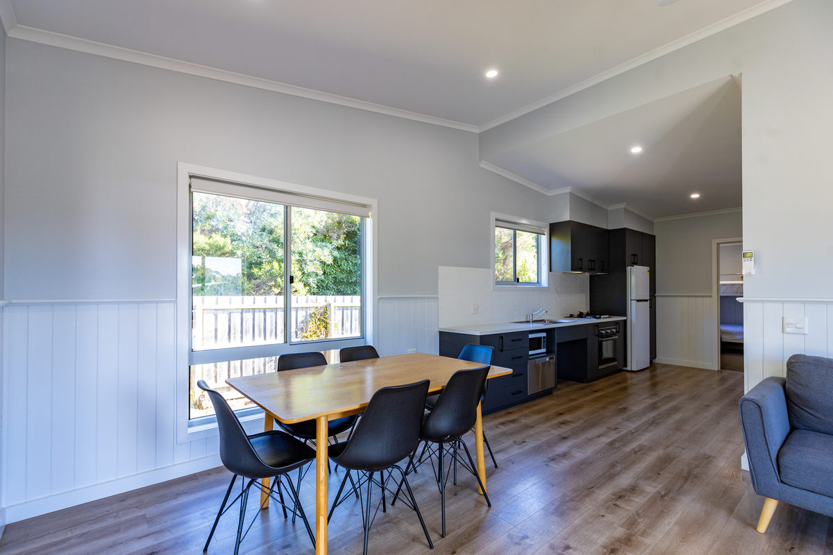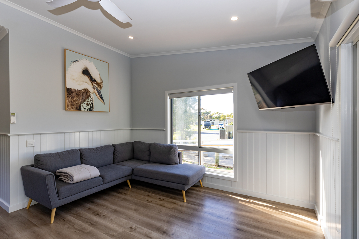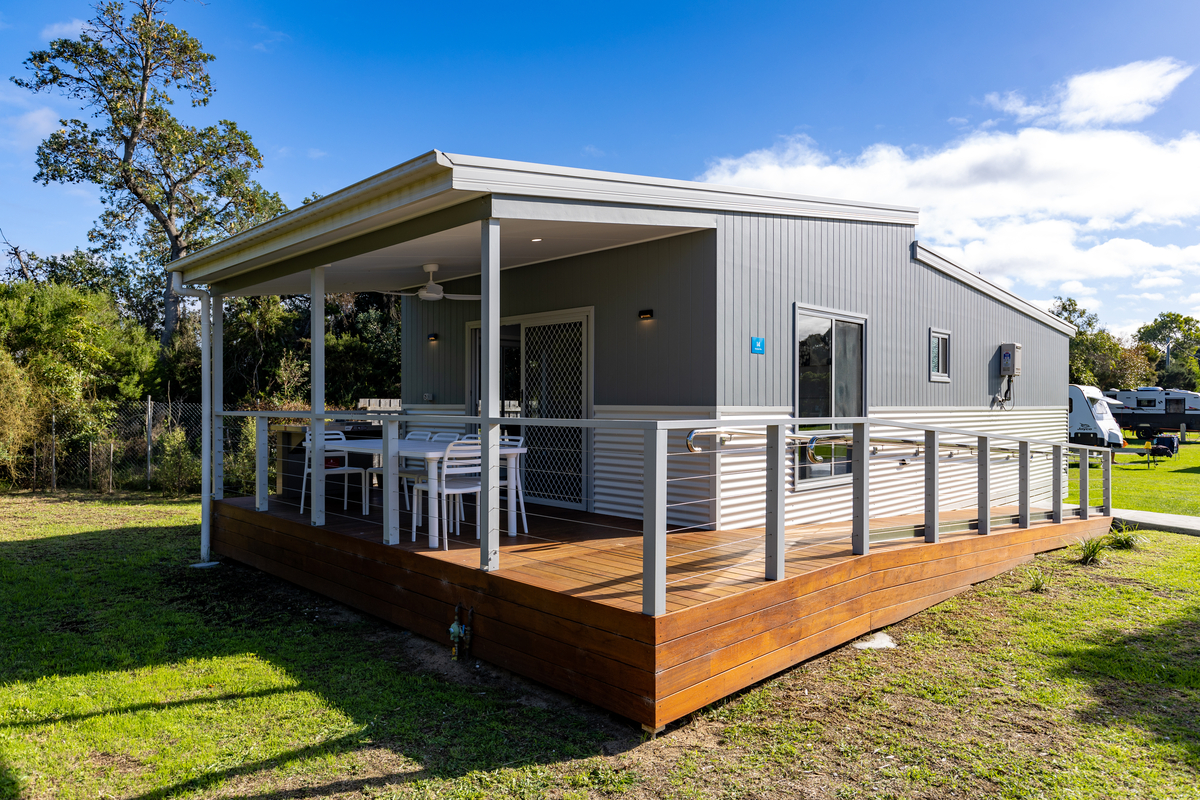 Two bedroom cabin located in a quiet area of the park. One queen, one king single bunk and one single sleeping up to five. Features include ramp access, air-conditioning; heating; full kitchen including stovetop, oven, dishwasher, microwave and fridge; accessible bathroom; patio with outdoor dining; lounge and dining area with TV.