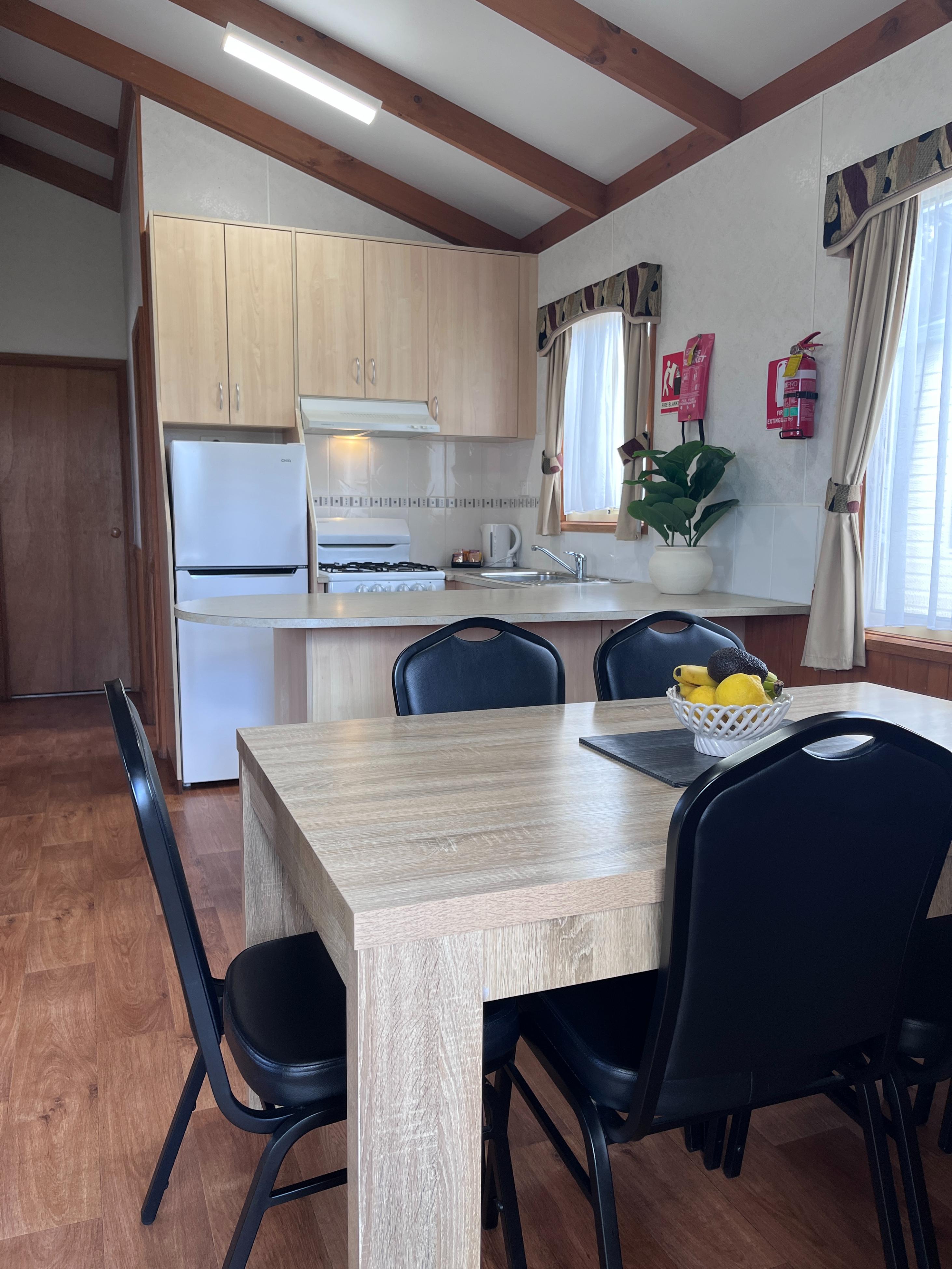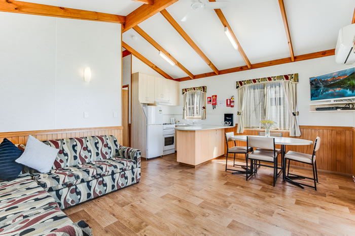 The cabin includes a fully equipped kitchen with a fridge, microwave, and gas cooktop. Enjoy the open plan living and dining area, a bathroom with a shower, toilet, and hand basin, plus reverse cycle air conditioning and ceiling fans for your comfort.