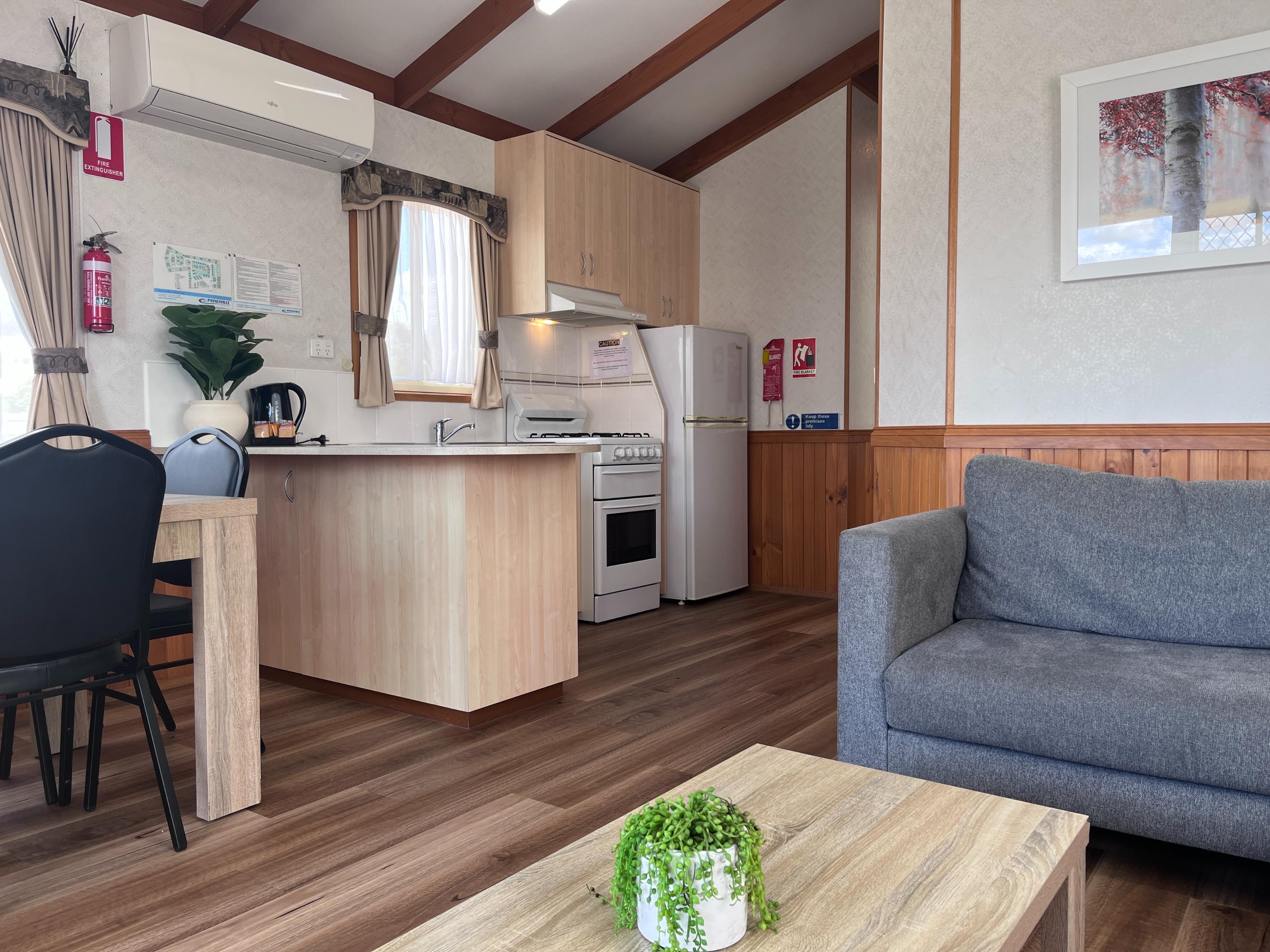 Enjoy a fully equipped kitchen with a fridge, microwave, and gas cooktop. The open-plan living and dining area is perfect for relaxing. You'll also find a bathroom with a shower, toilet, and hand basin, plus reverse cycle air conditioning and ceiling fans for your comfort. Please note, these villas aren't suitable for pets.