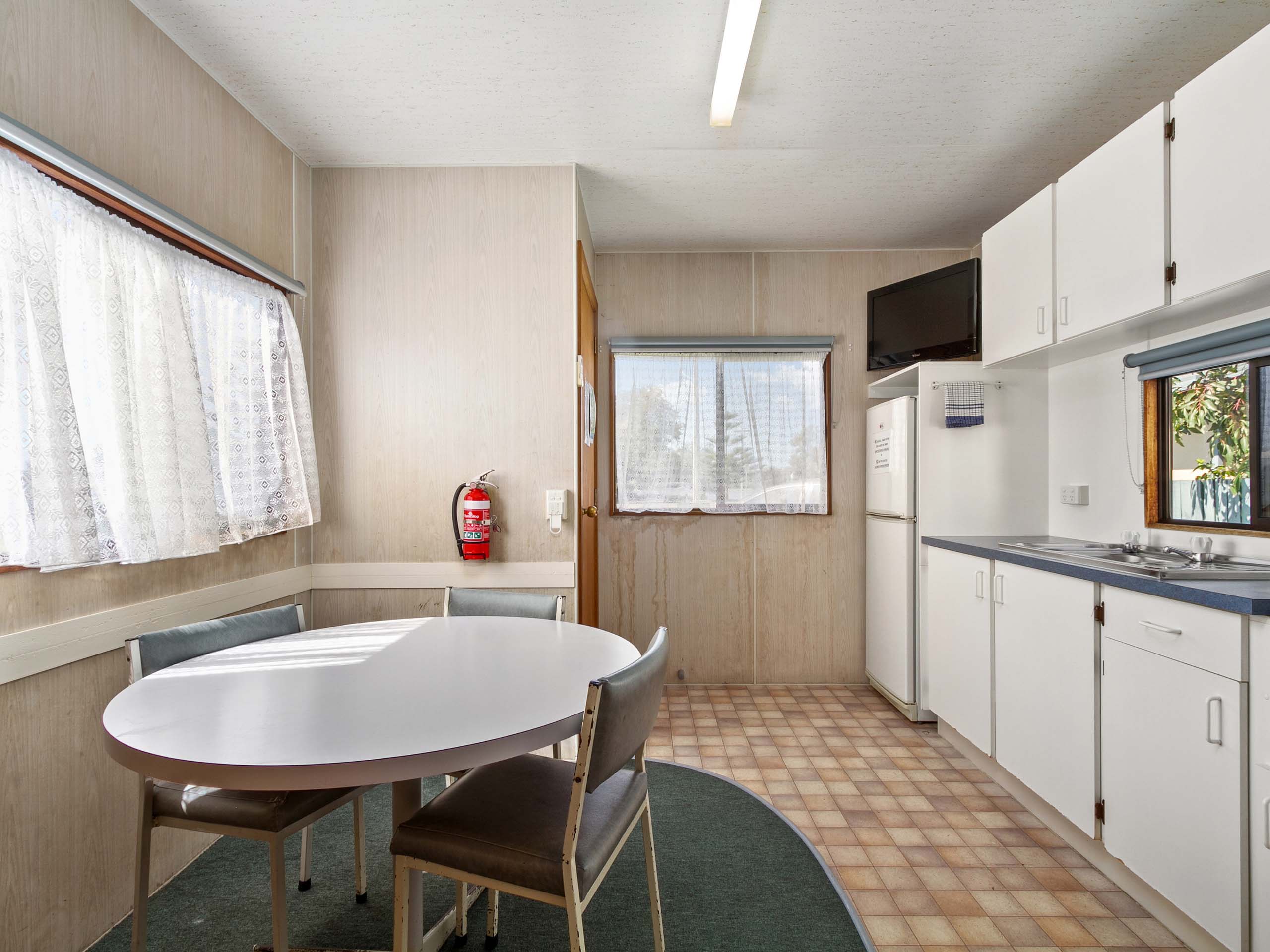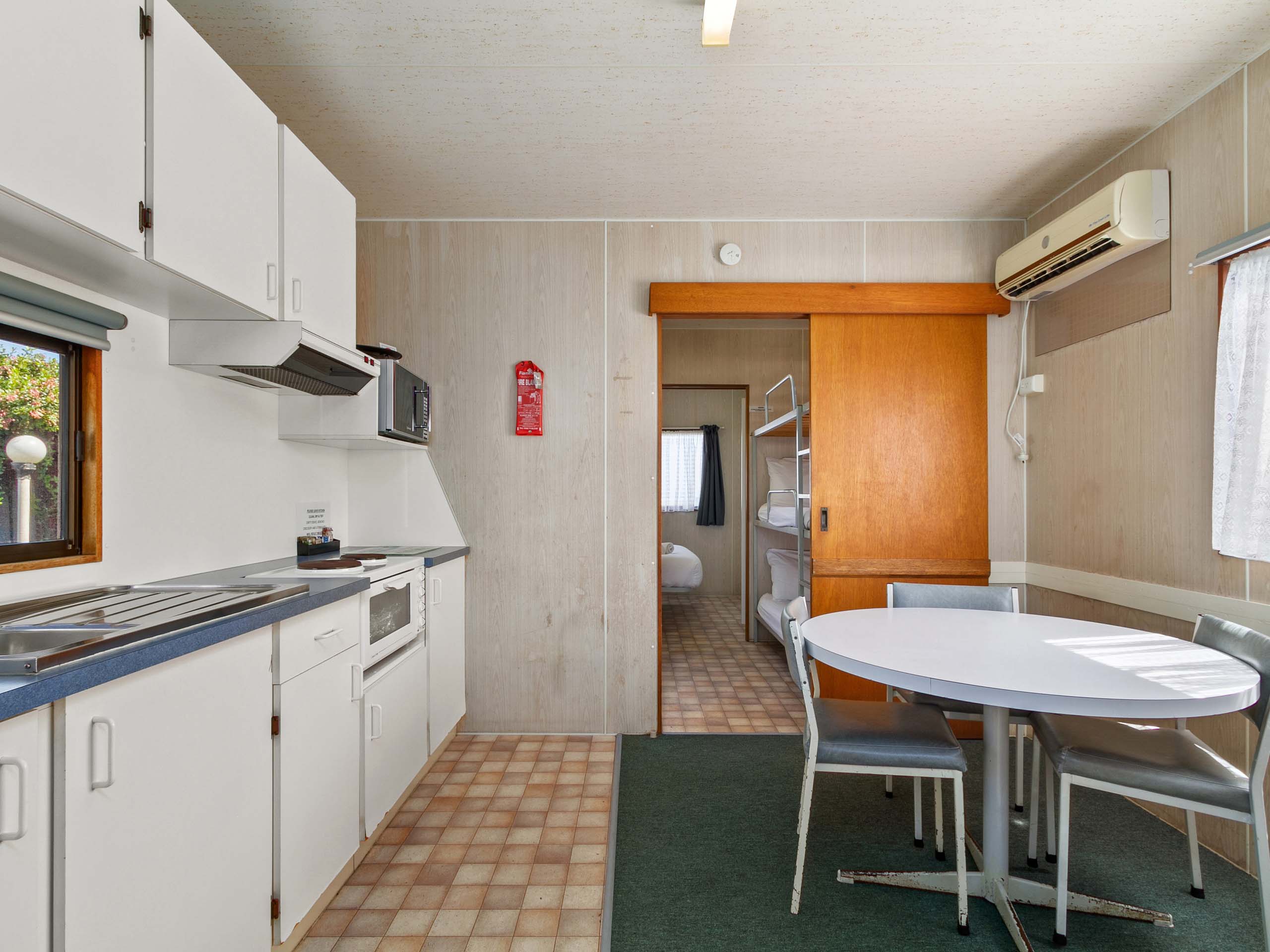 Ideal for families on a budget, this cabin sleeps up to four guests with a double bed in the living area and a set of bunks in a separate room. The kitchenette includes a microwave, electric stovetop, toaster and bar fridge. With air conditioning, TV, and a private verandah, it's a cosy and affordable base close to the beach.