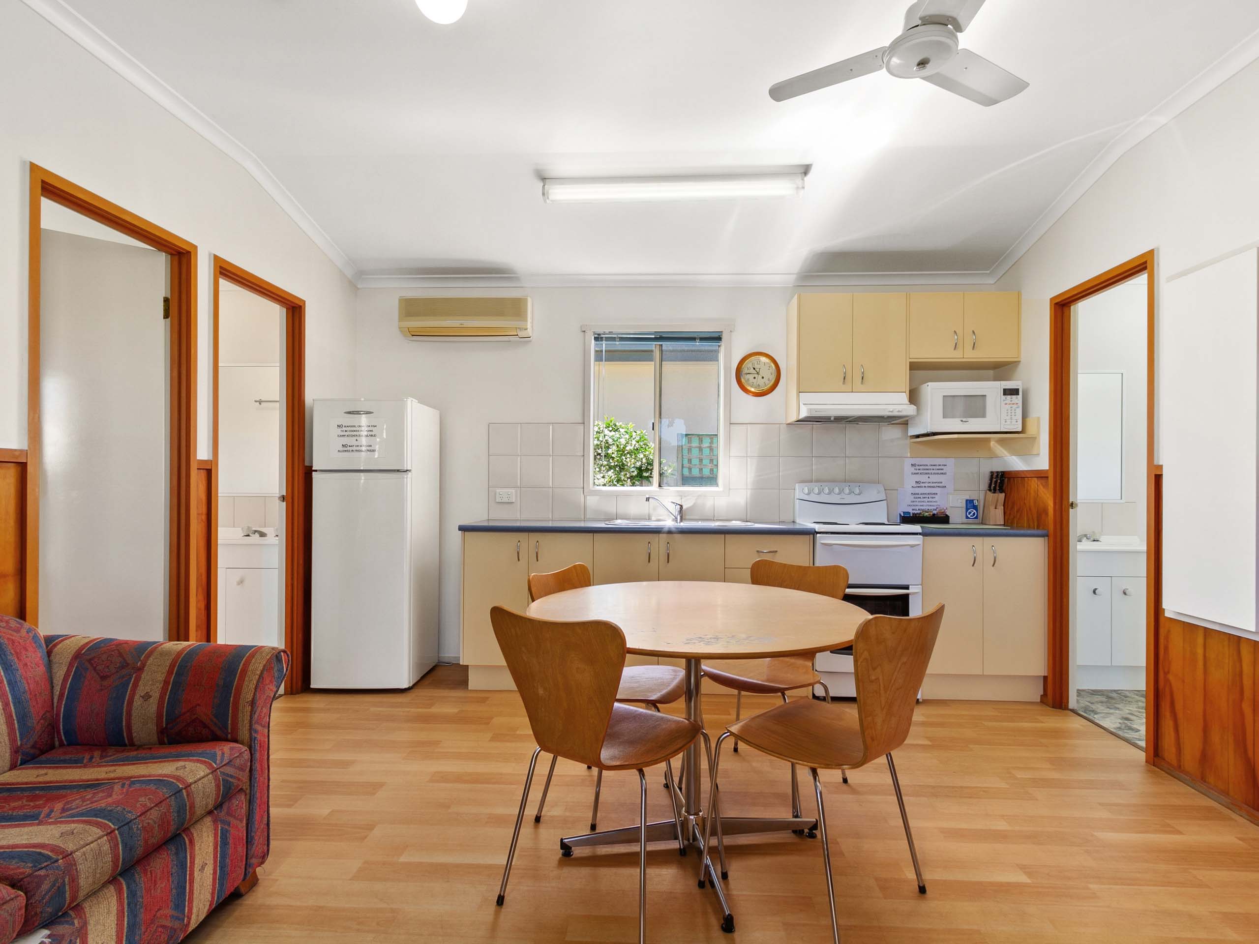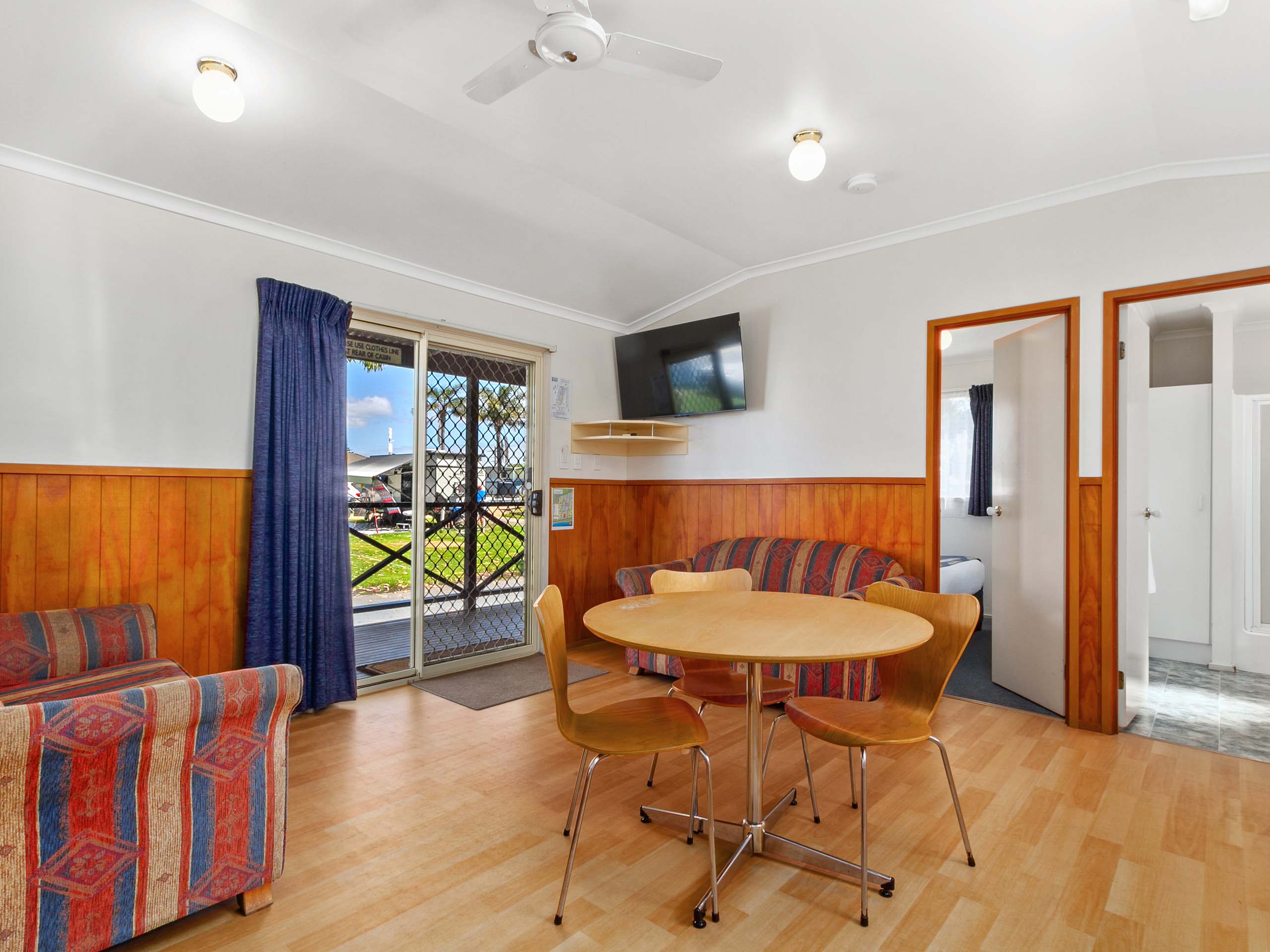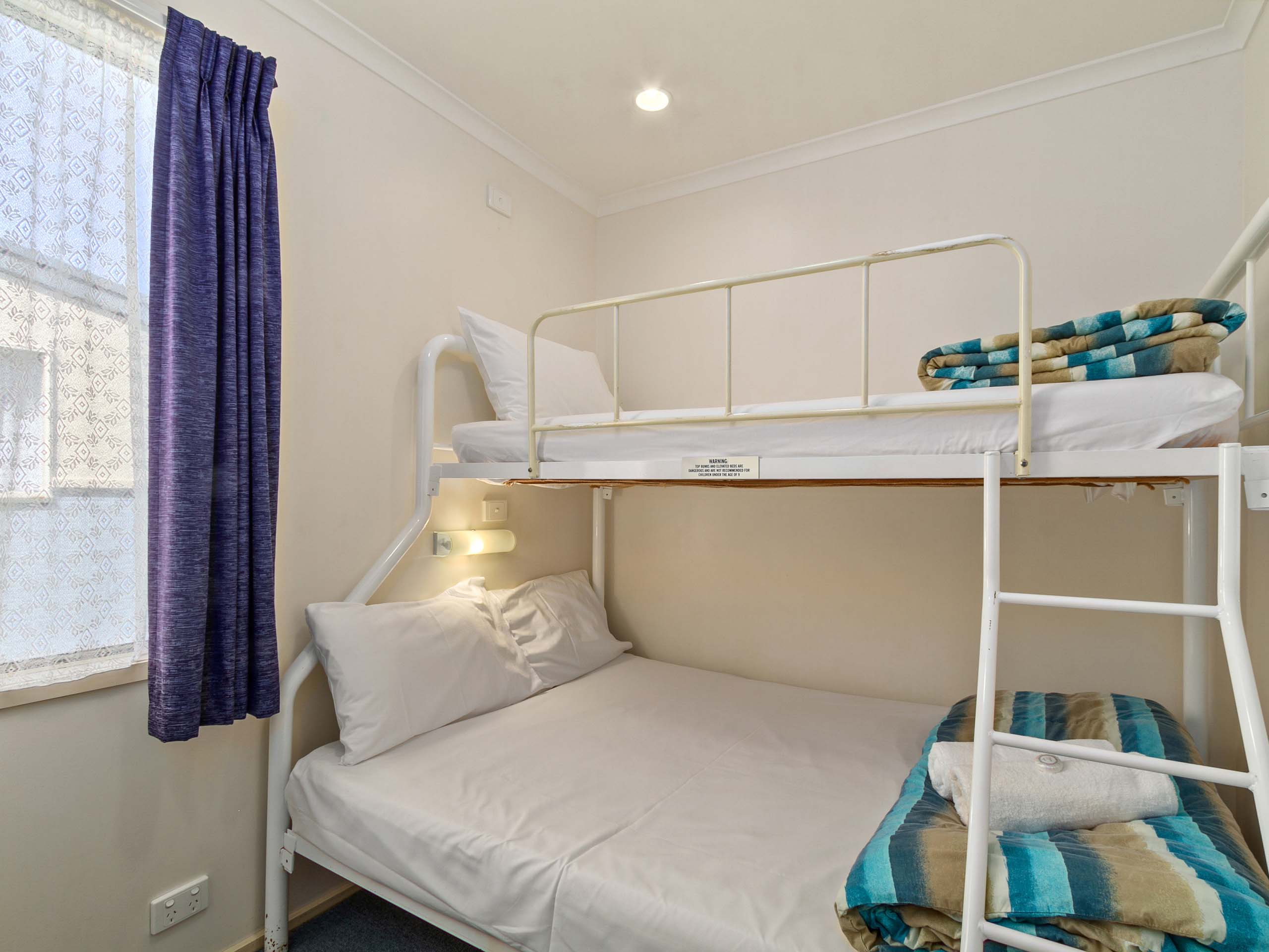 This spacious two-bedroom cabin is ideal for families, sleeping up to five guests with a queen bed and a bunk with a single over double. The full kitchen includes an oven, microwave and full-size fridge, while the lounge features air conditioning and a TV. Enjoy meals on the verandah with outdoor seating after a day at the beach or exploring Lakes Entrance.