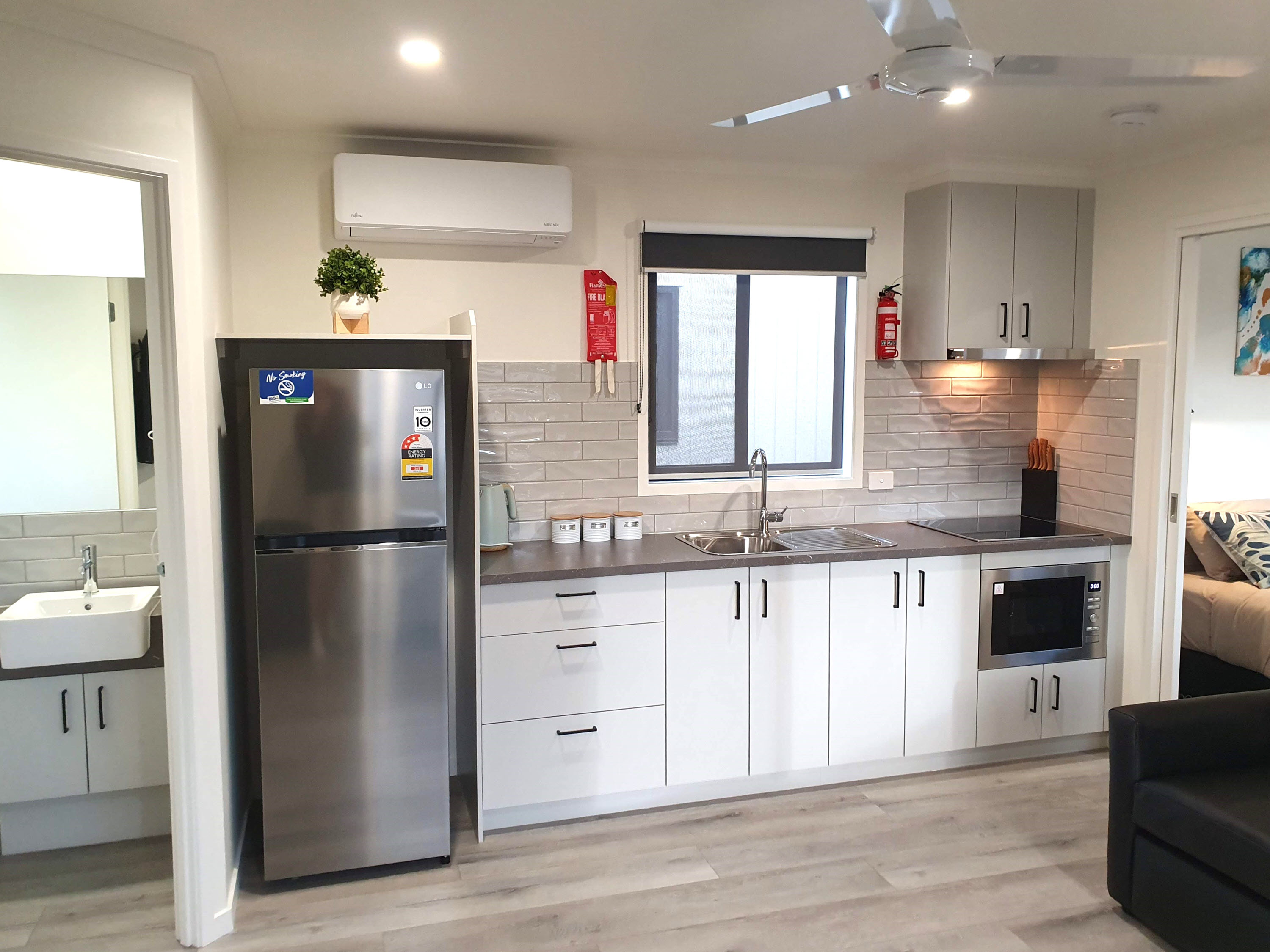 Brand new in September 2023, our 2 Bedroom Deluxe Villas are beautifully appointed and feature a comfortable lounge area with a large 50 inch TV, dining table for four and a fully equipped kitchen. Stay comfortable year-round with reverse-cycle air conditioning and ceiling fans in the living area and both bedrooms. Outside, enjoy a furnished verandah with parking alongside, close to all facilities. The two bedrooms sleep up to 4 guests with a luxurious king size bed and TV in the main bedroom, and two quality single beds in the second bedroom, along with a modern bathroom. All linen is provided.