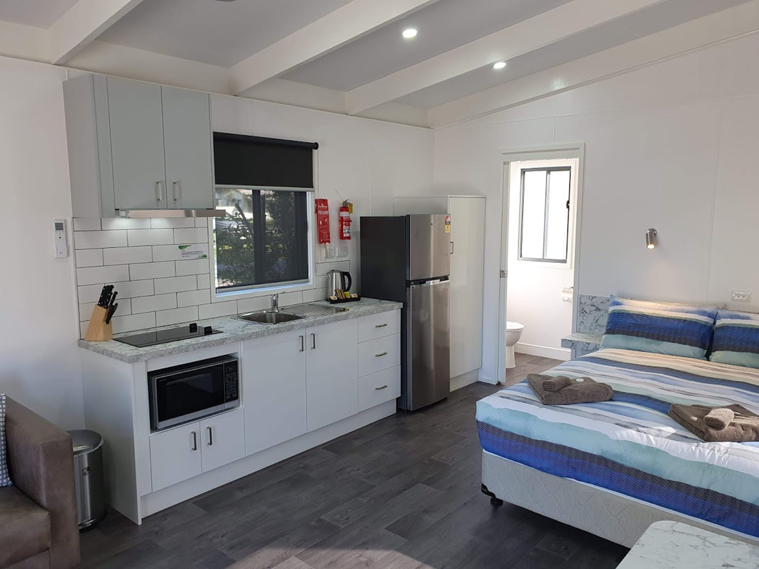 Couples or solo travellers will love our newest studio accommodation in Lakes Entrance. Our modern studios are open-plan and have everything you need for a comfortable and relaxing stay. Complete with a queen size bed with linen provided, reverse-cycle air-conditioning, ensuite bathroom, kitchenette, LCD TV and verandah with outdoor setting.