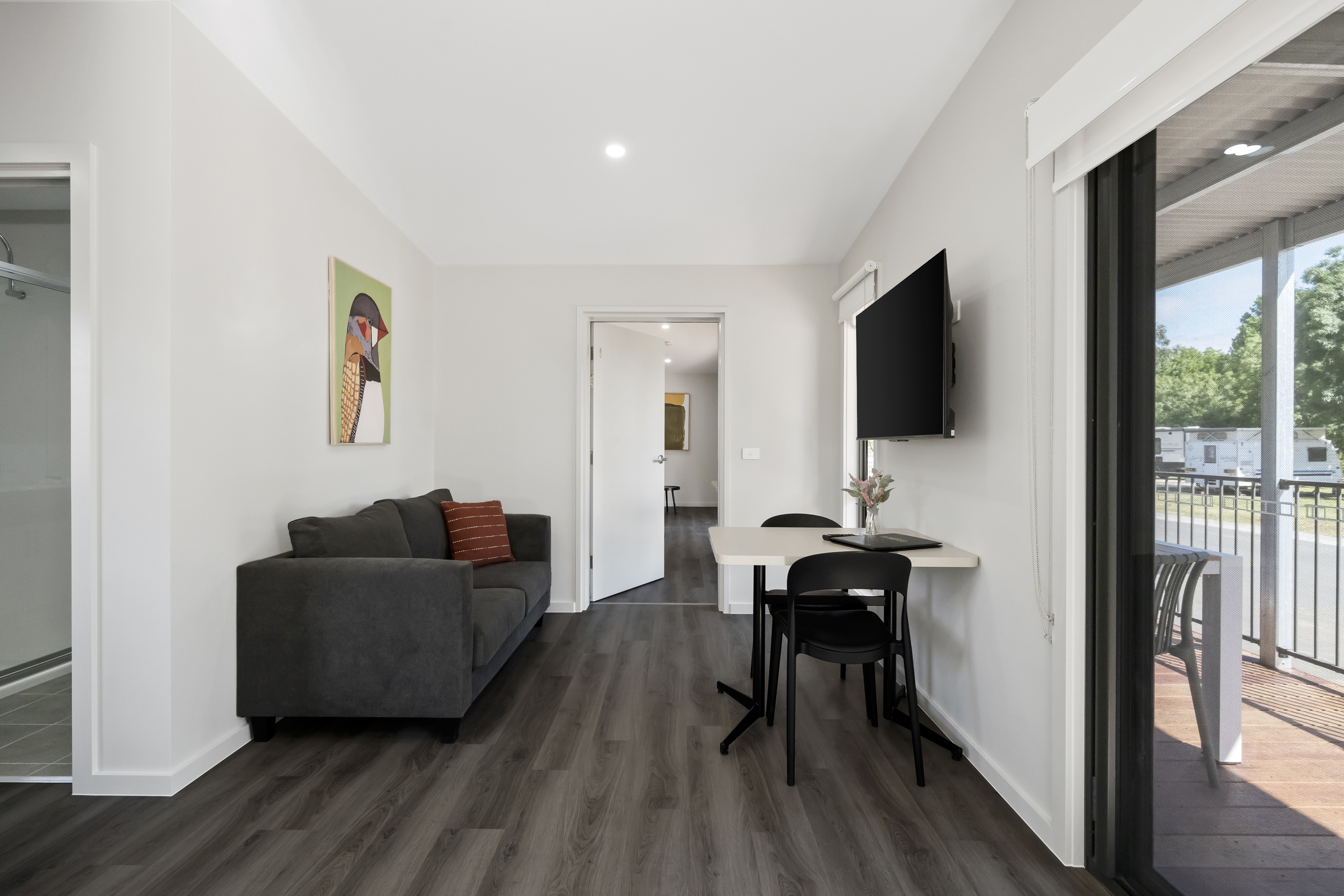 The two studios can be joined or separated by an adjoining door. The accessible studio features seamless entry via a concrete driveway and ramp, along with a spacious walk-in shower, seating, and grab rails to provide additional comfort and support. The second studio is similar in layout but does not include the accessible features of the main cabin, allowing family or friends to stay together while still enjoying their own private space.