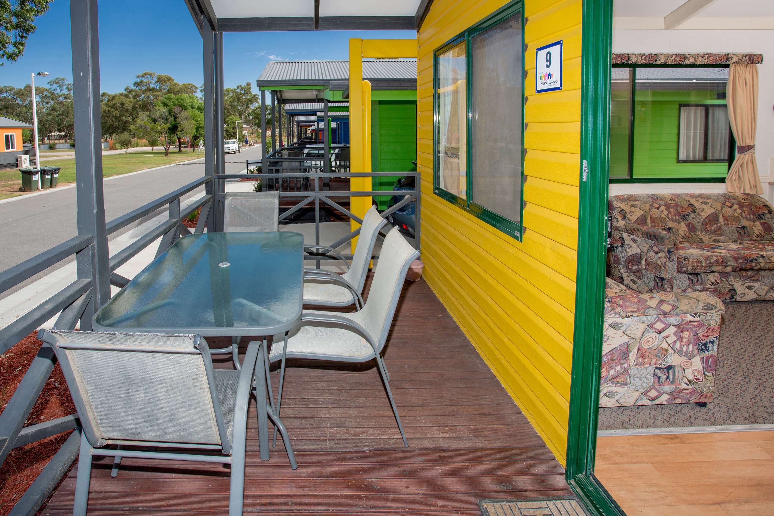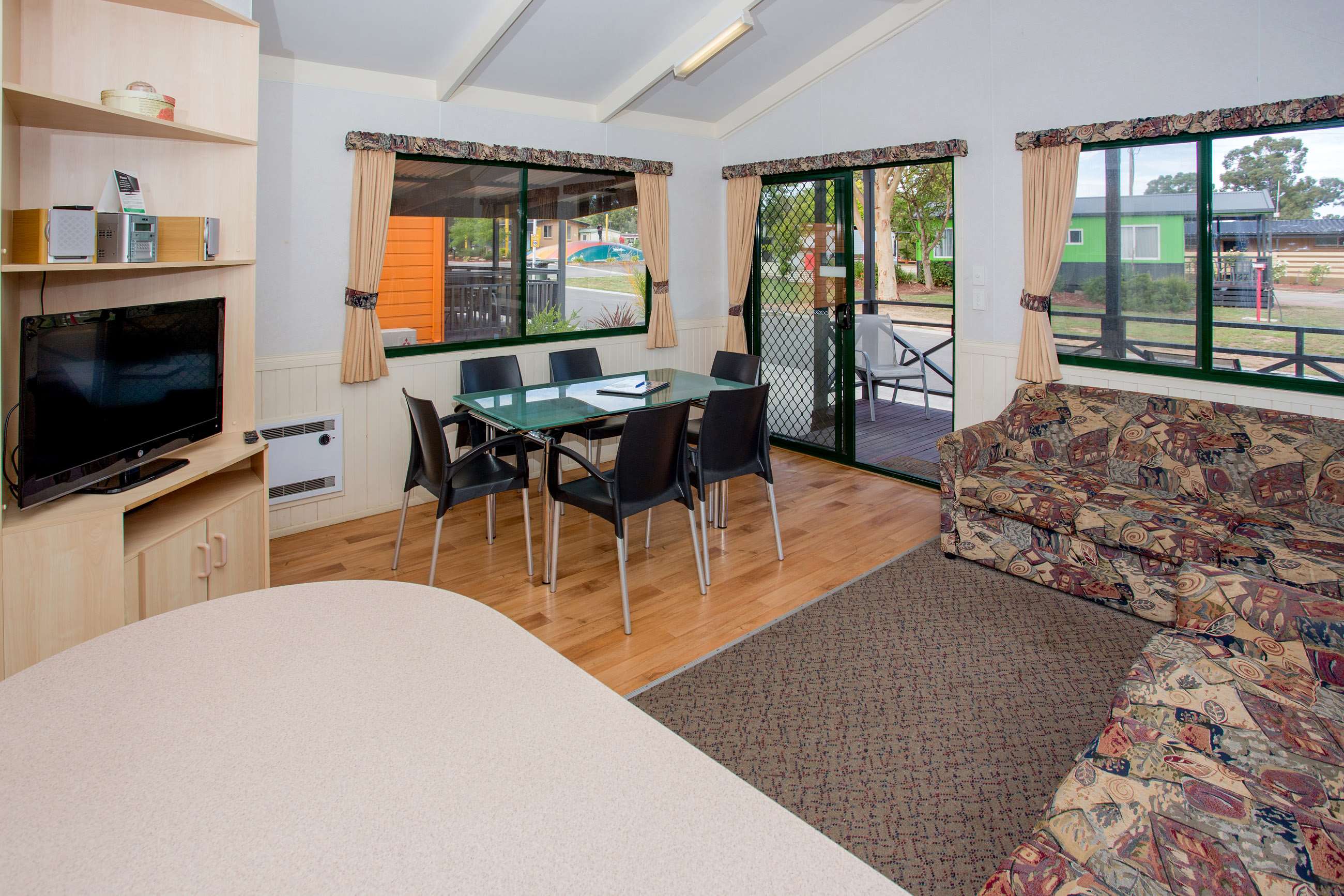 Standard Cabins are a great space to enjoy your holiday with the family. The functional space provides you with all your needs and sleeps 6 across 2 bedrooms with an open plan kitchen, living and dining space and verandah.