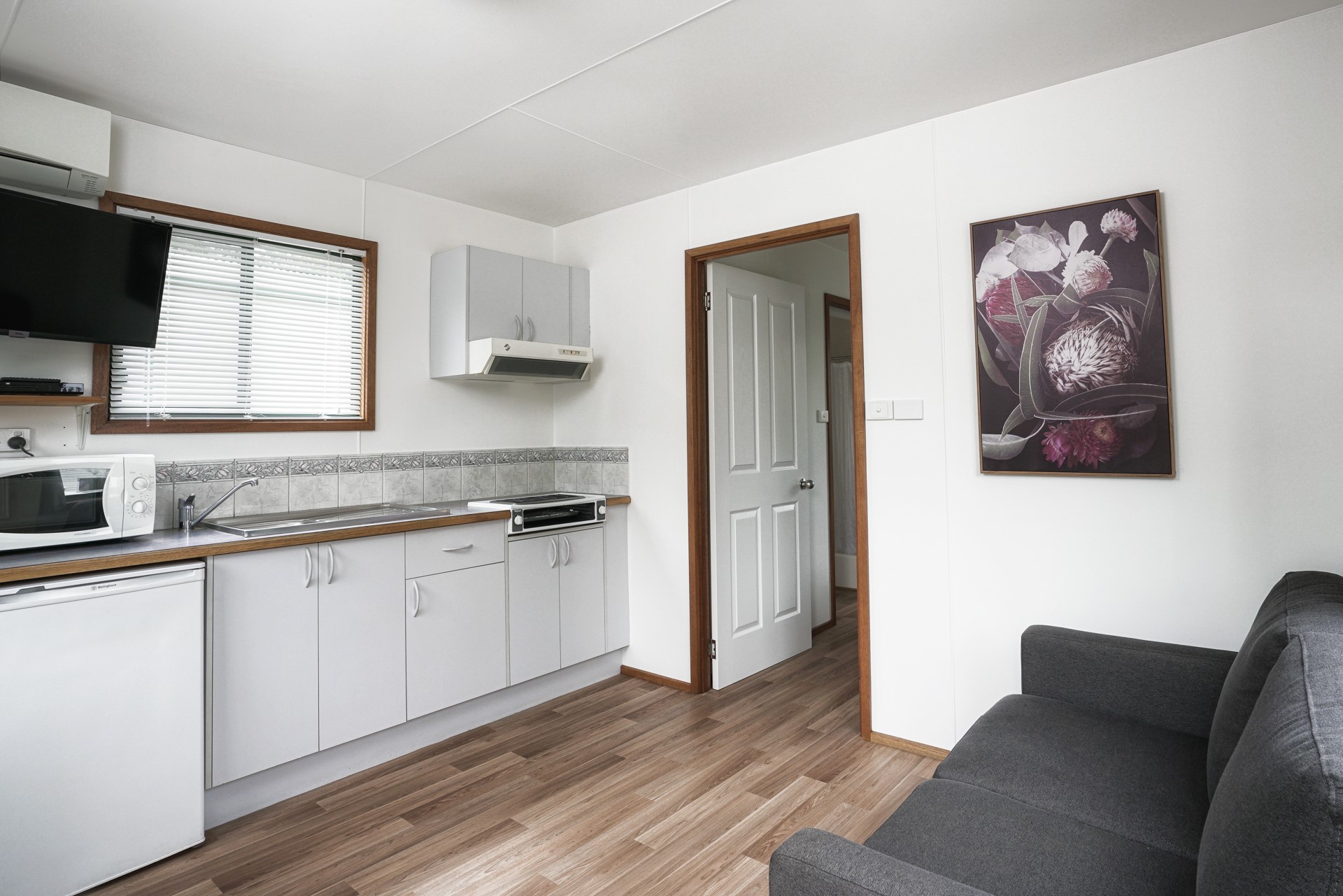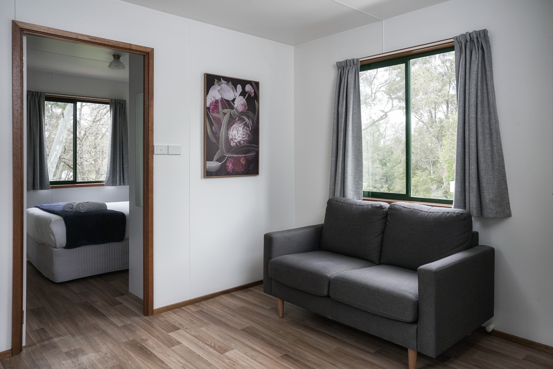 Our self-contained Double Studio accommodates one couple and are situated along the embankment alongside the Castlemaine Botanical Gardens. They have a main living area and a separate bedroom with a double bed. All linen and bedding are provided. There is also a small ensuite with shower over half bath, basin and toilet. The living area has a small kitchen with sink, stove top, microwave, small fridge/freezer, crockery/cutlery, dining table/chairs, lounge and TV/DVD. The cabin is air conditioned and has heating.