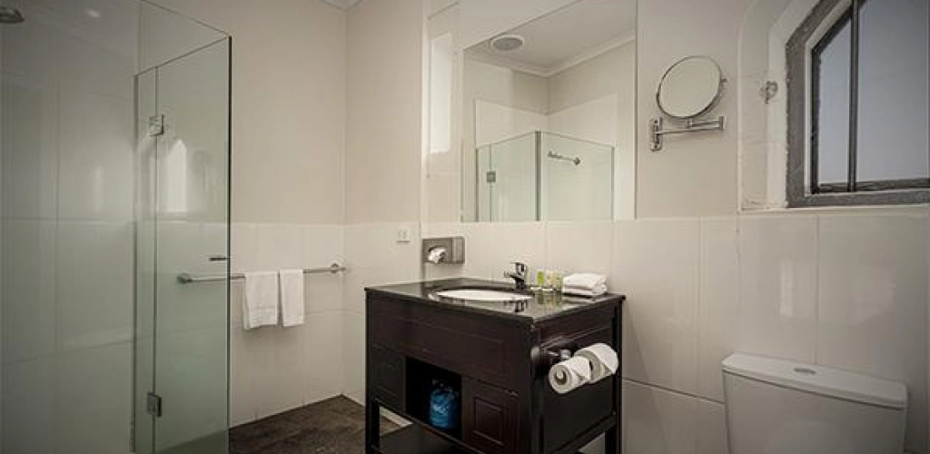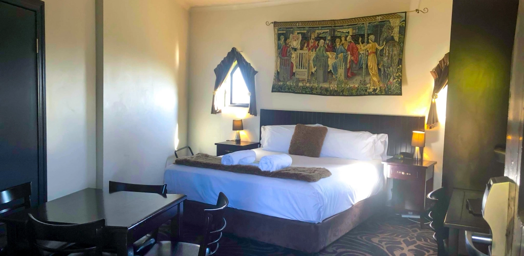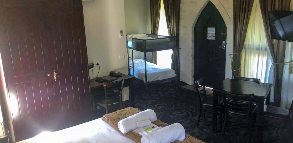 Our Family Rooms, nestled within the Castle walls, are perfect for those needing extra space. Each Room features a king bed and a triple bunk bed. Enjoy a 40" TV, free Wi-Fi, tea and coffee facilities, split system air-conditioning, fridge, microwave, toaster, hand-woven European tapestries, and an ensuite with a shower. Children under 3 stay free when sharing a bed with parents.