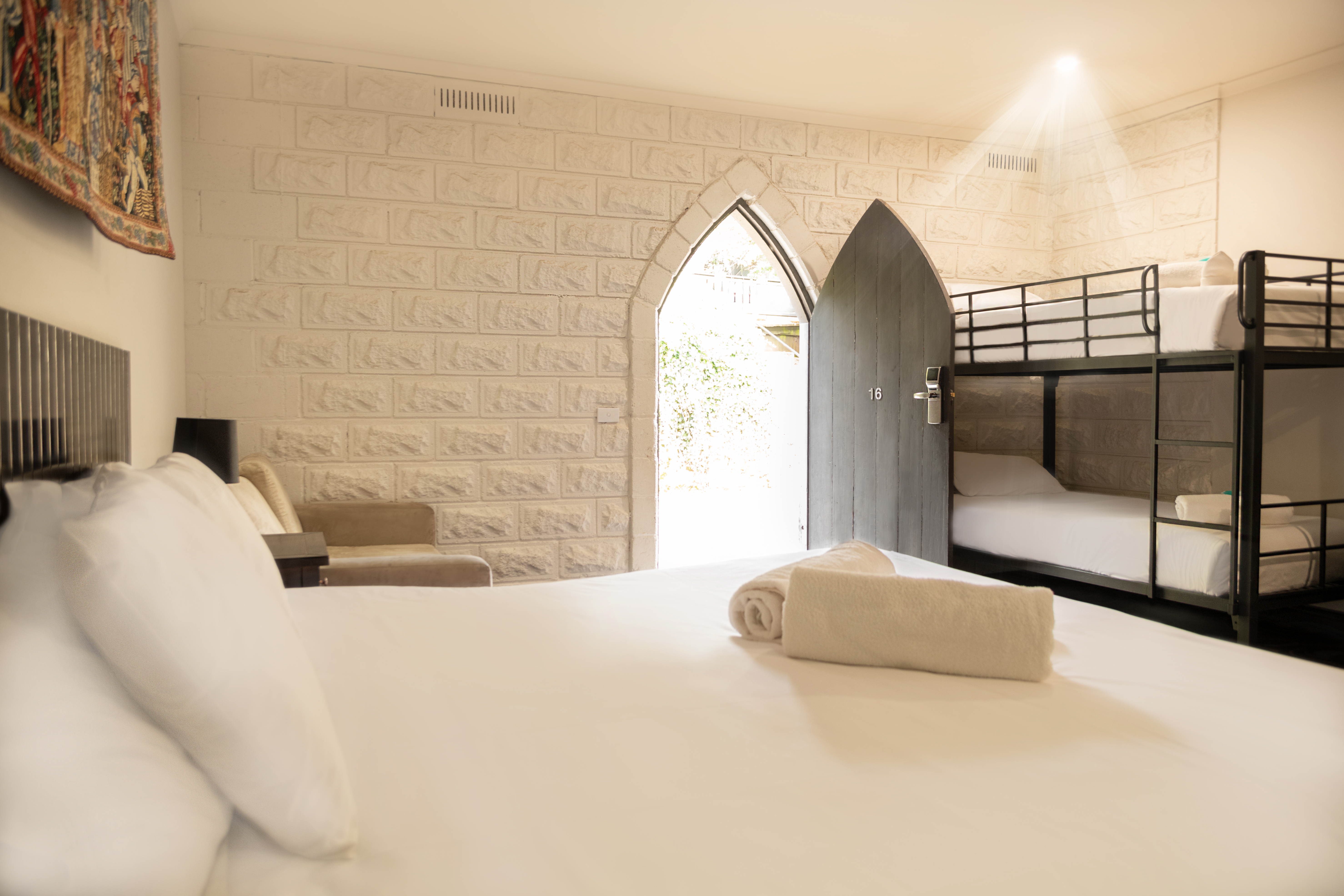 Our large Family Room sits inside the Castle walls and offers more space for your family. The Room features a king bed, a bunk bed, a king single, and a futon. Enjoy a 40" TV, free Wi-Fi, tea and coffee making facilities, split system air-conditioning, a fridge, microwave, toaster, handwoven European tapestries, and an ensuite with a shower. Kids under 4 stay free when sharing a bed with parents.
