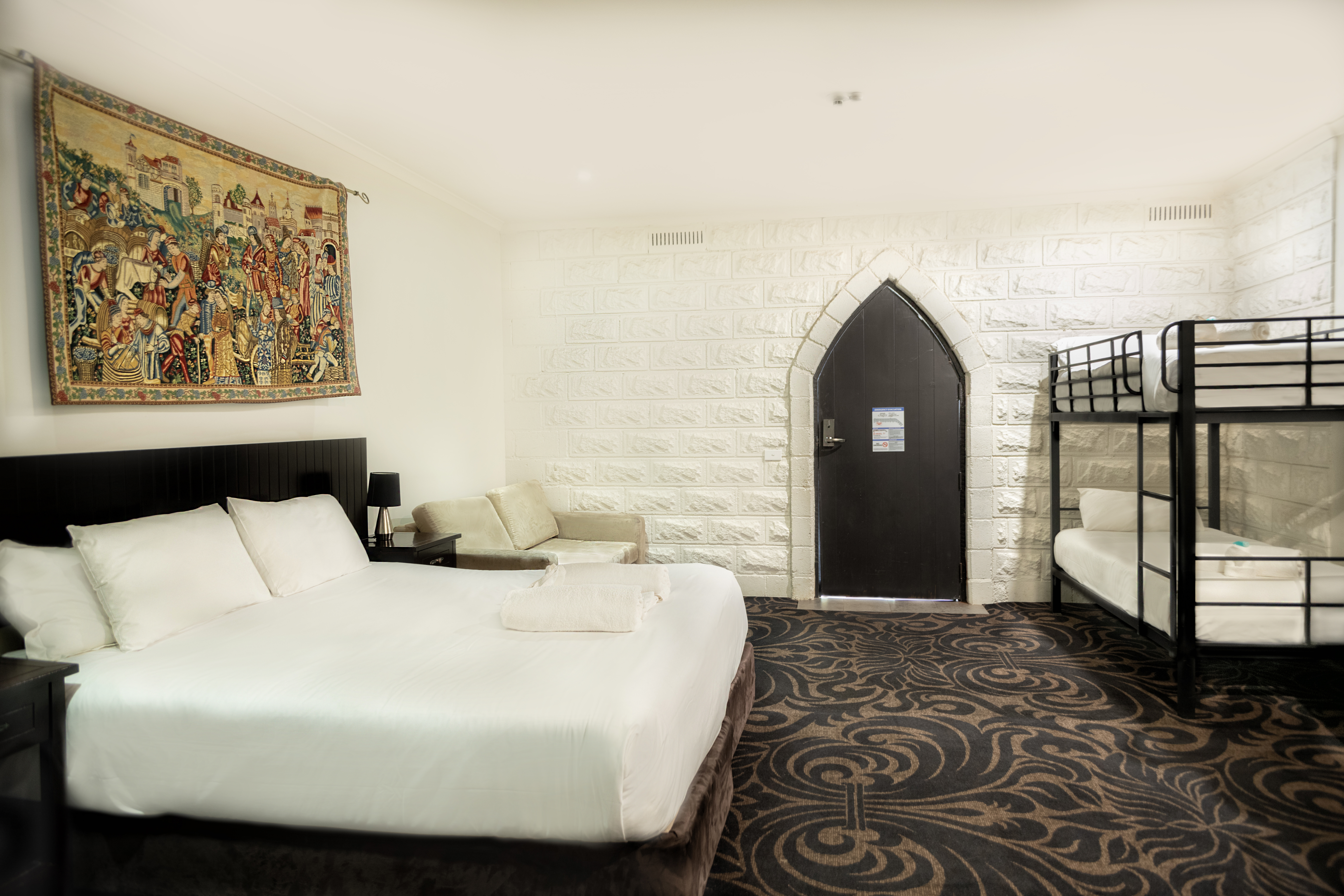 Our executive interconnecting King Rooms, located inside the Castle walls, offer fantastic king beds which are able to be split and a roll away or settee is available for a third person in each Room. The Rooms include a 40" TV, tea and coffee making facilities, split system air-conditioning, fridge, microwave, toaster, hand woven European Tapestries. The Rooms have a shower and an interconnecting door that you can close over if you need the privacy. Children under the age of 4 are free if sleeping in the same bed as parents.