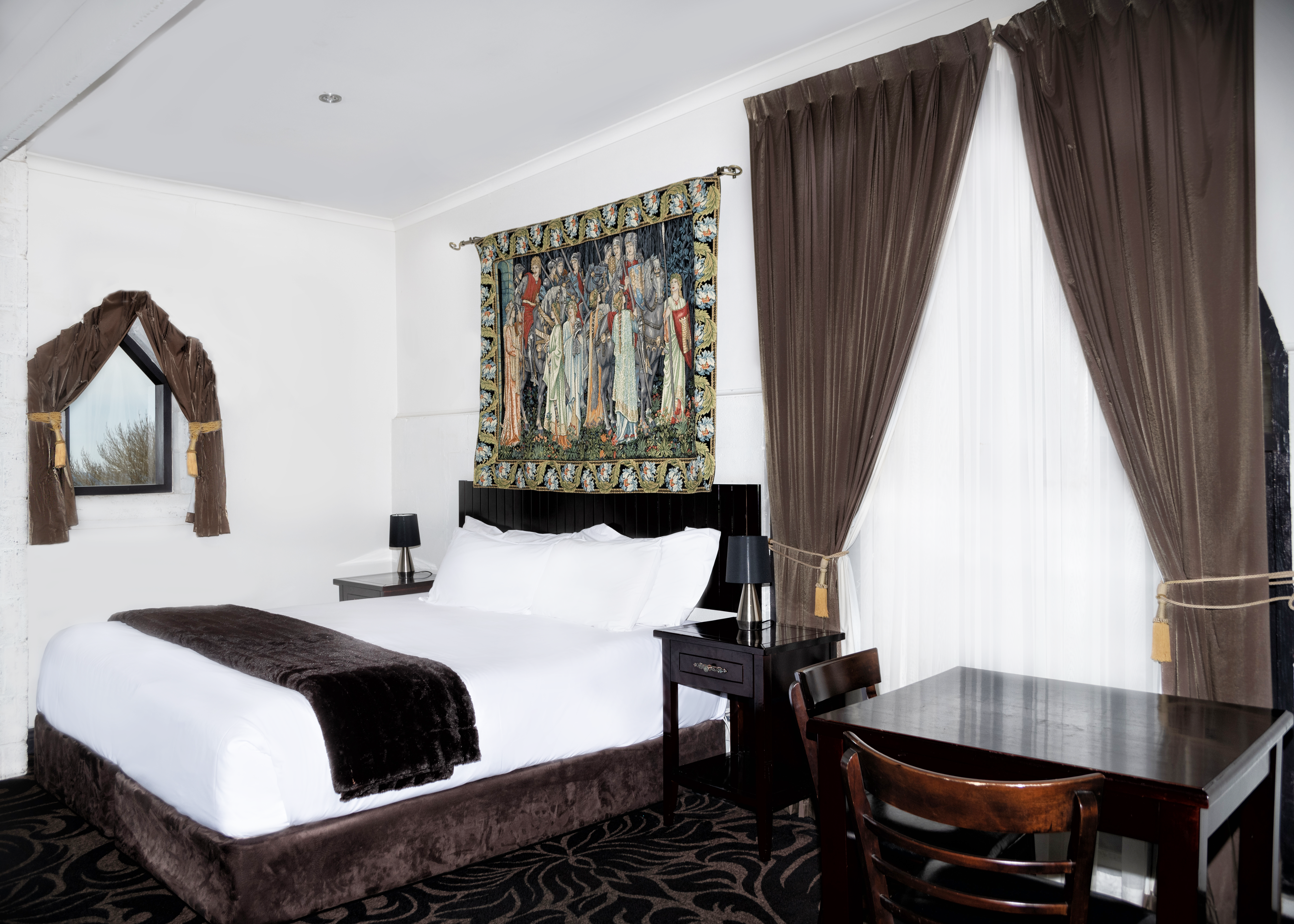 Our cosy Queen Castle Room is nestled within the Castle walls. It features a queen bed, split-system air-conditioner, TV, bar fridge, toaster, kettle, microwave, free Wi-Fi, and an ensuite with shower. Children under 3 stay for free when sharing a bed with parents.