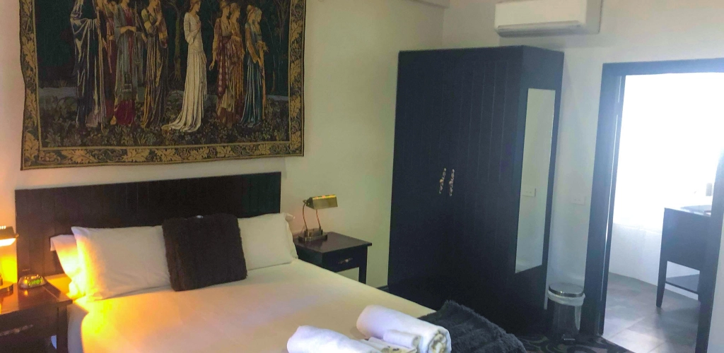 Our cosy Queen Room, nestled within the Castle walls, features a comfortable queen bed. It includes a 40" TV, tea and coffee making facilities, split system air-conditioning, fridge, microwave, toaster, hand-woven European tapestries, and an ensuite with a single spa bath. Children under 3 stay free when sharing a bed with parents.