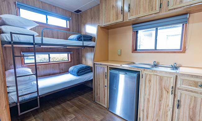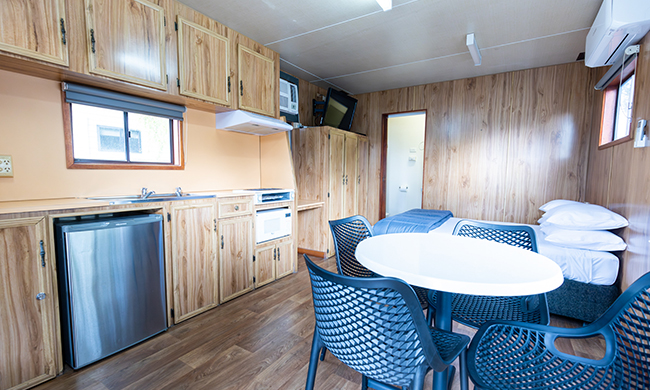 Centrally located within the park in close proximity to key park facilities. One double and single bunks. Open plan. Features air-conditioning; heating; full kitchen with stovetop, grill, microwave and bar fridge; dining table; TV and DVD; one bathroom.
