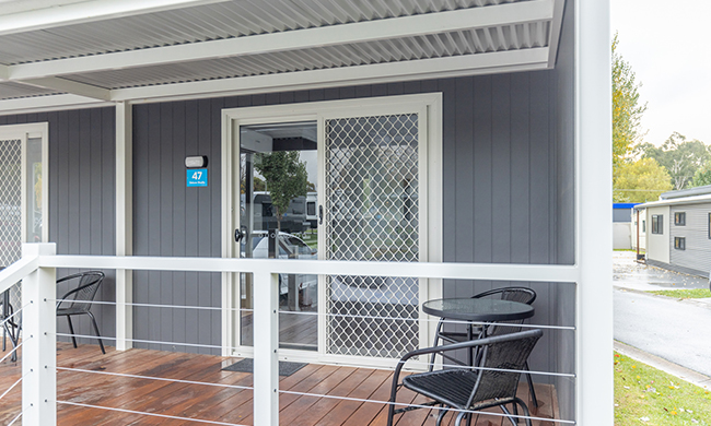 Centrally located within the park in close proximity to key park facilities. One queen bed. Open plan. Features air-conditioning and heating; kitchenette with bar fridge and microwave; bathroom; verandah with outdoor dining; indoor seating with TV; on-site parking.