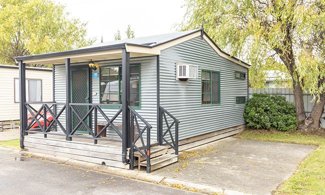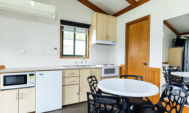 Centrally located within the park in close proximity to key park facilities. One queen and two single bunks. Features air-conditioning; heating; full kitchen with stovetop, microwave and bar fridge; lounge and dining table; TV and DVD; one bathroom; verandah.