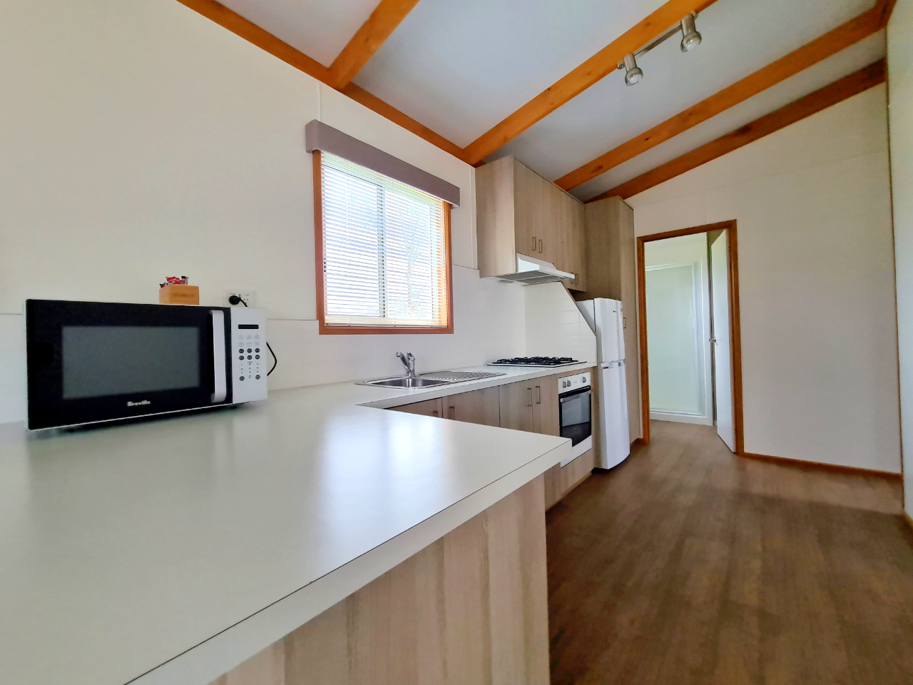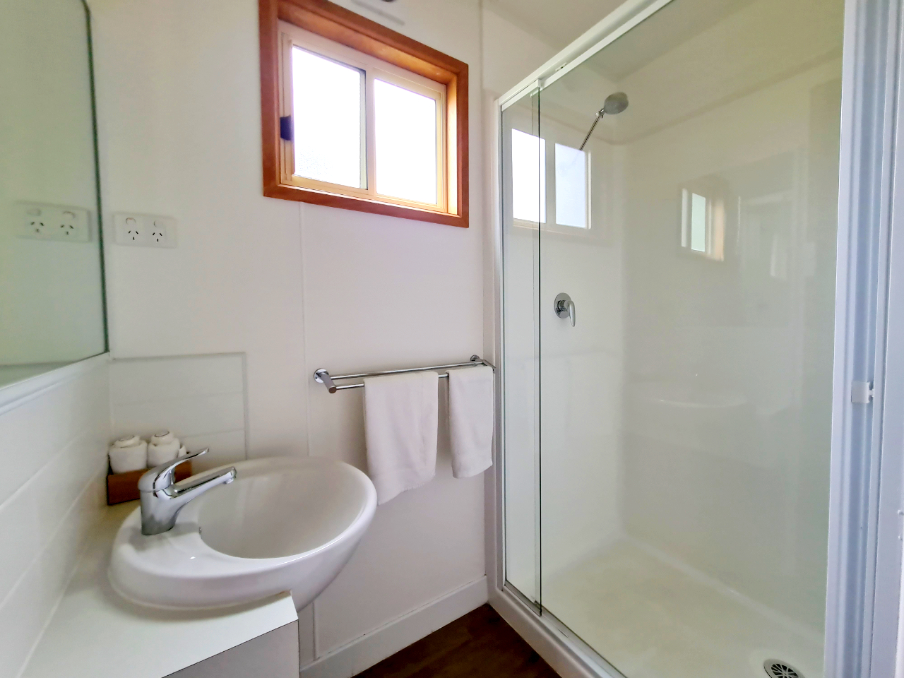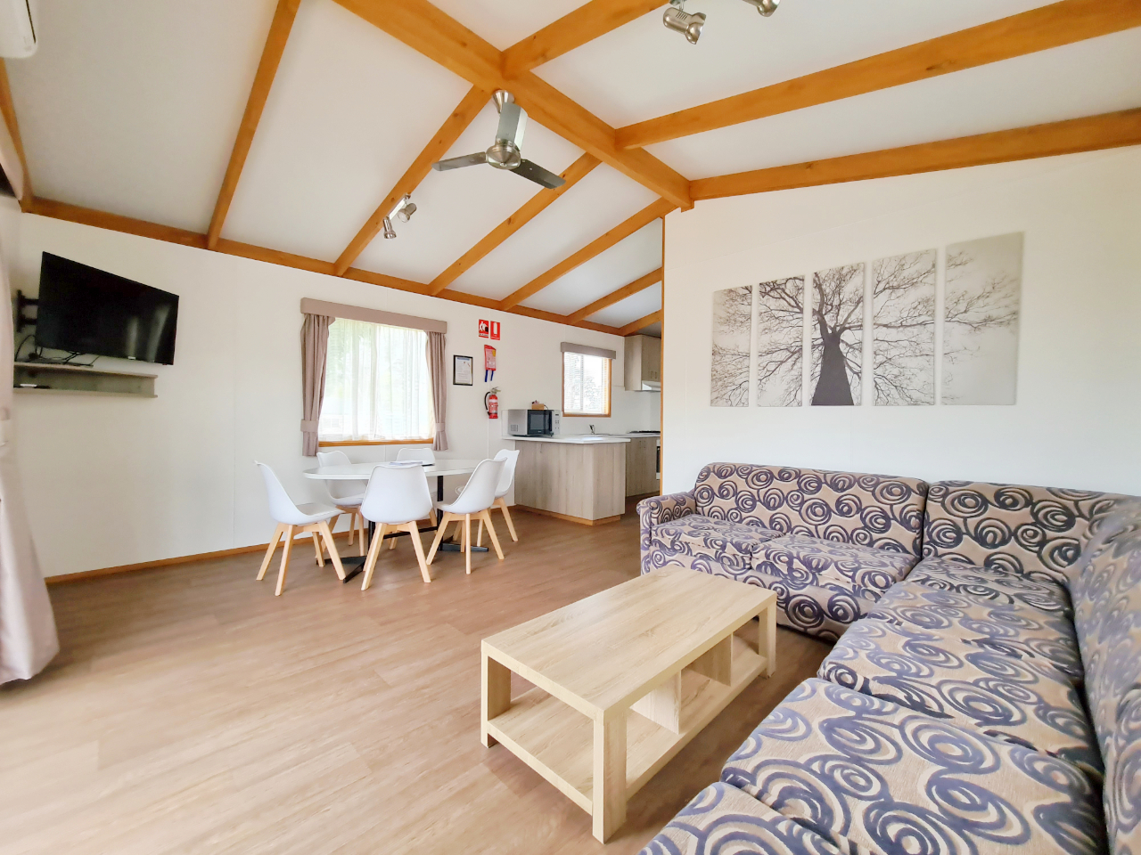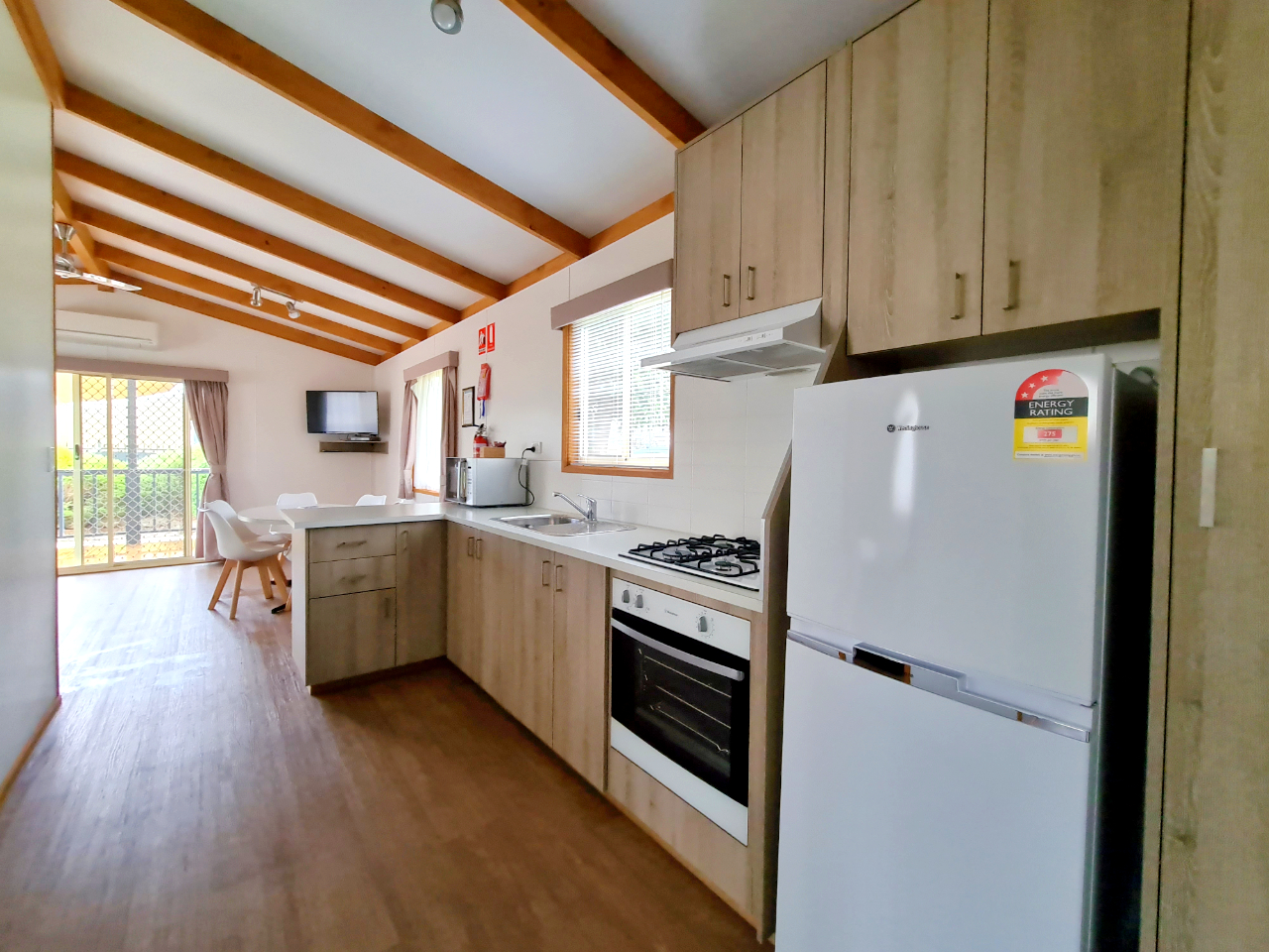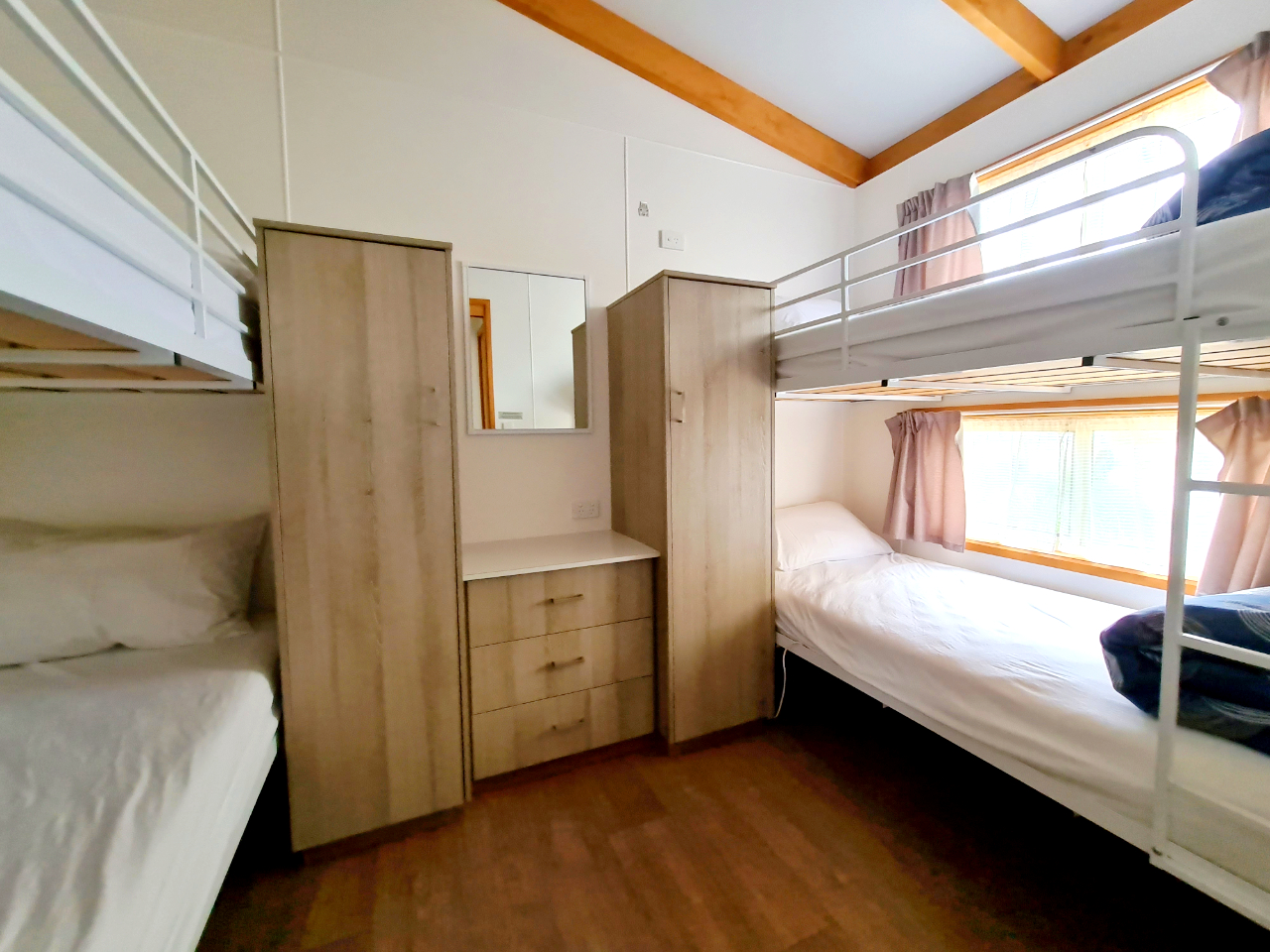 The 6 berth Silver unit is a large modern new two bedroom cabin designed to sleep a maximum of 6 people. The main bedroom has a queen bed, reading lights, robe space, clock radio, ceiling fan, TV. The second bedroom has two upper bunks and two lower bunks, robe space and a wall fan. The queen bed and all the bunks have linen provided, towels and soap. All bunks have inner spring mattresses. The top bunks do not have electric blankets, the queen and bottom bunks do.