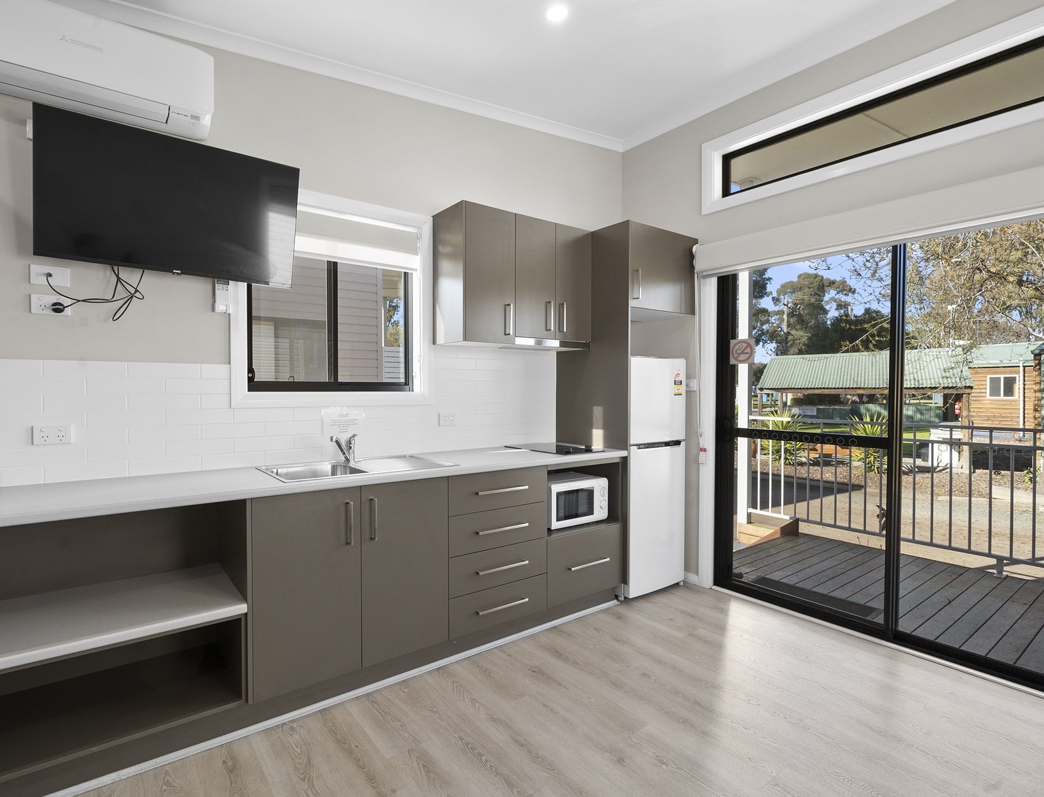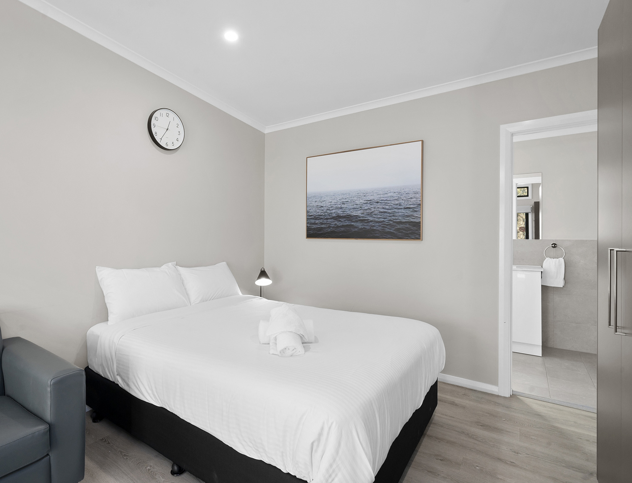 Ideal for couples or solo travellers, this modern studio sleeps two and features a queen bed, reverse cycle air conditioning, and a private ensuite.