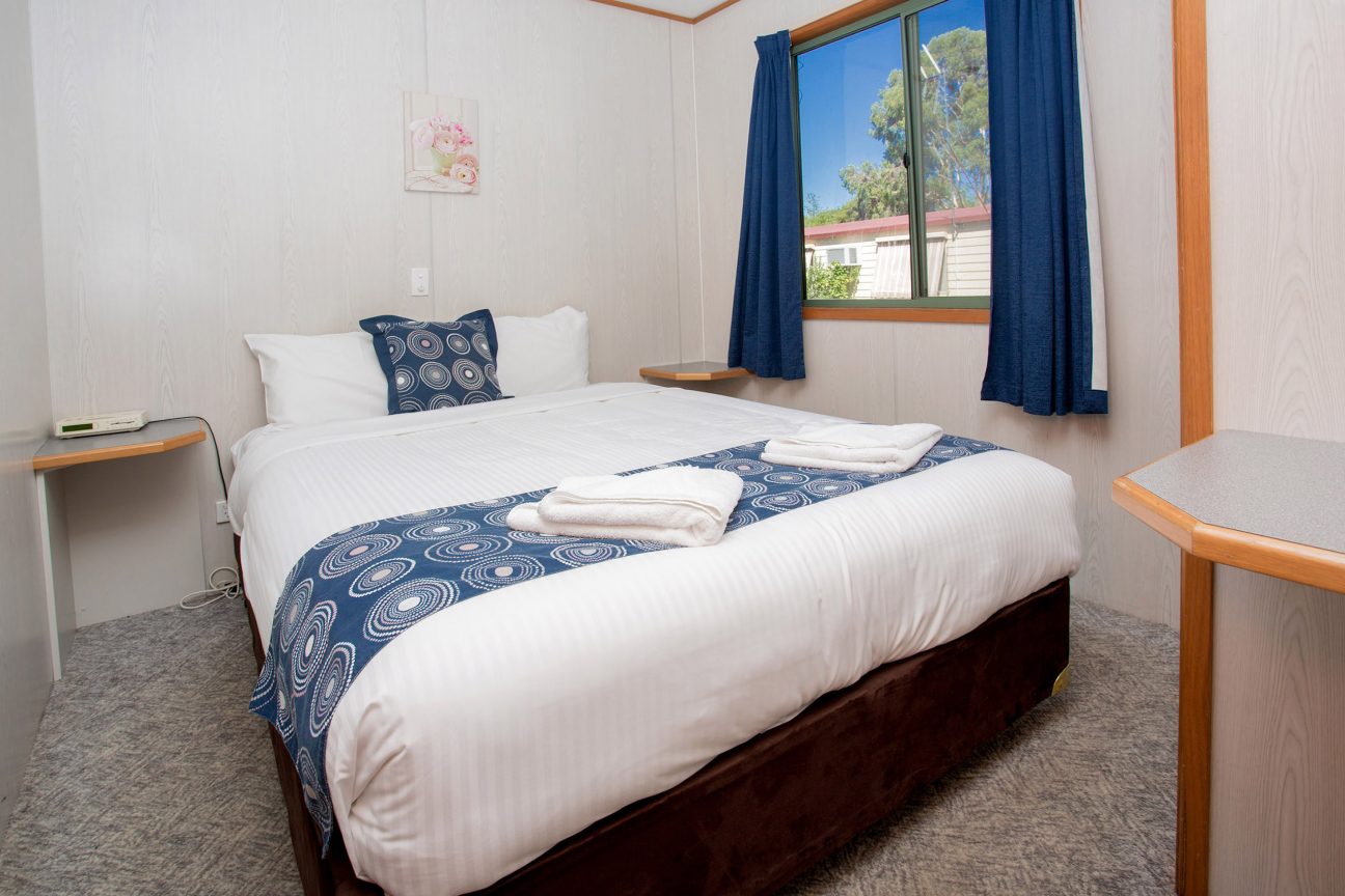 This spacious two-bedroom cabin accommodates up to five guests with a queen bed and tri-bunk, and offers modern comforts such as reverse cycle air conditioning, a TV, and a fully equipped kitchenette with a microwave, cooktop, and full-size fridge.