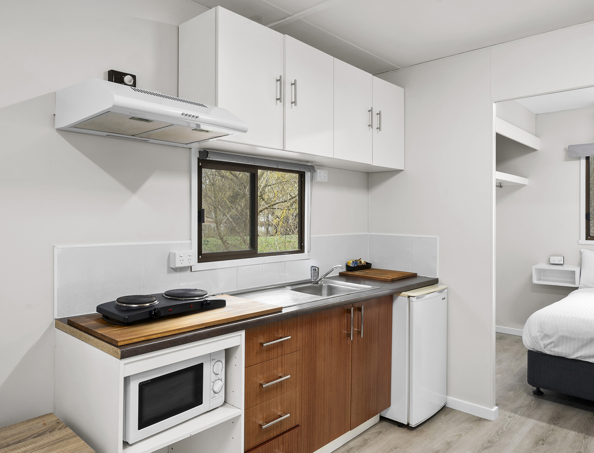 Enjoy a kitchenette with electric cooktop, microwave, and bar fridge, along with reverse cycle air conditioning and a TV for added convenience.