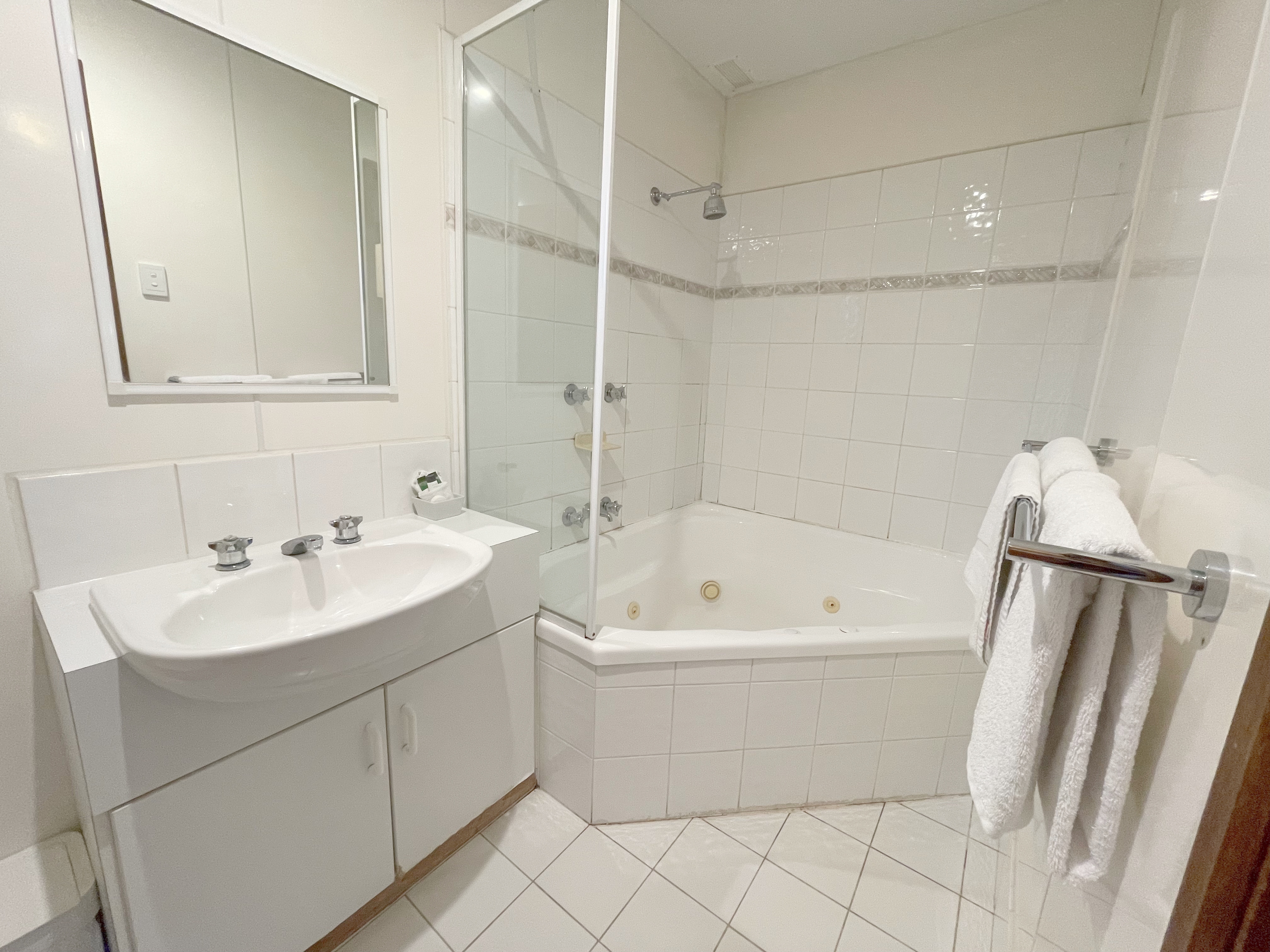 The open-plan cabin has a self-contained kitchen including a fridge, microwave, stovetop and plenty of crockery and cutlery with a dining area, and a TV in the living area. The bathroom in the villa includes a spa bath, shower, toilet and vanity. The cabin is air-conditioned for your comfort.
