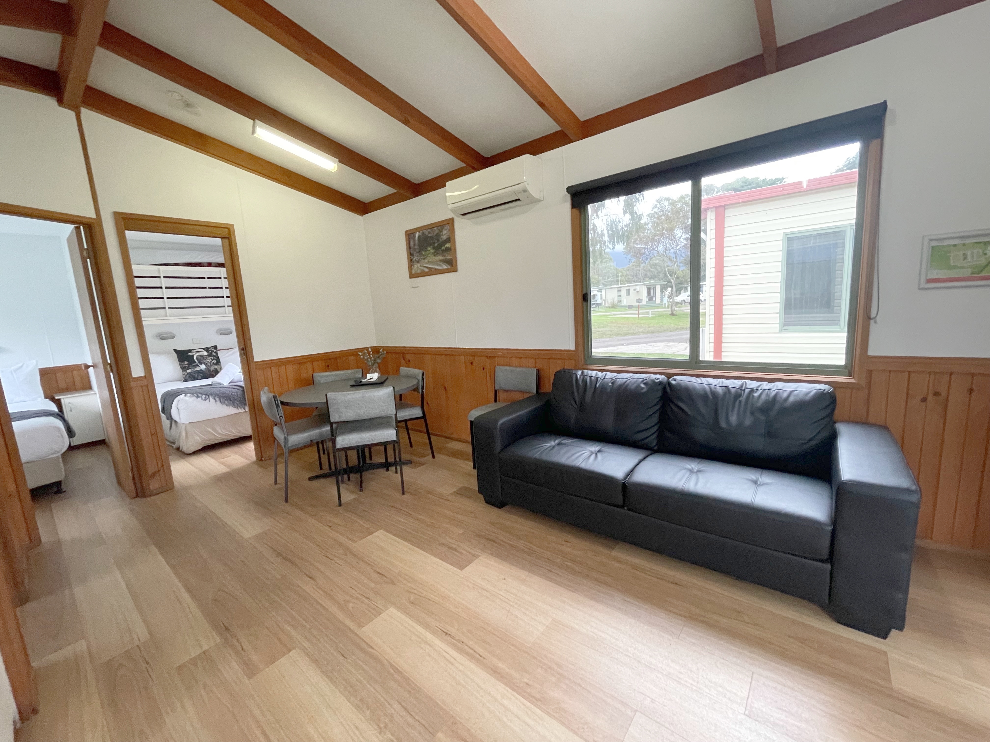 The open-plan cabin has a self-contained kitchen including a fridge, microwave, stovetop and plenty of crockery and cutlery with a dining area, and a TV in the living area. The bathroom in the cabin includes a shower, toilet and vanity. The cabin is air-conditioned for your comfort.