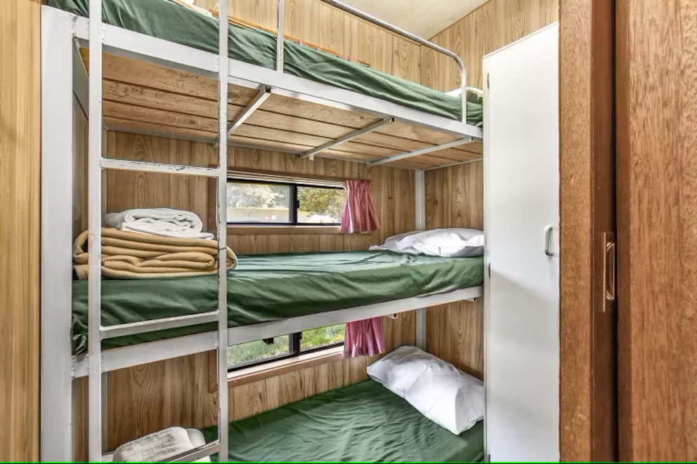 This cabin offers a double bed in the main bedroom and a kid-sized tri-bunk in the second bedroom. Please note the tri-bunks are most appropriate for children.