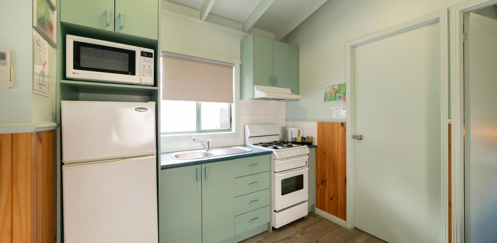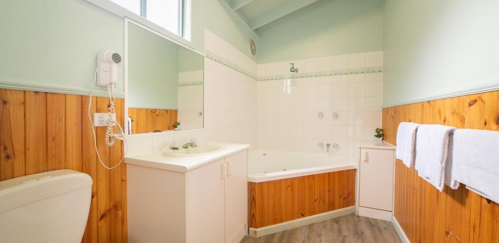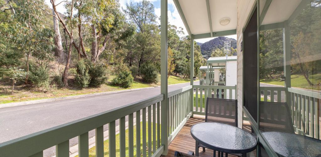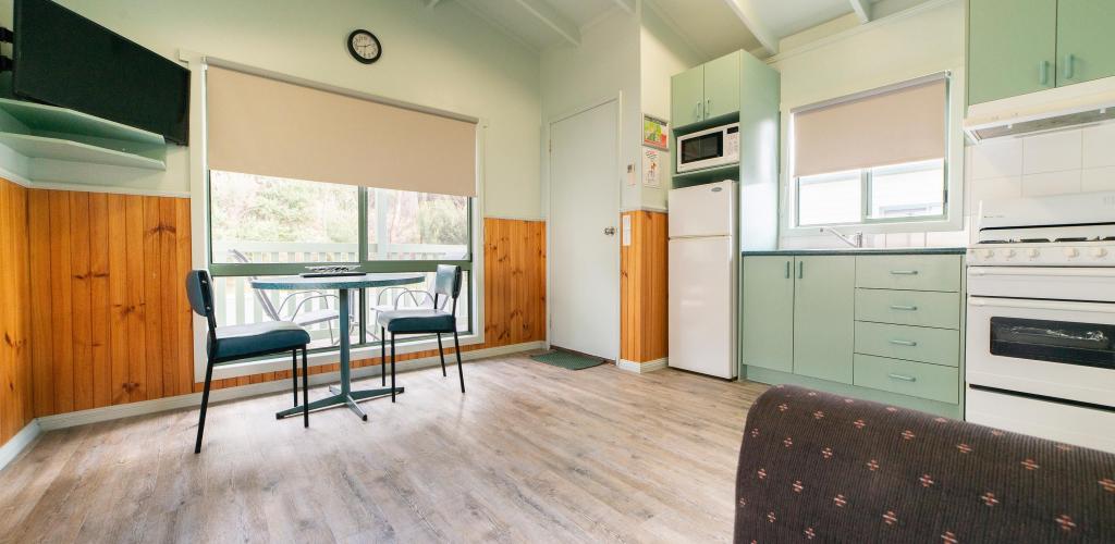The open-plan cabin has a self-contained kitchen including a fridge, microwave, stovetop and plenty of crockery and cutlery with a dining area, and a TV in the living area. The bathroom in the cabin includes a spa bath, shower, toilet and vanity. The cabin is air-conditioned for your comfort.