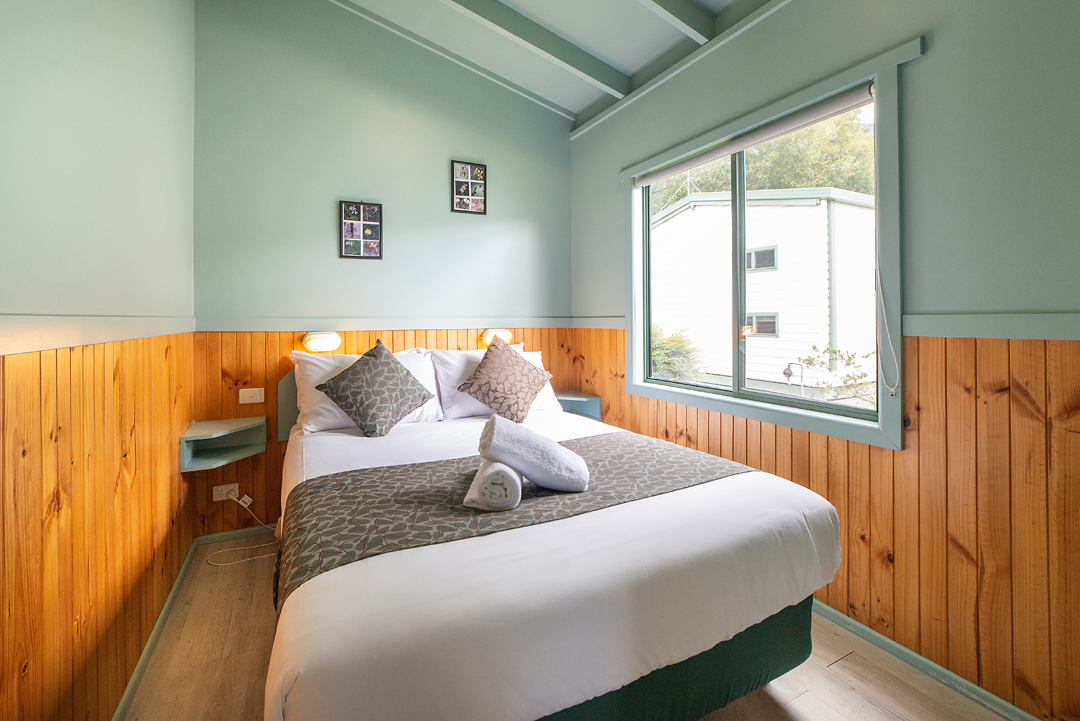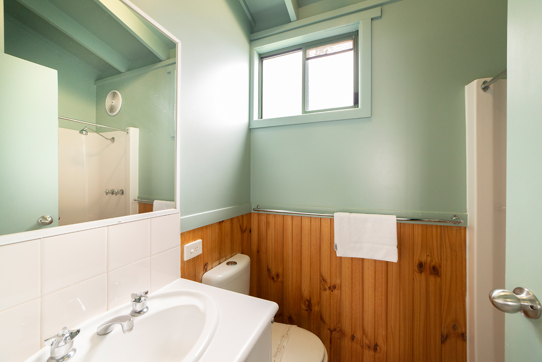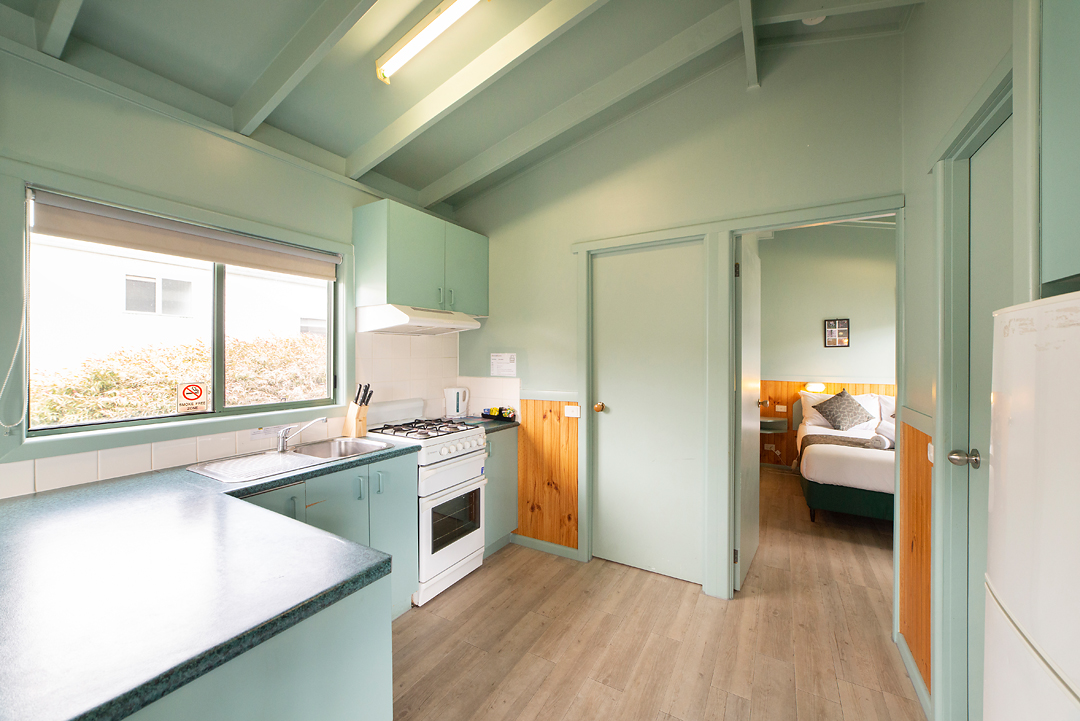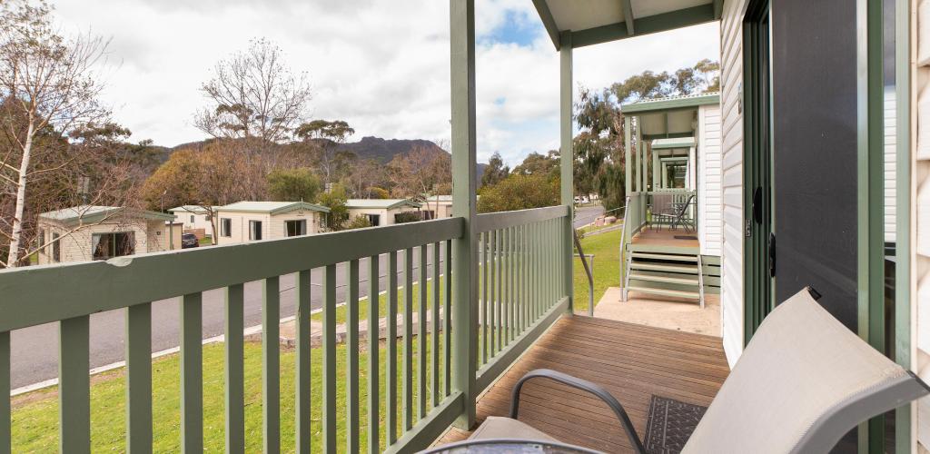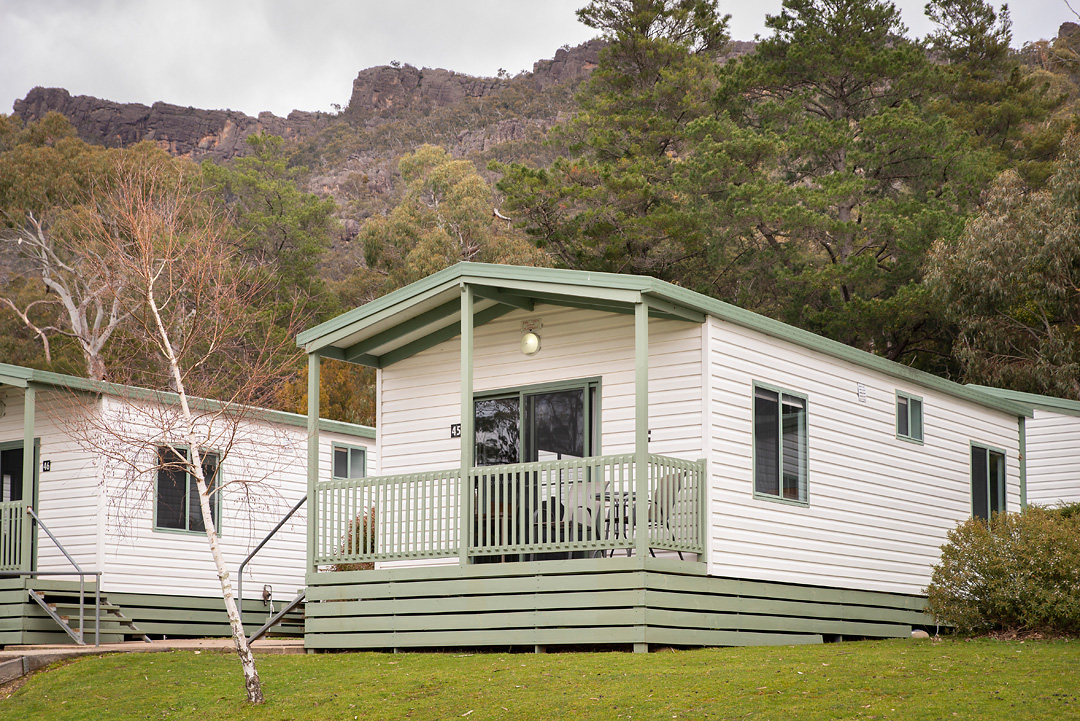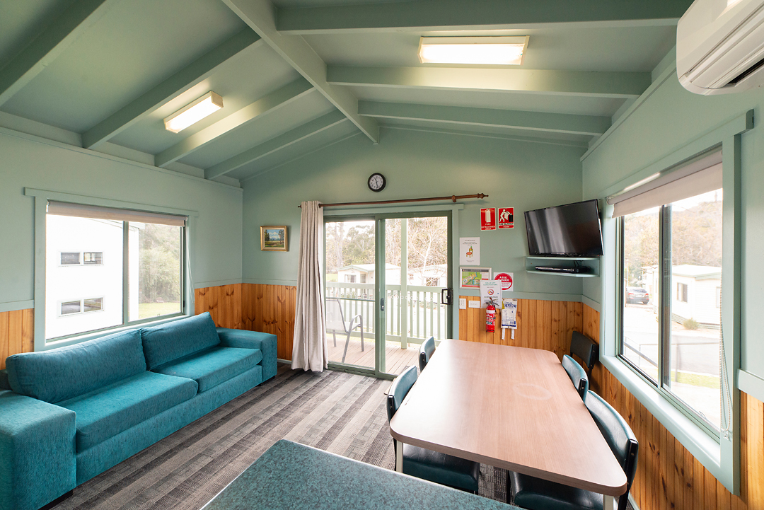 The open-plan cabin has a self-contained kitchen including an oven, fridge, microwave, stovetop and plenty of crockery and cutlery with a dining area, and a TV in the living area. The bathroom in the cabin includes a shower, toilet and vanity. The cabin is air-conditioned for your comfort.