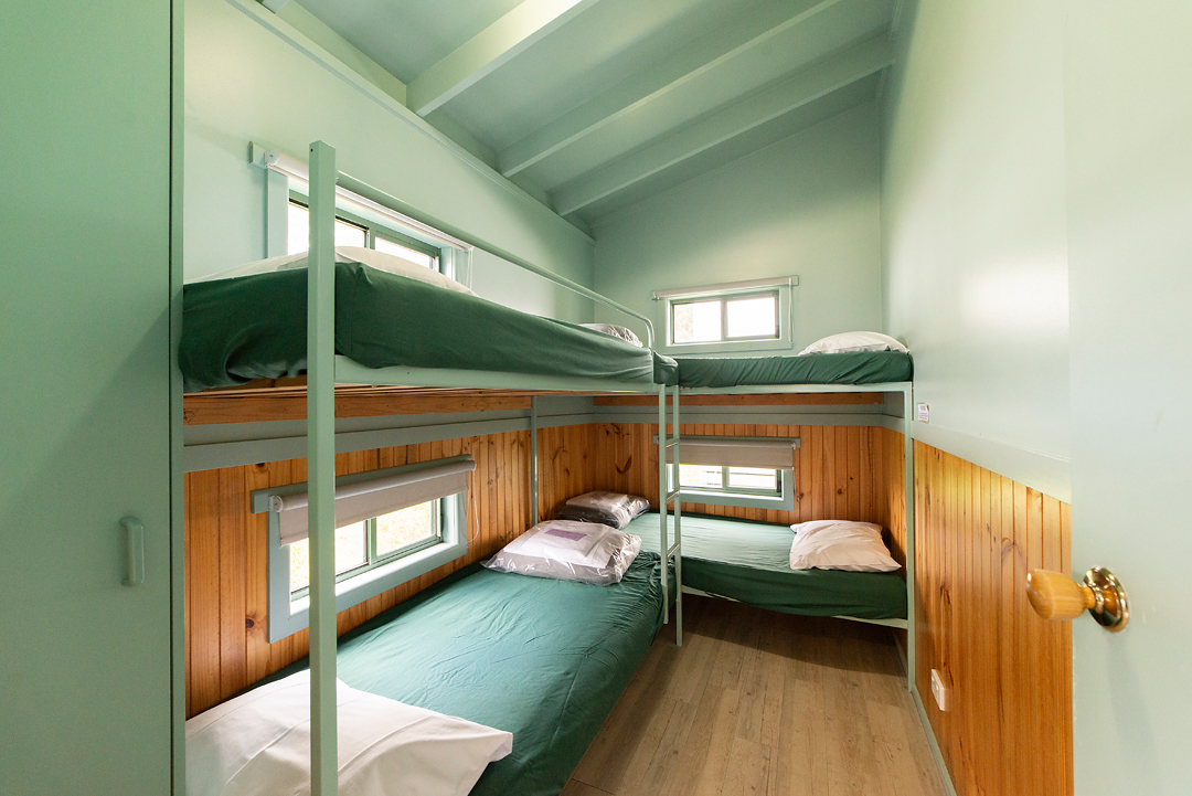 This cabin offers a double bed in the main bedroom and two sets of bunk beds in the second bedroom.