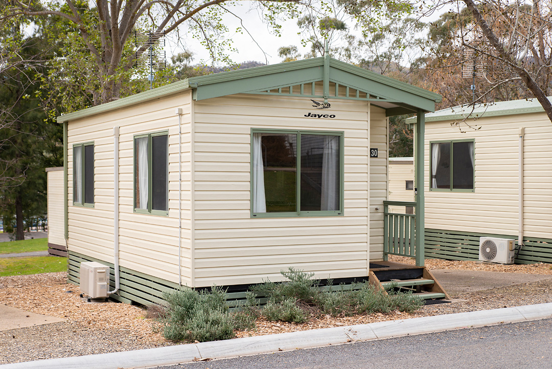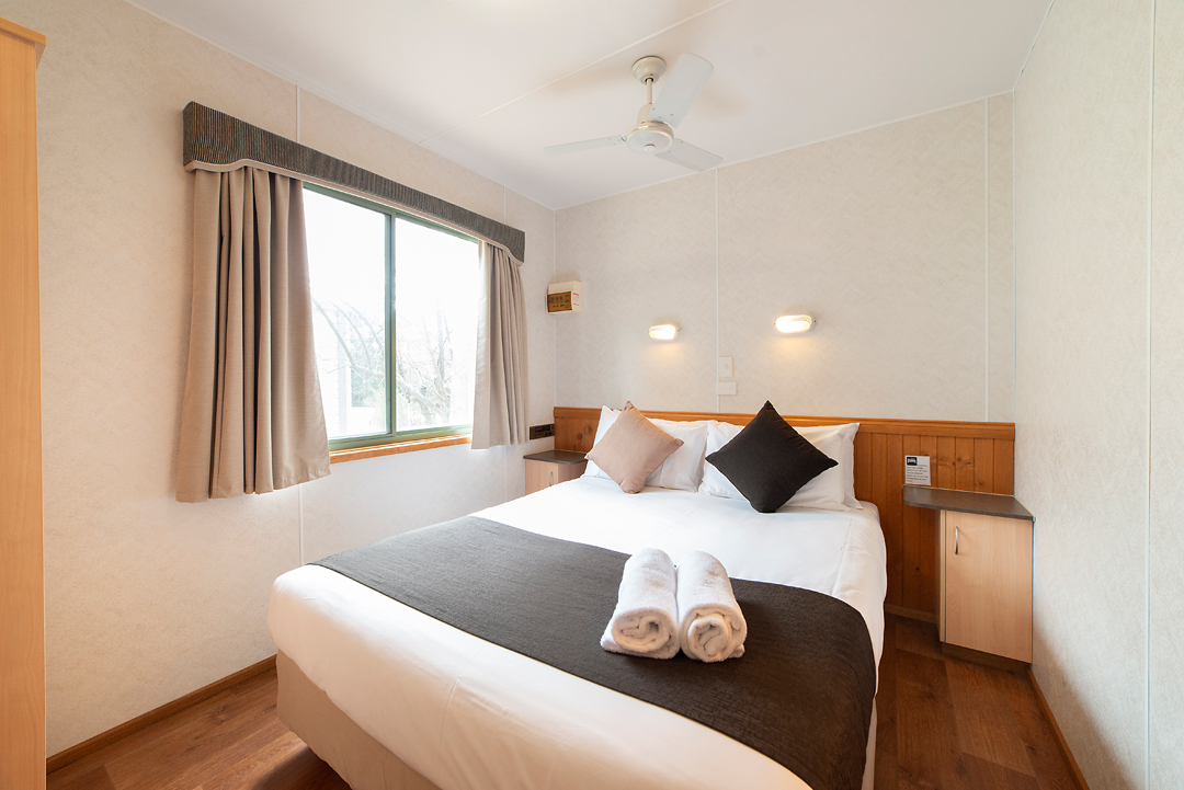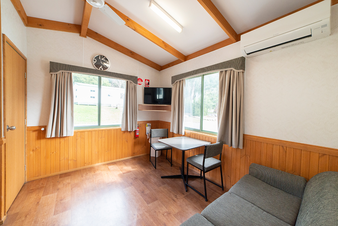 The open-plan cabin has a self-contained kitchen including a fridge, microwave, stovetop and plenty of crockery and cutlery with a dining area, and a TV in the living area. The bathroom in the cabin includes a shower, toilet and vanity. The cabin is air-conditioned for your comfort.