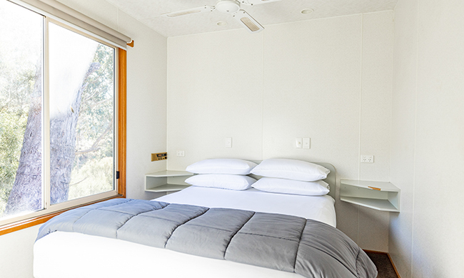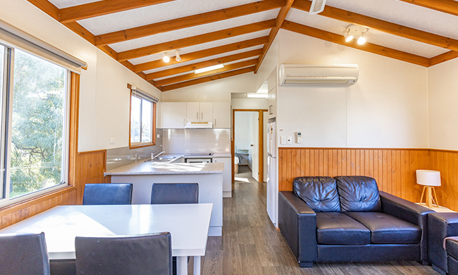 Large two bedroom cabin with glimpses of the mountain ranges and set nearby to barbecue facilities. One queen and two single bunks. Featuring air-conditioning; full kitchen with microwave stovetop and fridge; bathroom; dining and lounge area; TV; large veranda with outdoor seating perfect for relaxing or entertaining.