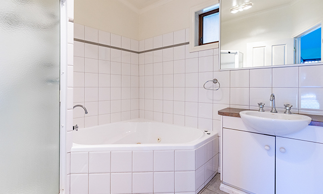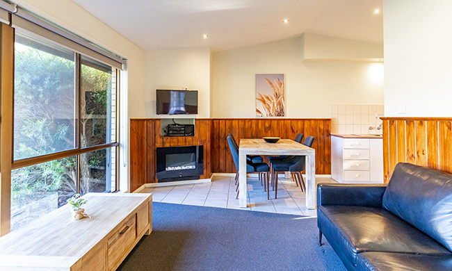 Spacious cabin featuring a corner spa bath. Two bedrooms with two queens. Featuring air-conditioning; kitchenette with coffee making facilities; bathroom with spa bath; dining and lounge area; TV.