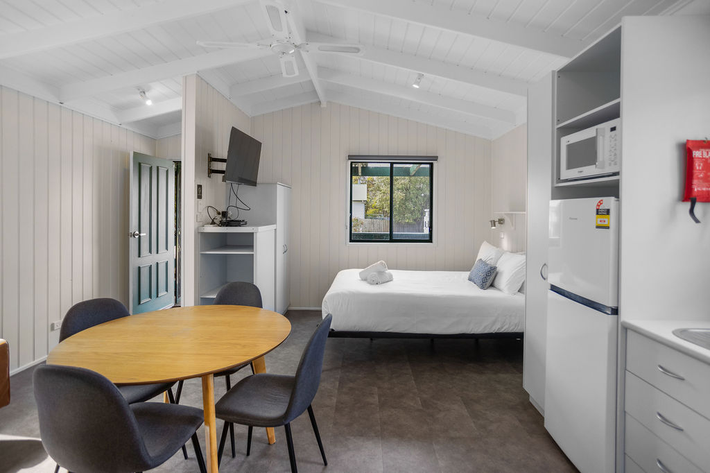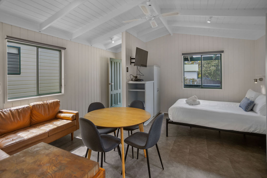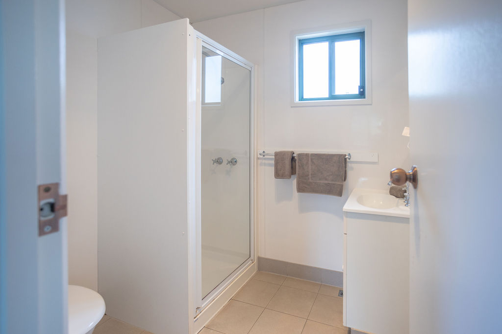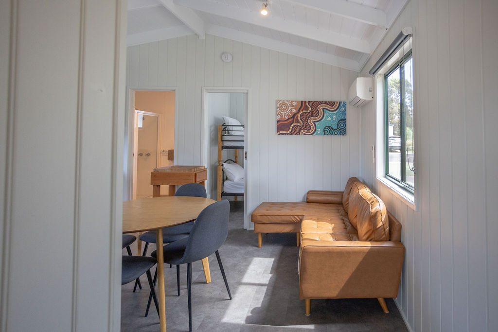 This self-contained cabin features rich wood panelling, has a queen-sized bed in the main living area plus a separate bunk room sleeping up to 2 people. A comfortable living area with dining table, couch and TV, plus reverse cycle air conditioning leads through to your private bathroom.