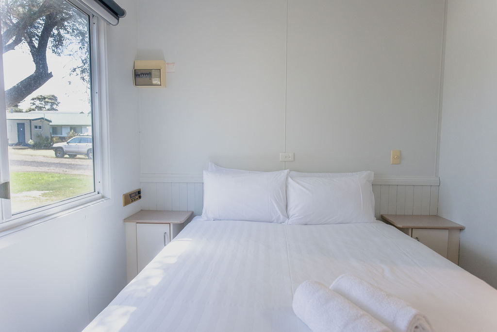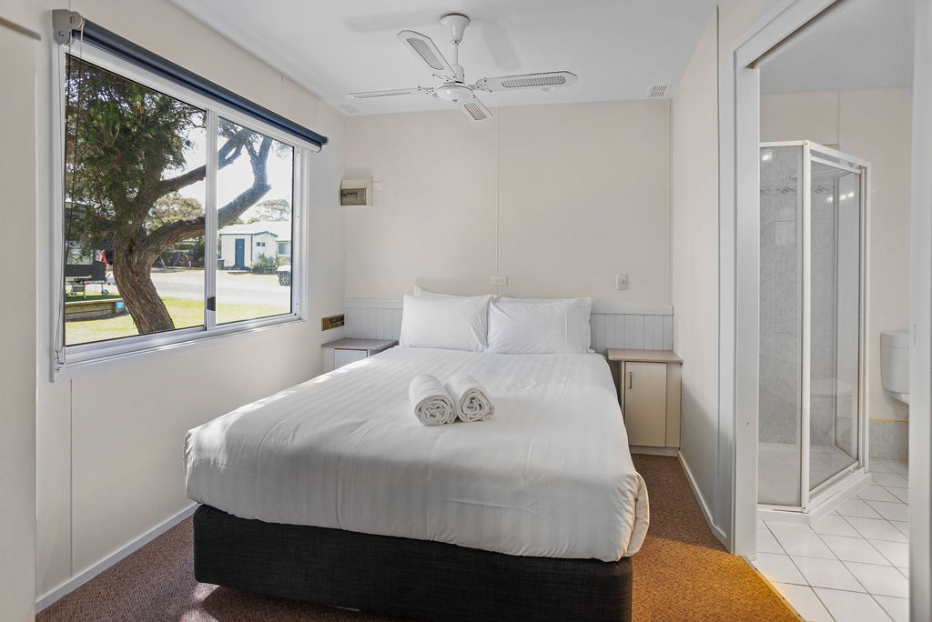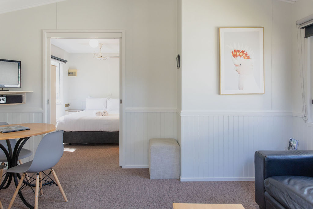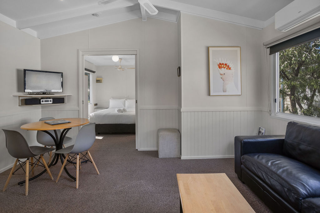 These one-bedroom cabins each have a fully equipped kitchen and comfortable living area with dining table, couch and TV plus, reverse cycle air conditioning. The main bedrooms feature a queen-sized bed.