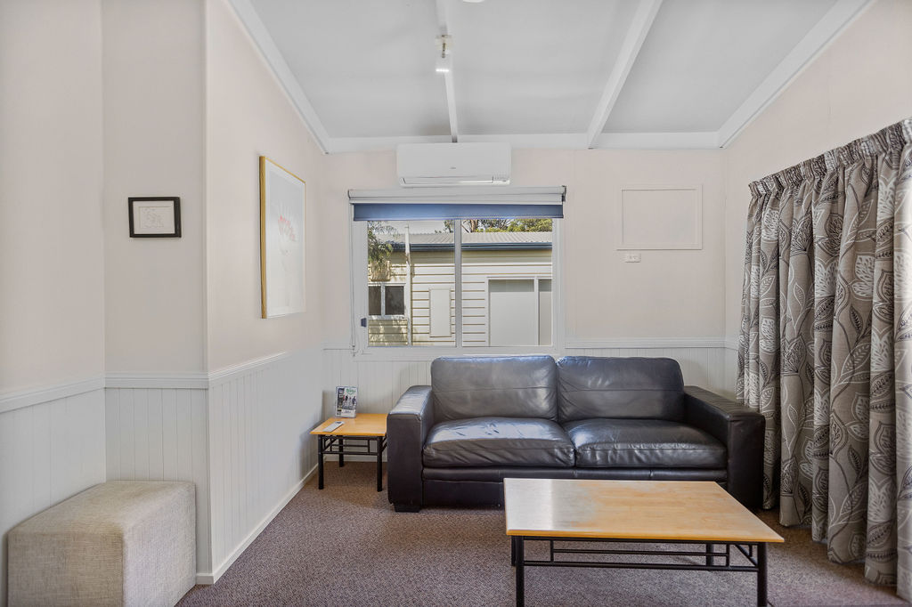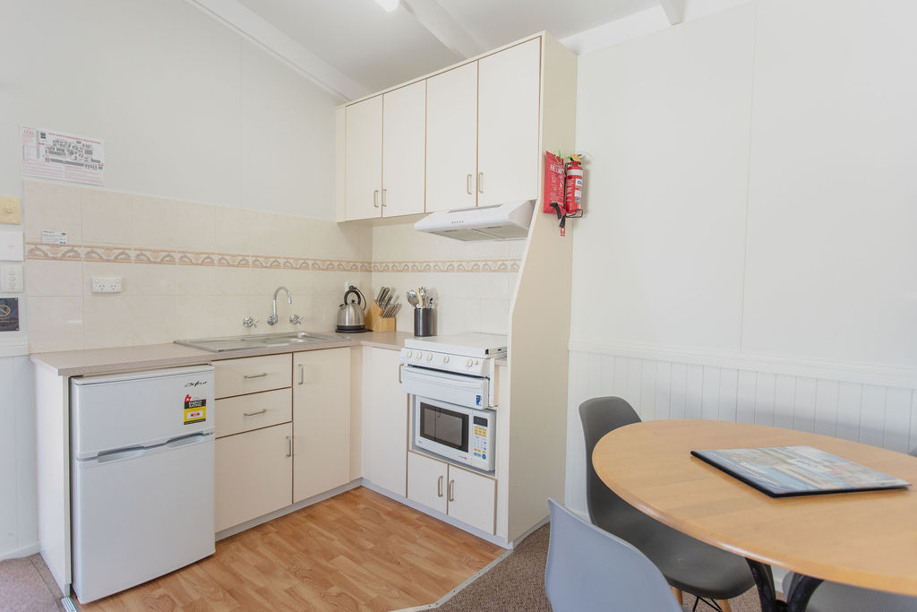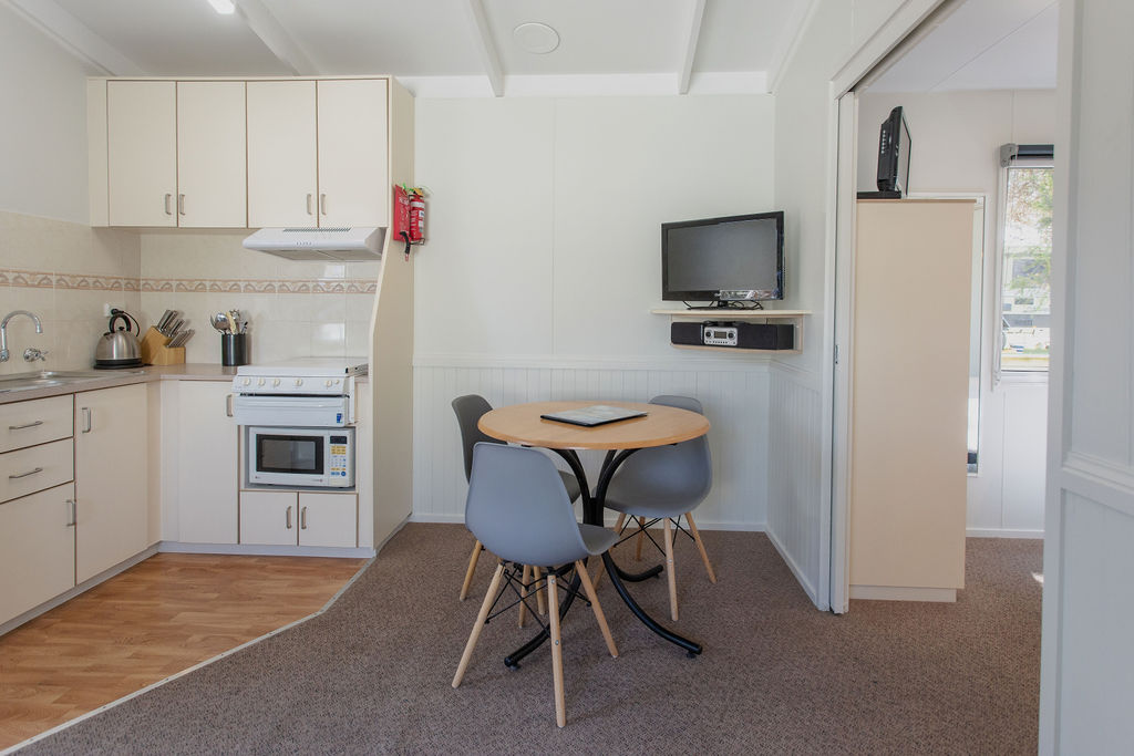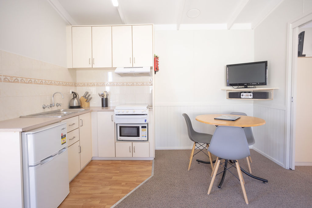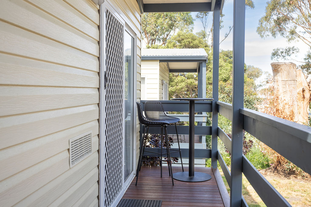 These one-bedroom cabins each have a fully equipped kitchen and comfortable living area with dining table, couch and TV plus, reverse cycle air conditioning. The main bedrooms feature a queen-sized bed.
