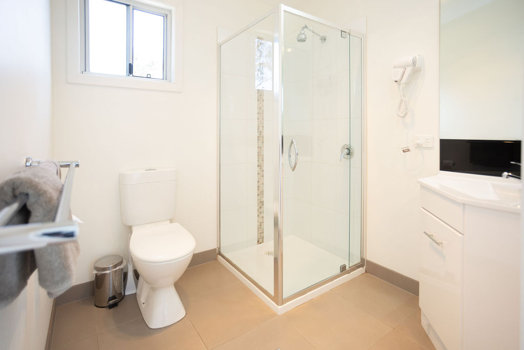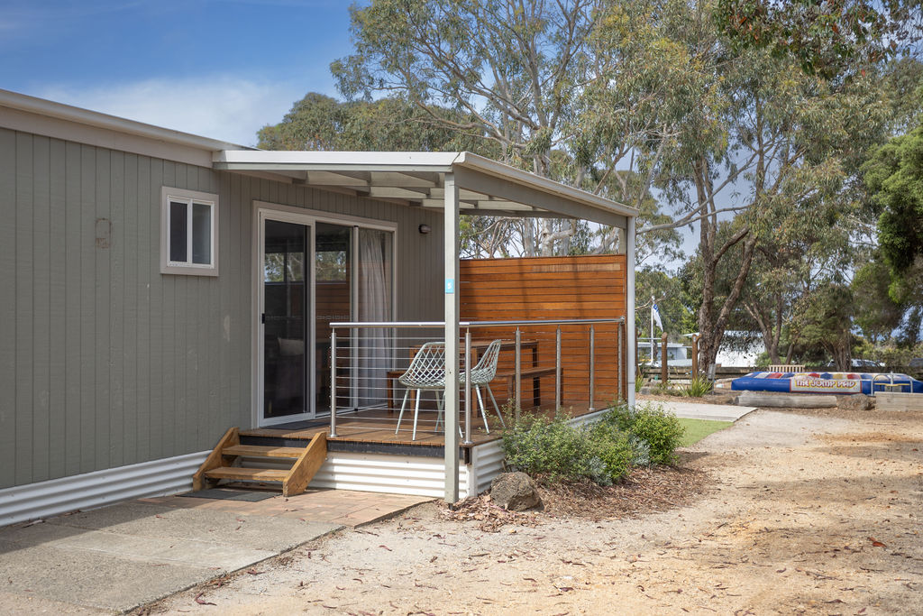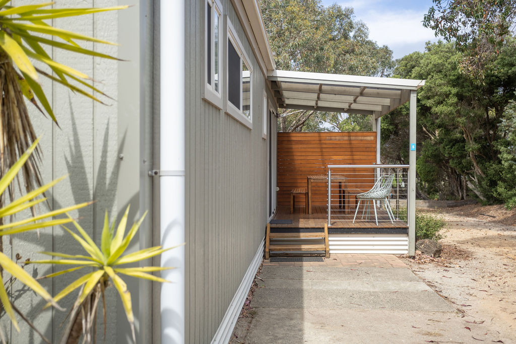 Complete with a well-appointed main bathroom providing a shower, toilet, and basin, our deluxe cabin ensures a comfortable and enjoyable stay for all. Adjacent parking for one vehicle as well as an undercover deck with a dining table.