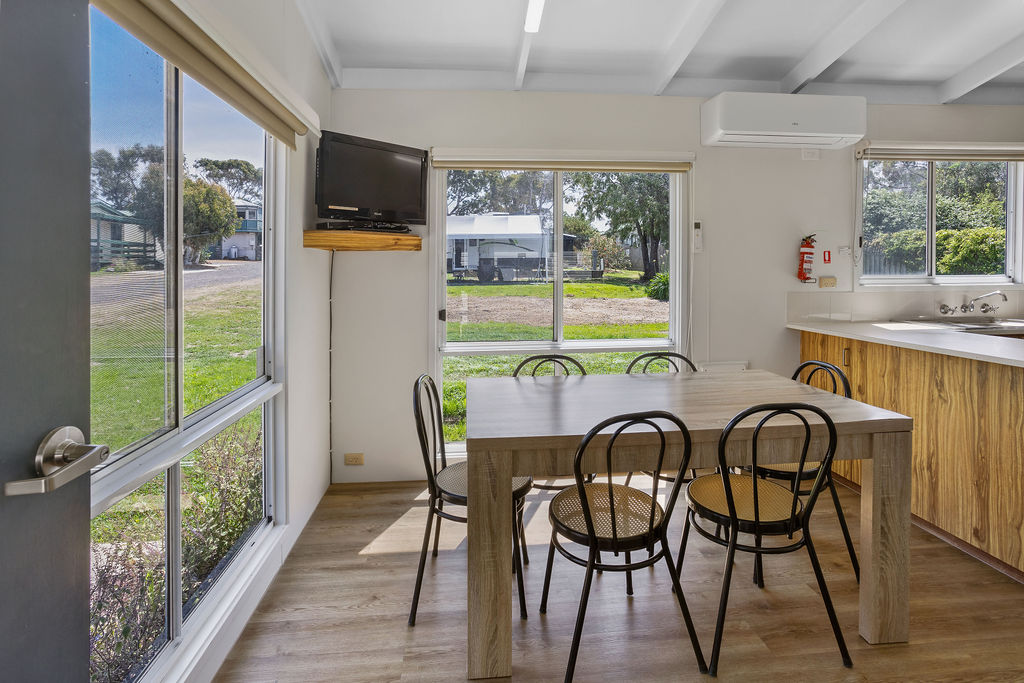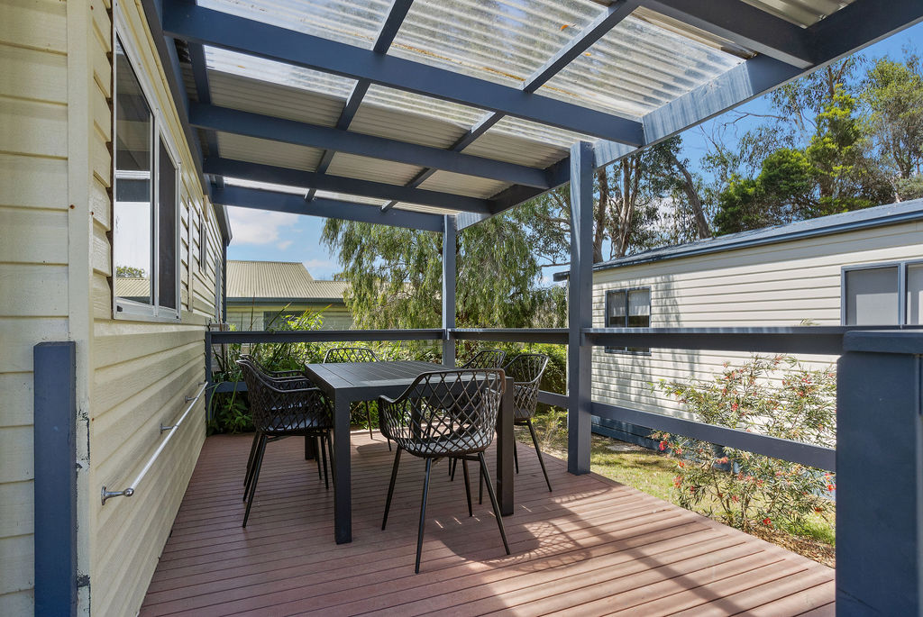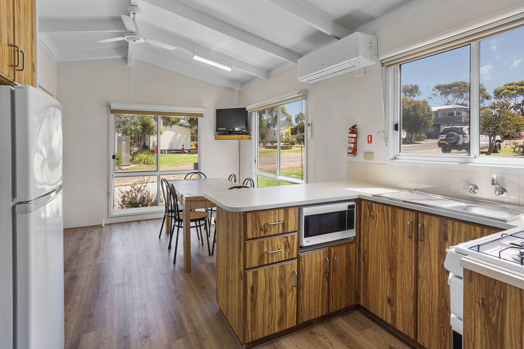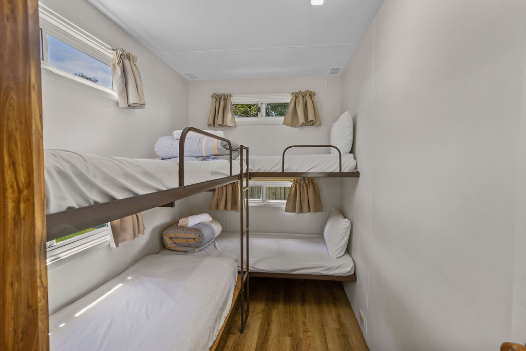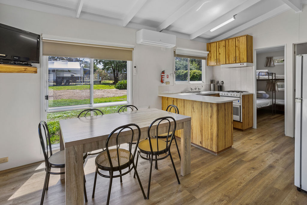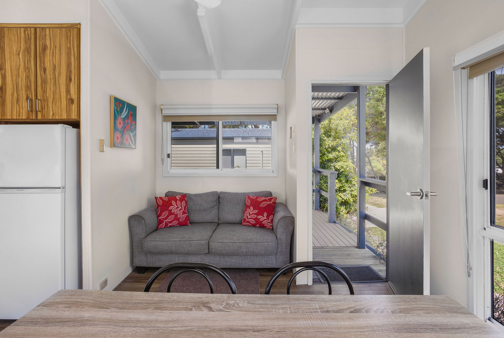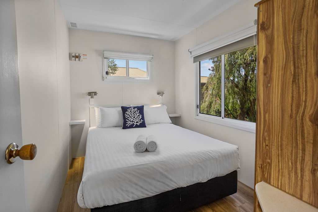 These two-bedroom cabins have a fully equipped kitchen and comfortable living area with dining table, couch and TV plus, reverse cycle air conditioning. The main bedrooms feature a double or queen-sized bed with the second bedroom set up with two sets of bunks accommodating two adults or up to four children.
