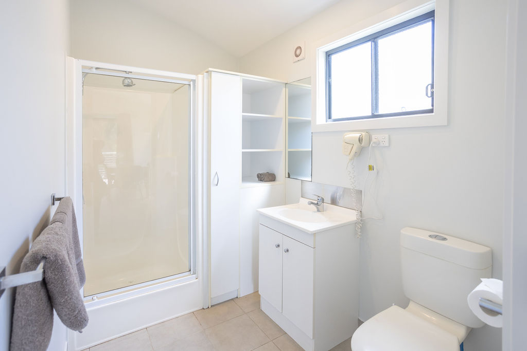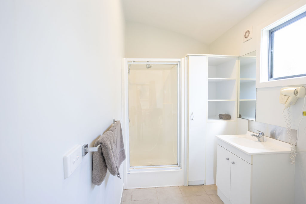The main bedroom features a queen-sized bed. A separate bunk room sleeps 2 adults or up to 4 children in two sets of bunks. A comfortable-sized bathroom provides a shower, toilet and basin. Adjacent parking beside the cabin.