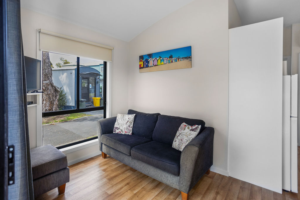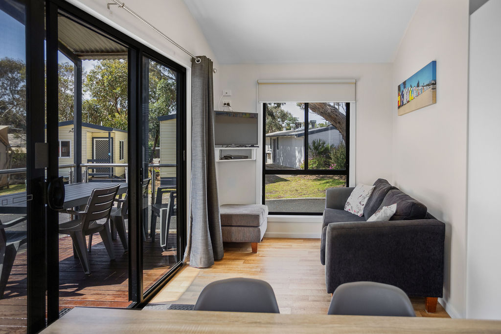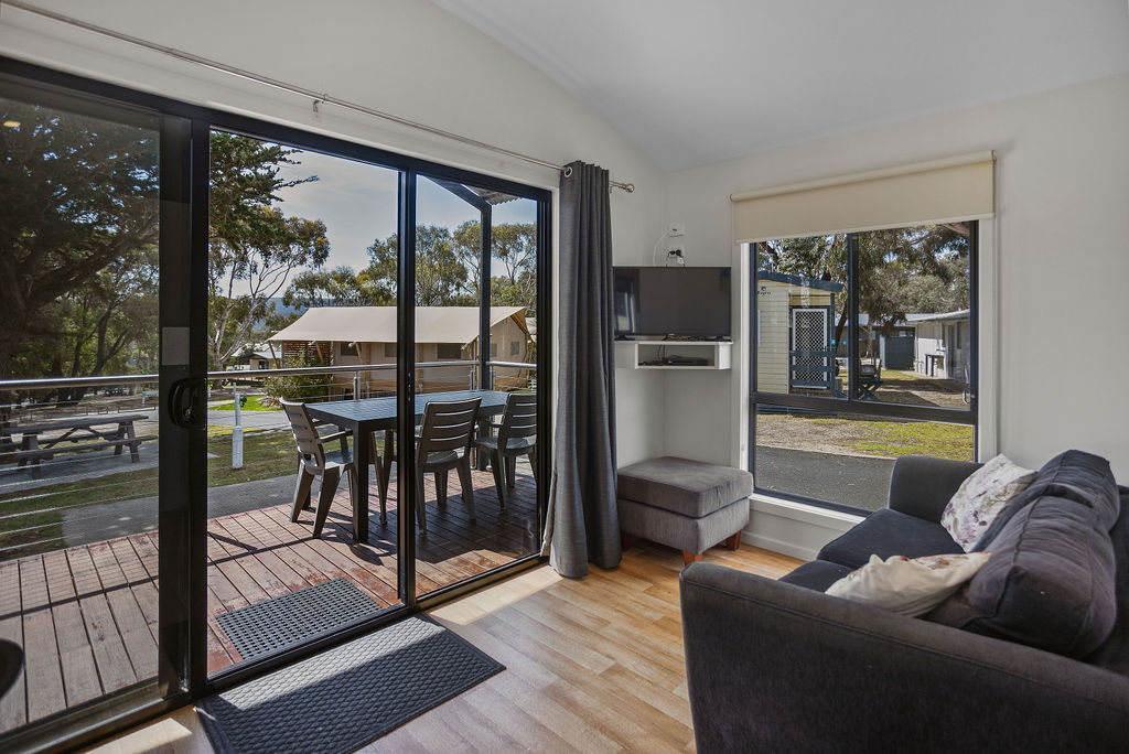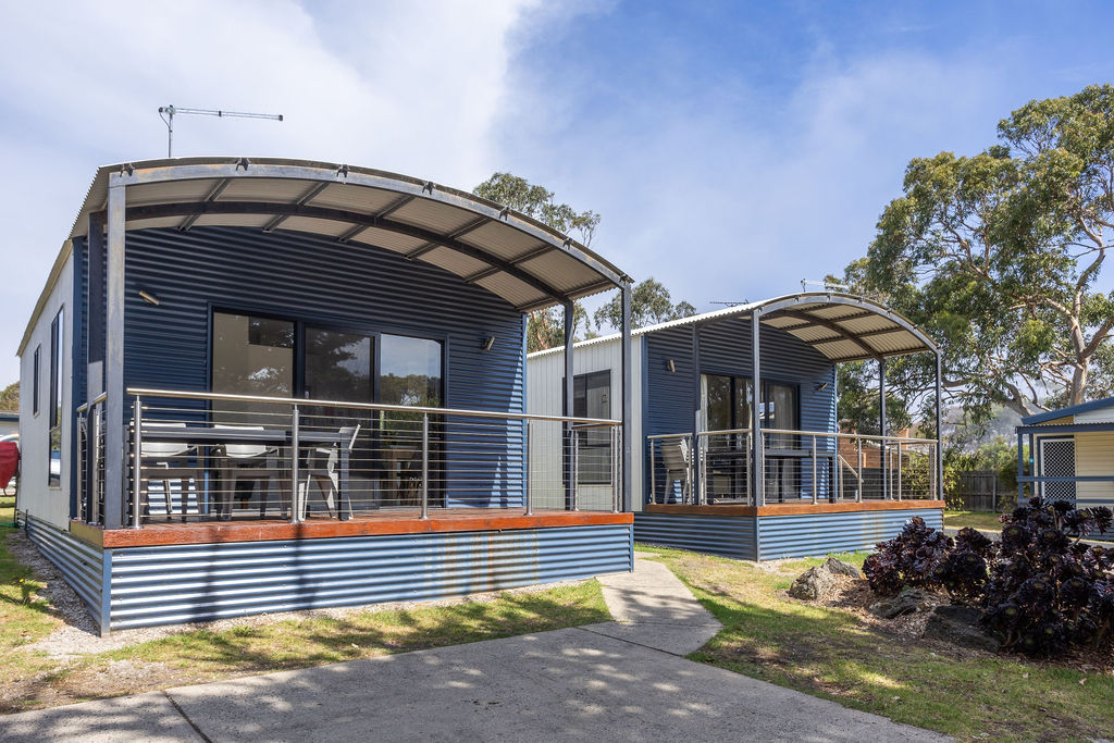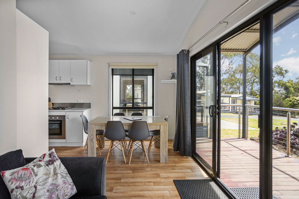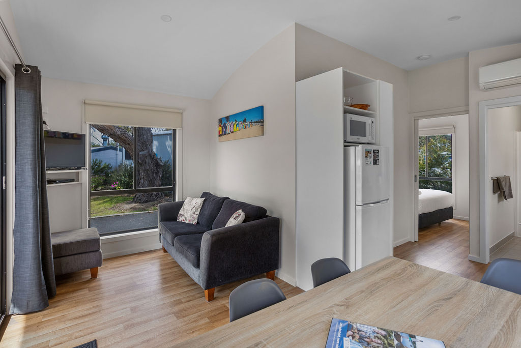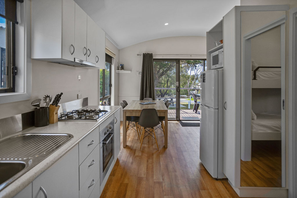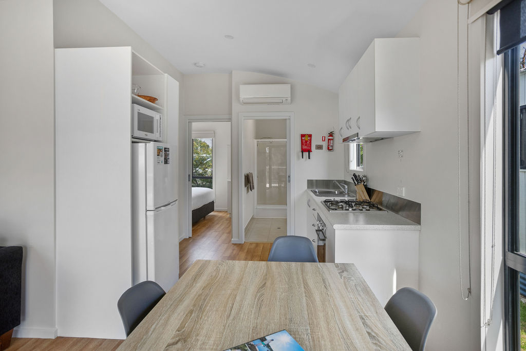 These two-bedroom cabins each have a fully equipped kitchen and comfortable living area with dining table, couch and TV, plus reverse cycle air conditioning.