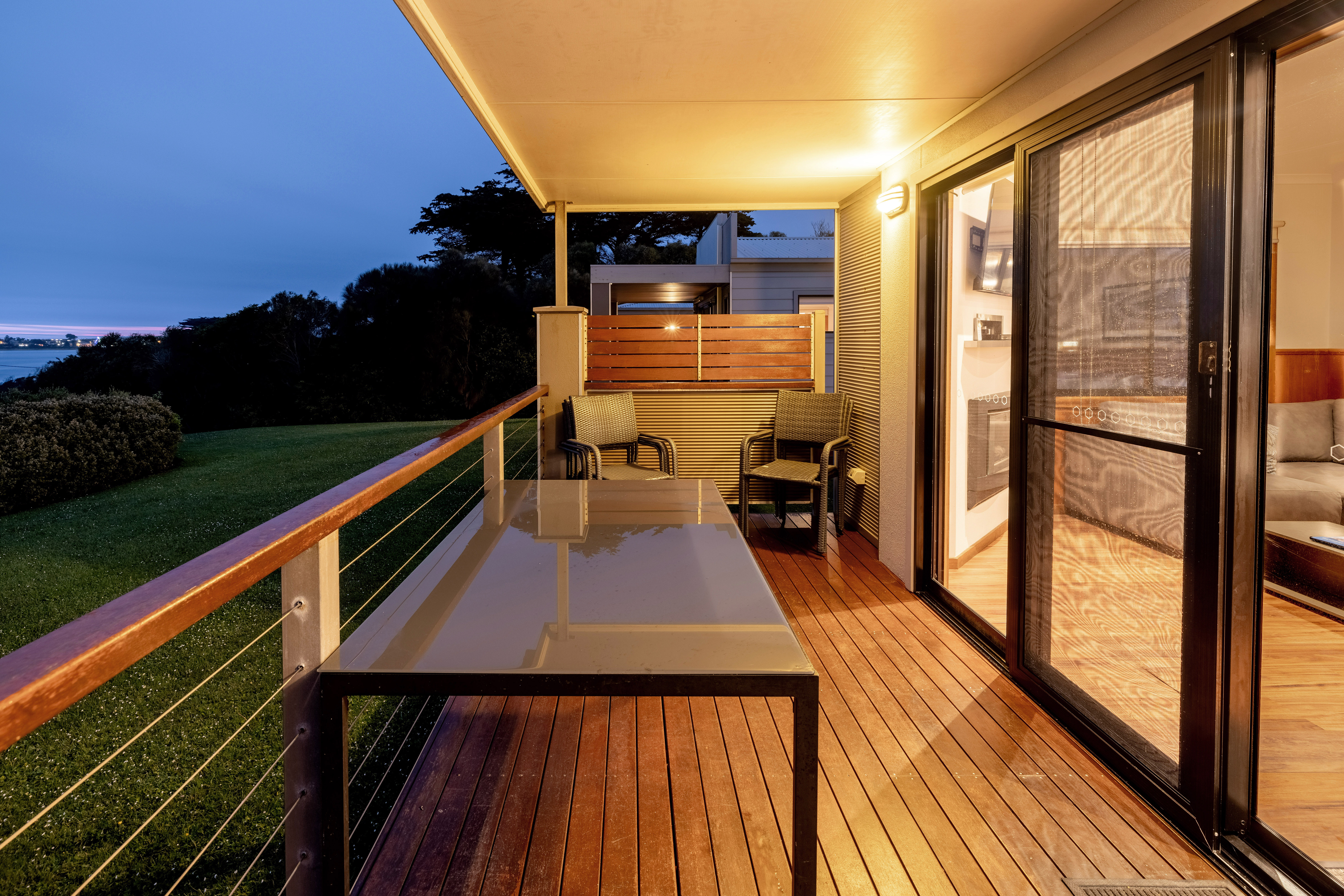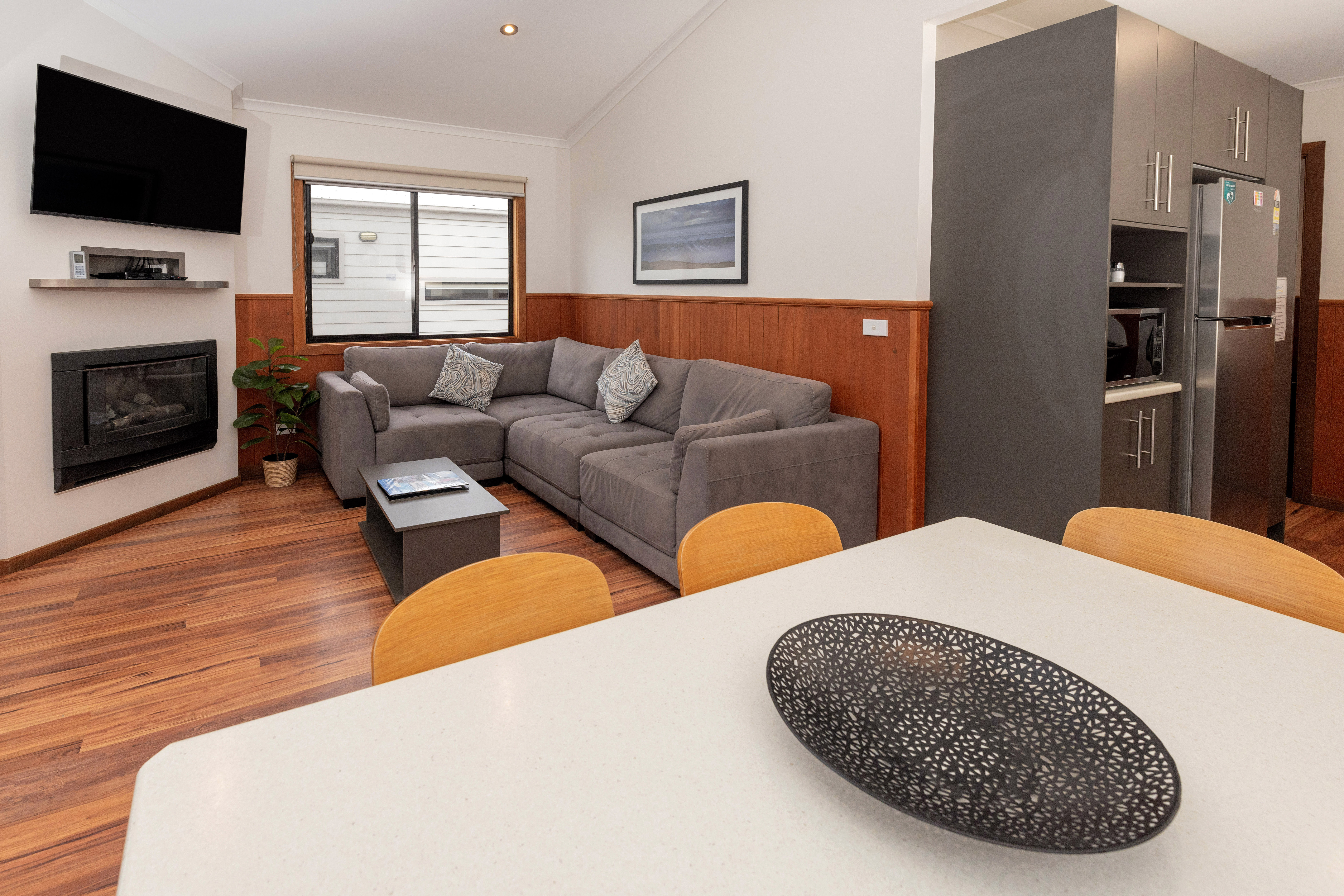 - Living area has comfortable lounge, dining table, electric log fire, air conditioning and opens to private balcony with outdoor setting.