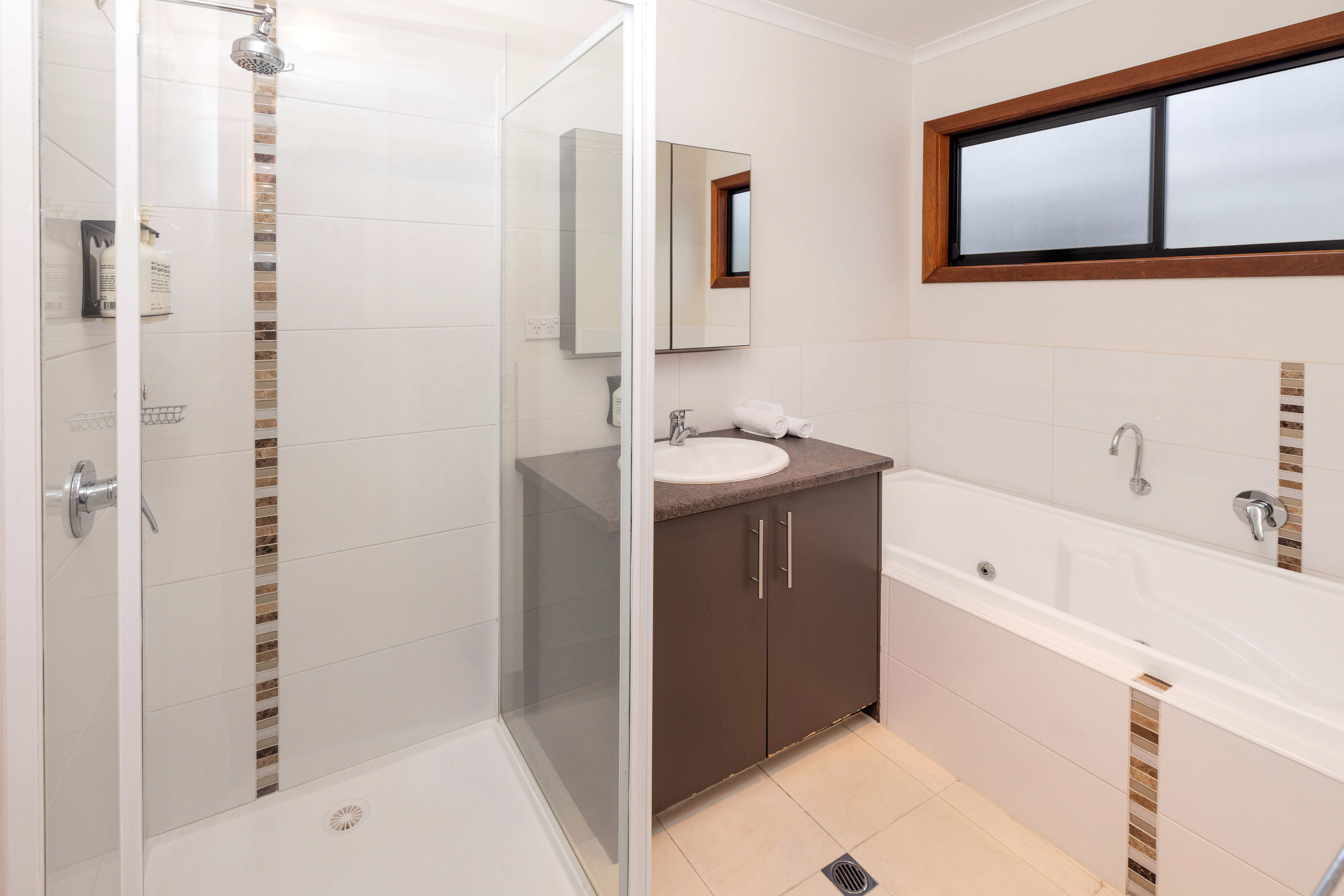 - Walk in shower and separate spa bath.