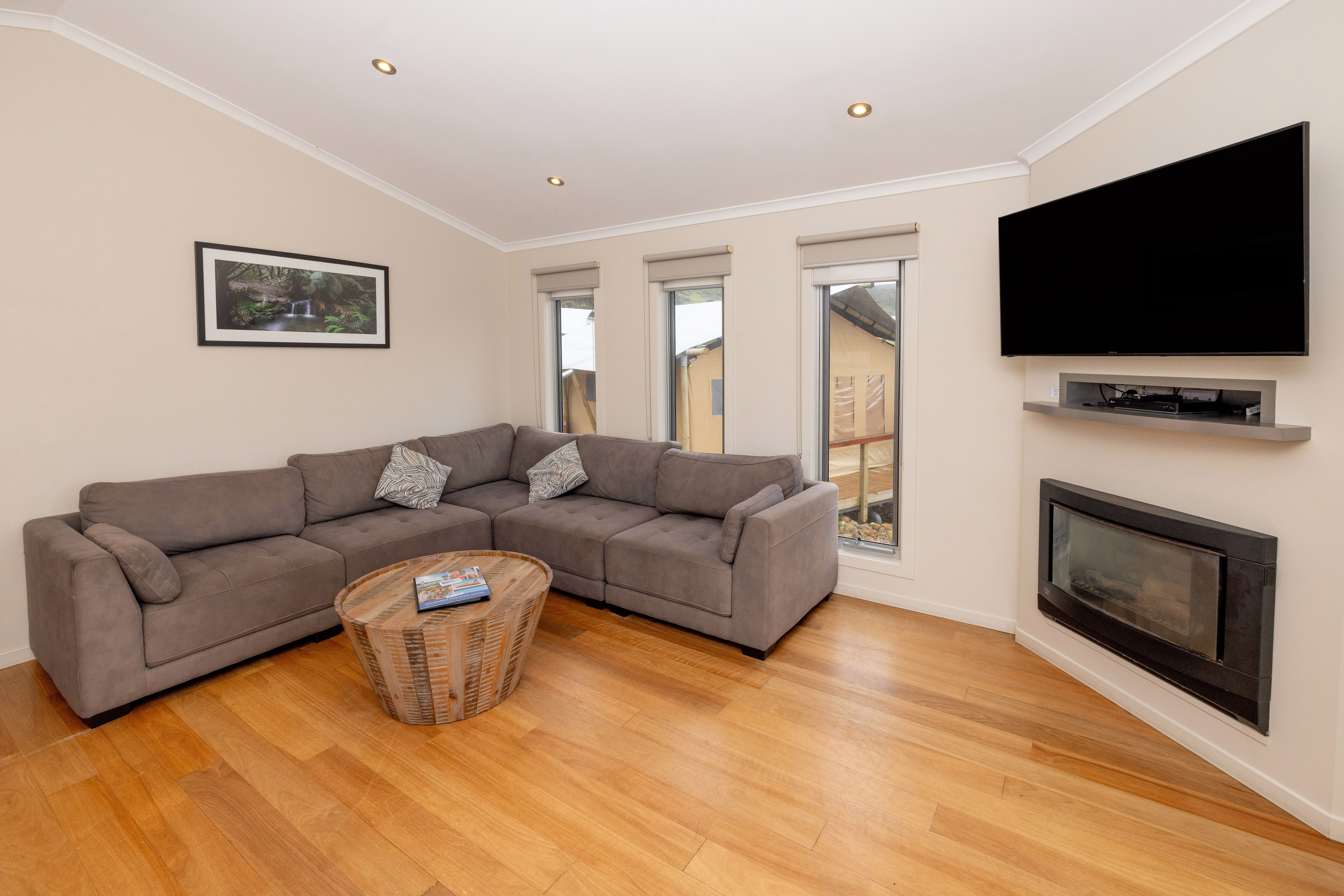 - The living area has a large comfortable lounge, dining table, electric log fire, air conditioning and opens to private balcony with large outdoor setting.