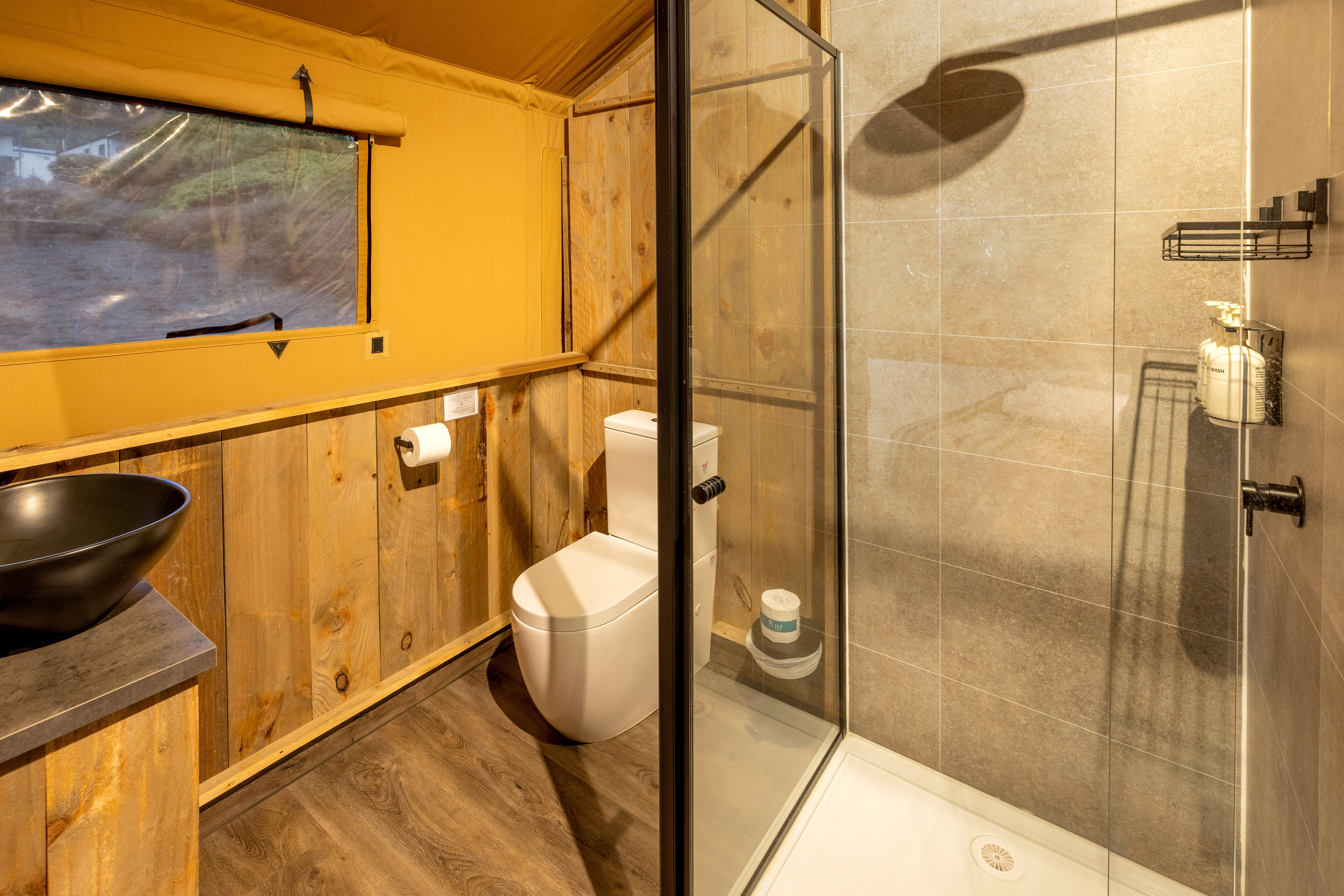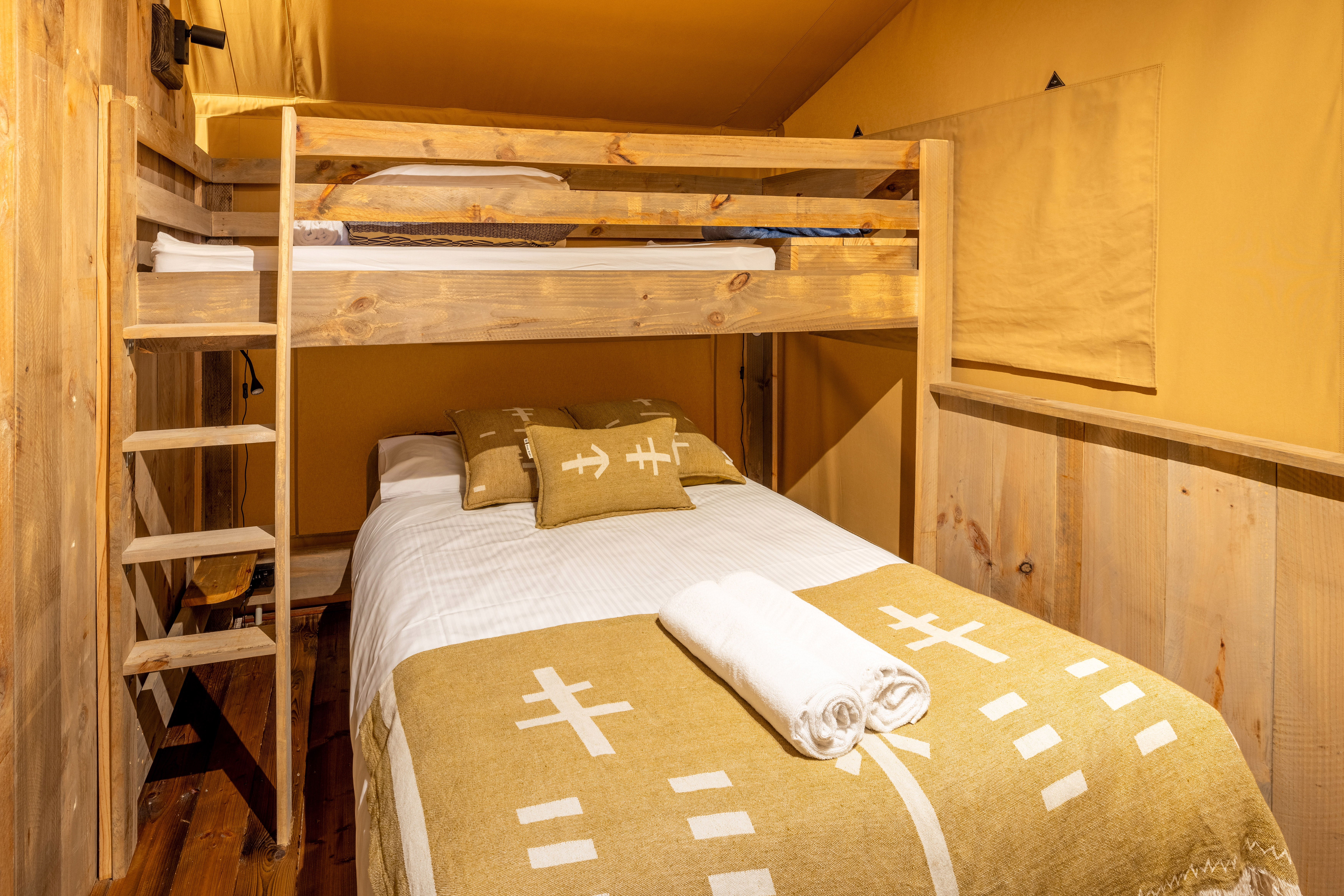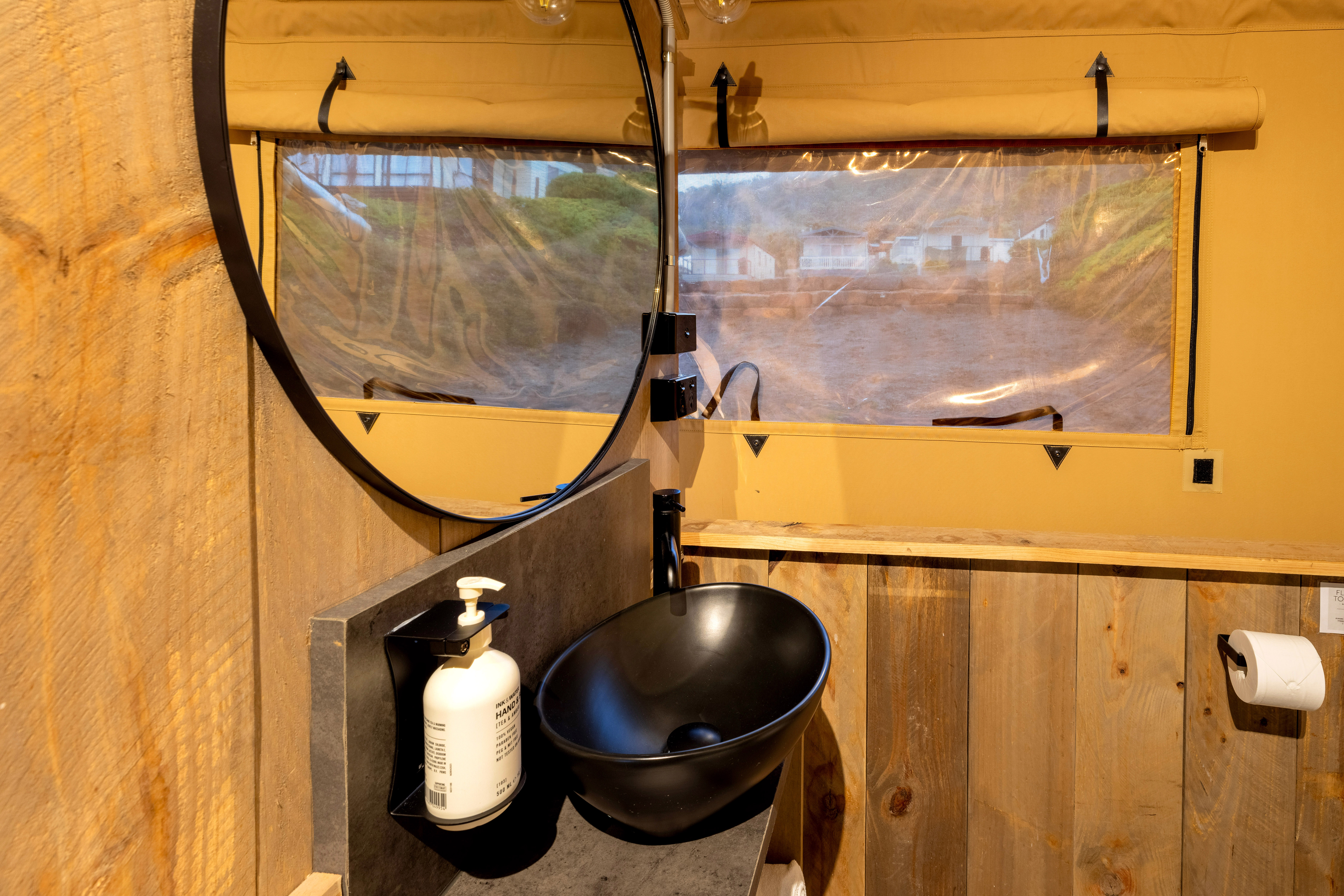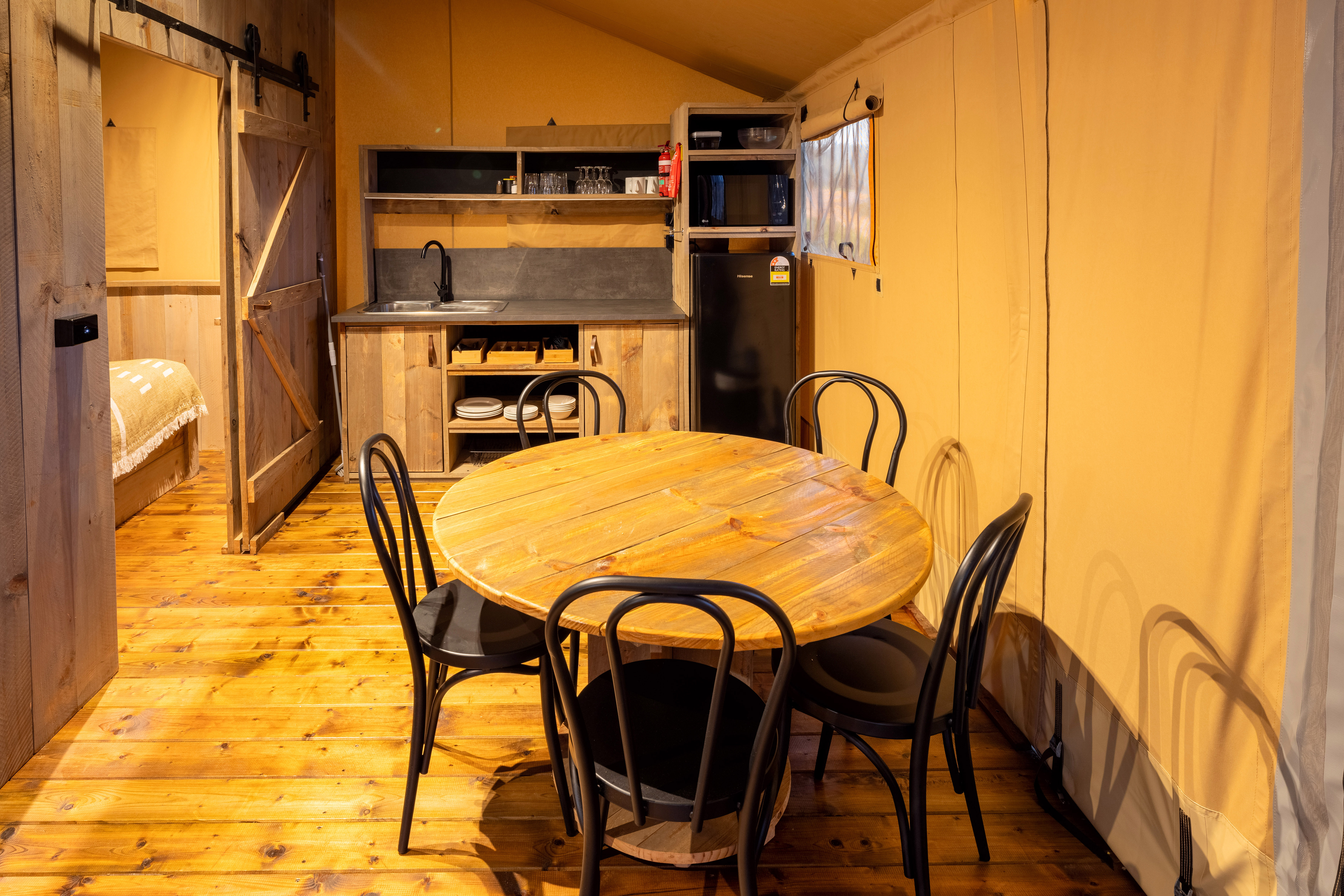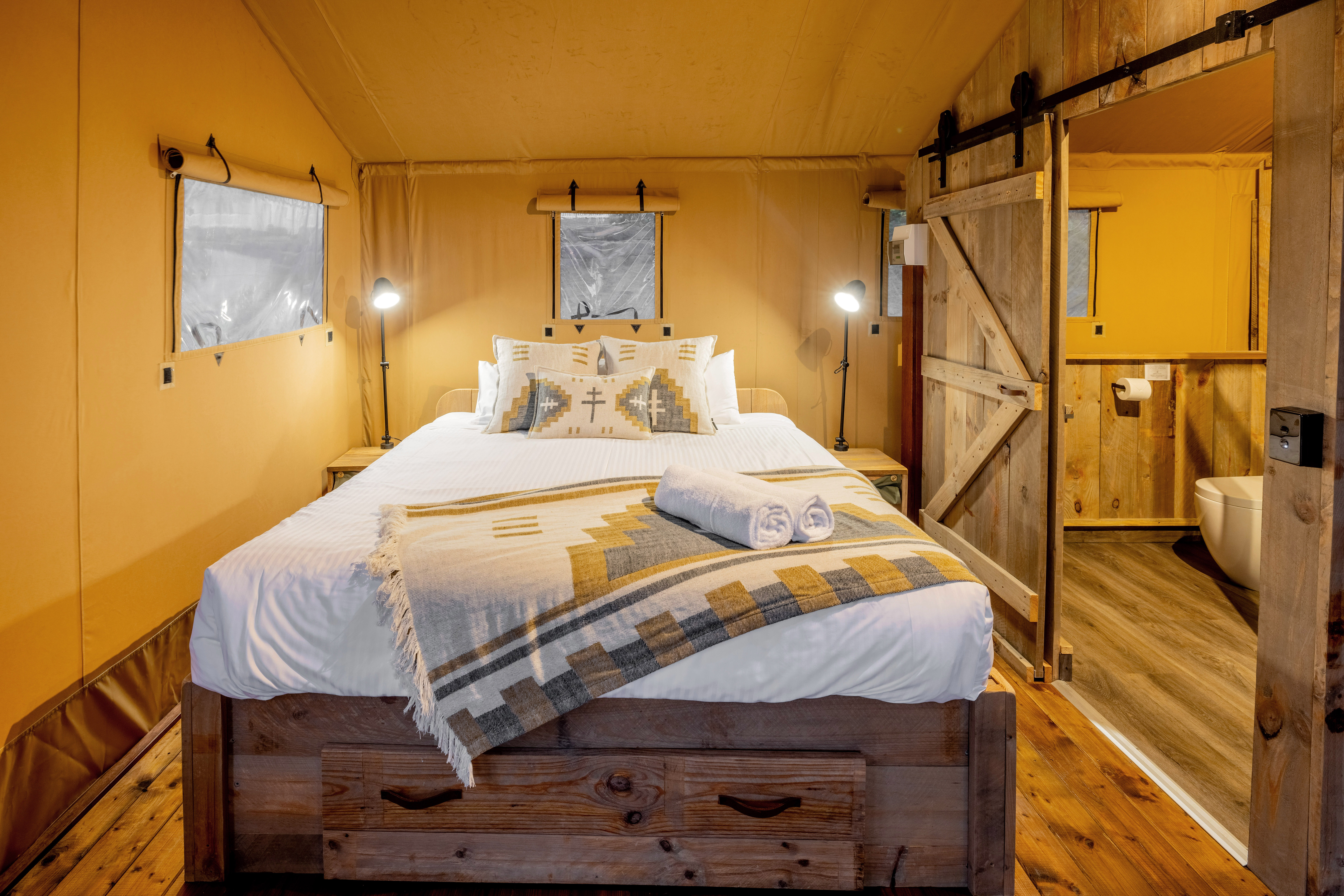 Glamping is glam camping - a more luxurious way of camping that still has you sleeping in the great outdoors, but with more comfort than your average tent. The interior is designed with a rustic flair.