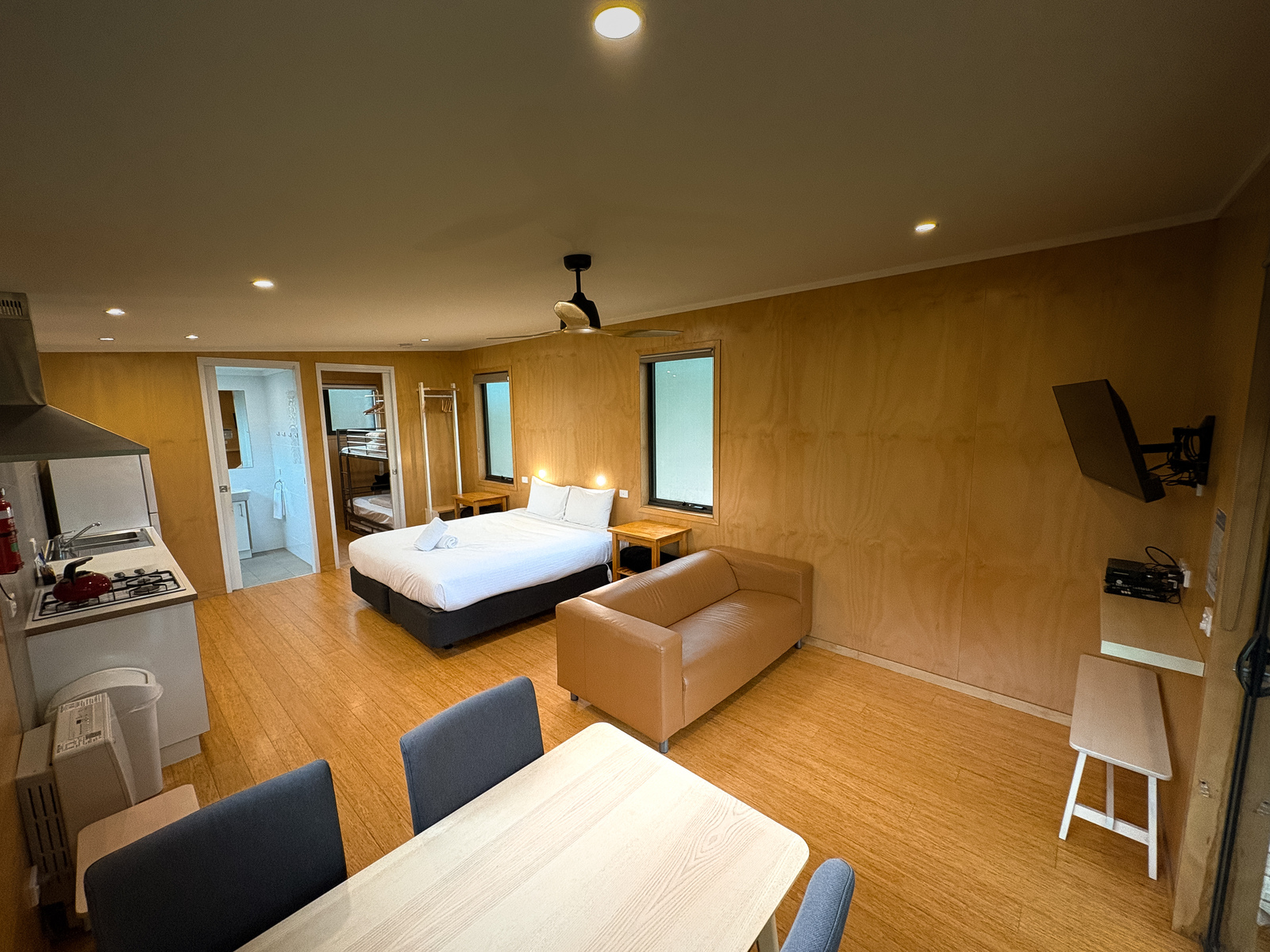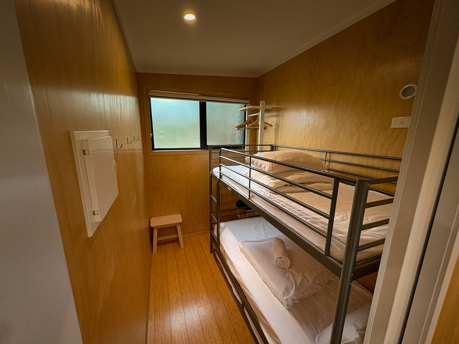 Bedrooms: King size bed in lounge room. BR1: 1 x bunks & trundle. All linen provided. Please note: If only 2 guests’ book, the second bedroom only open by request.