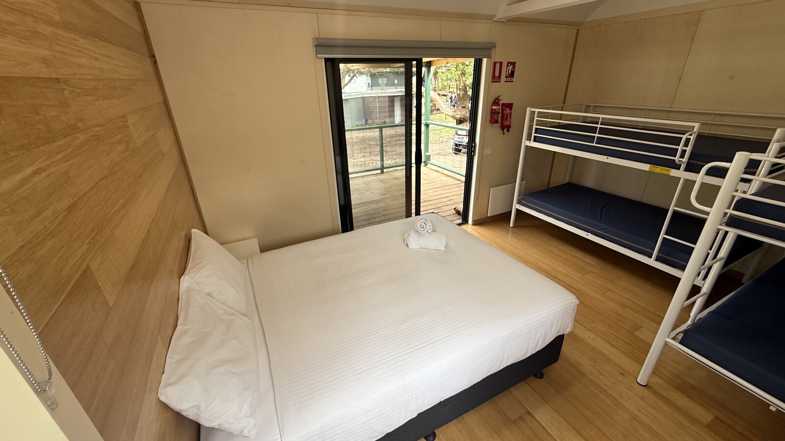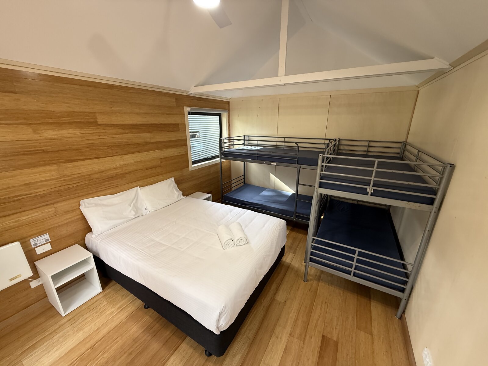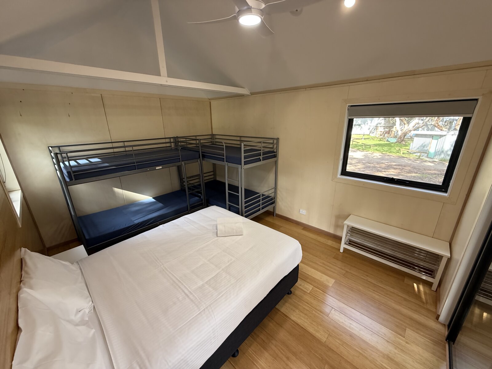 BIG ROOMS BEDS- 1 queen size bed (full linen supplied) and 2 sets of bunks BYO linen (adults only on bottom bunks).