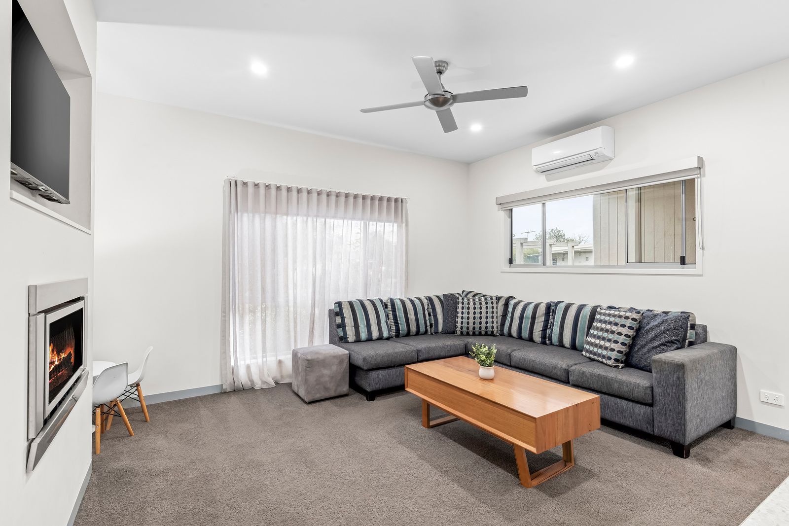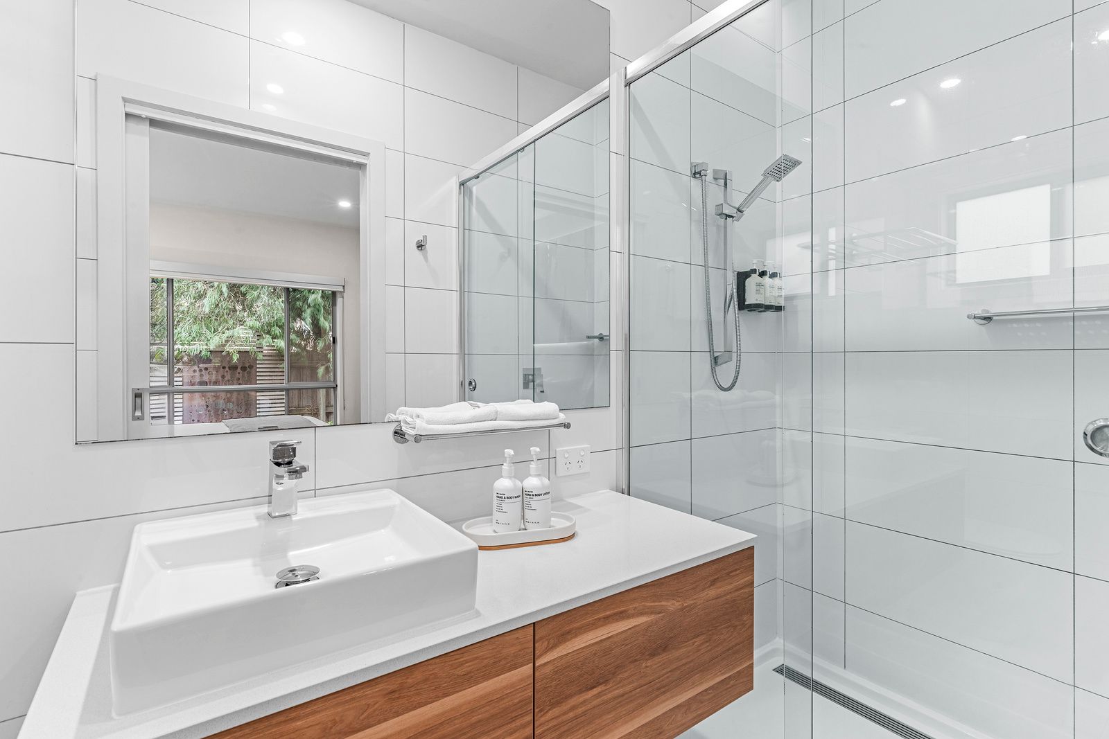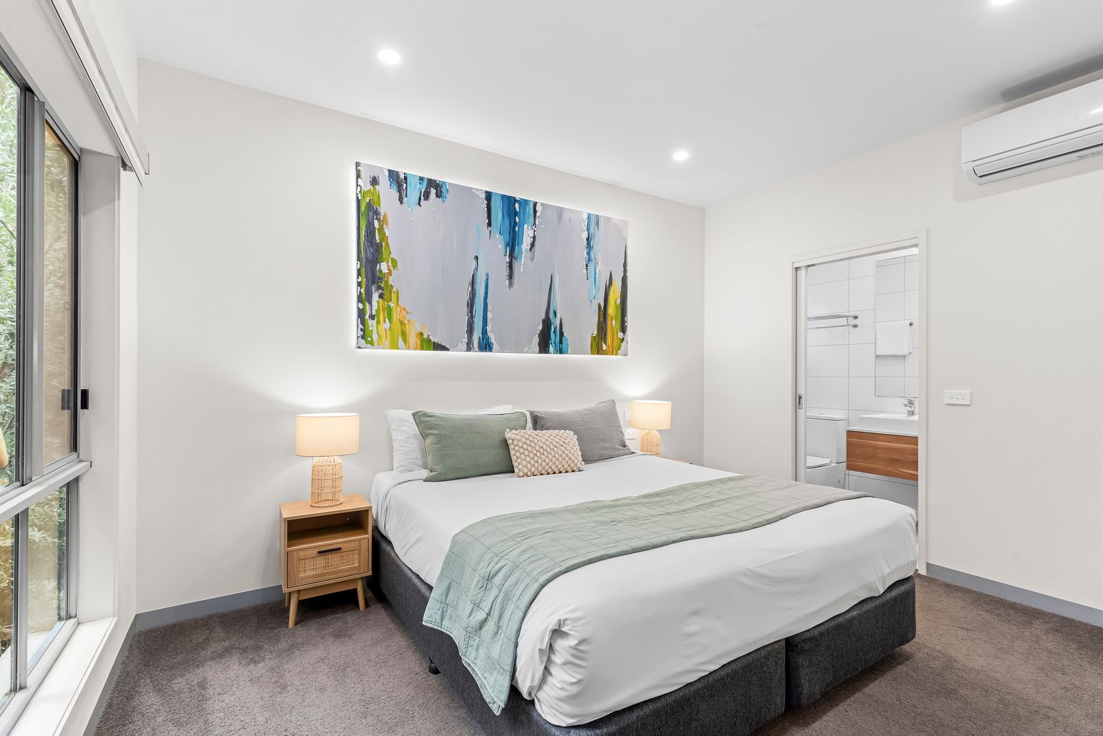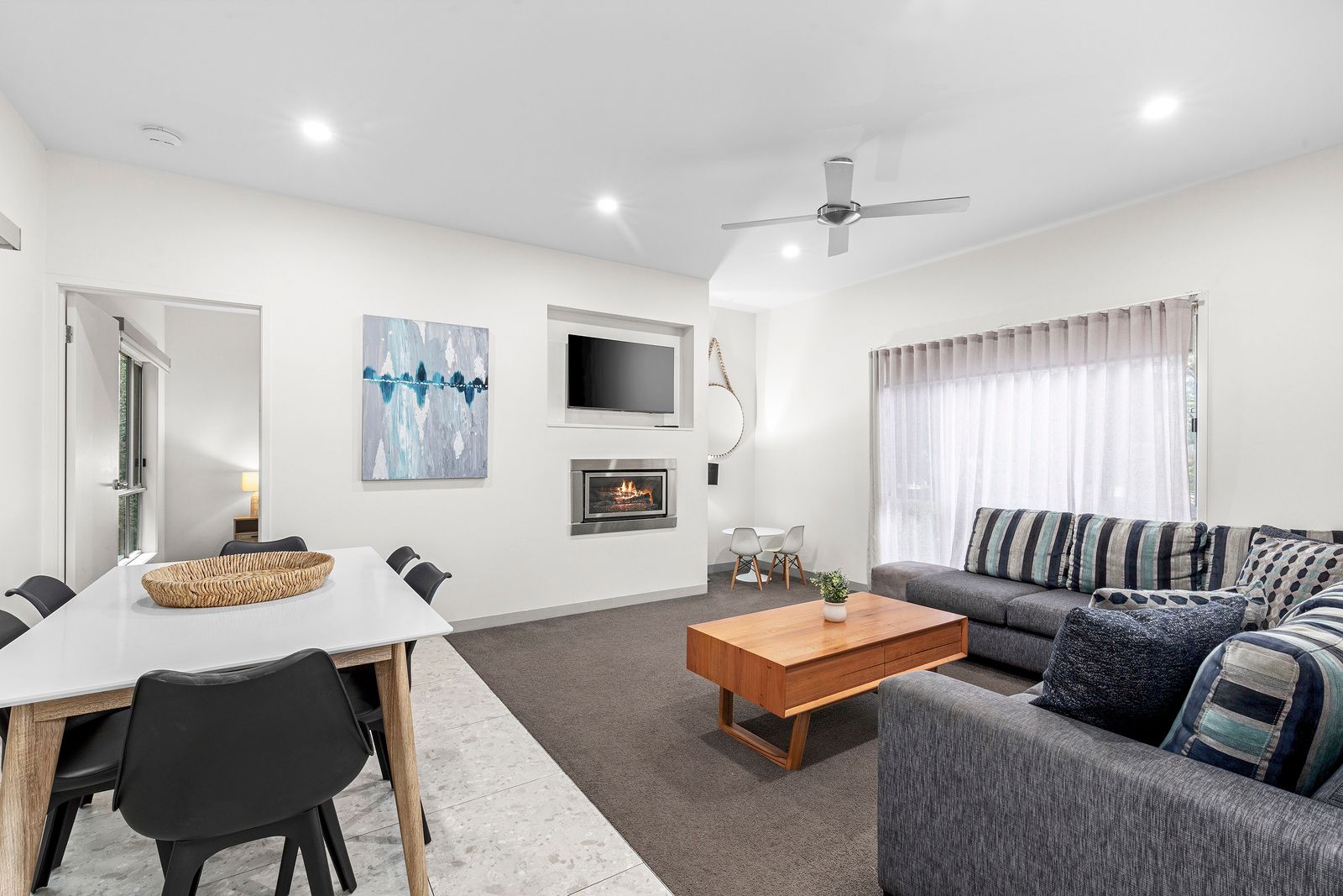 Enjoy coastal bliss in a comfortable and modern sanctuary. Our 2 Bedroom Deluxe Villas sleep up to six guests with a king bed or two single beds and ensuite in the main bedroom and a queen bed, bunk and ensuite in the second bedroom, as well as a spacious living area, kitchen, and private deck.