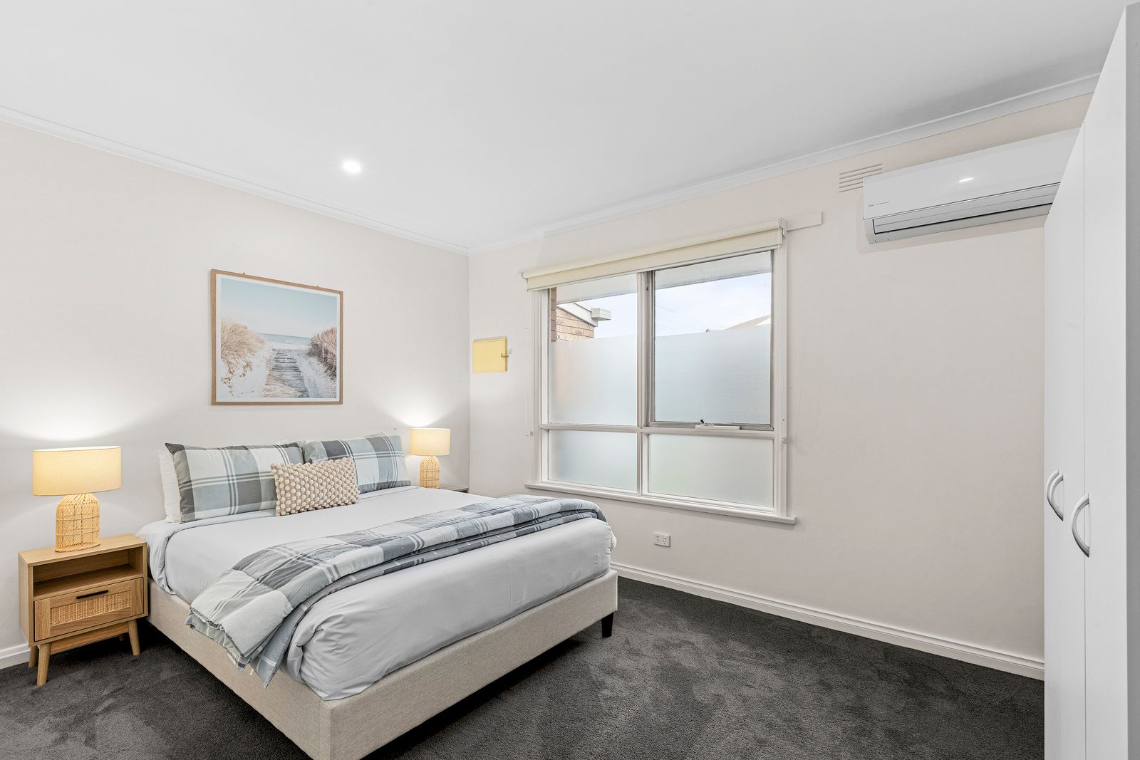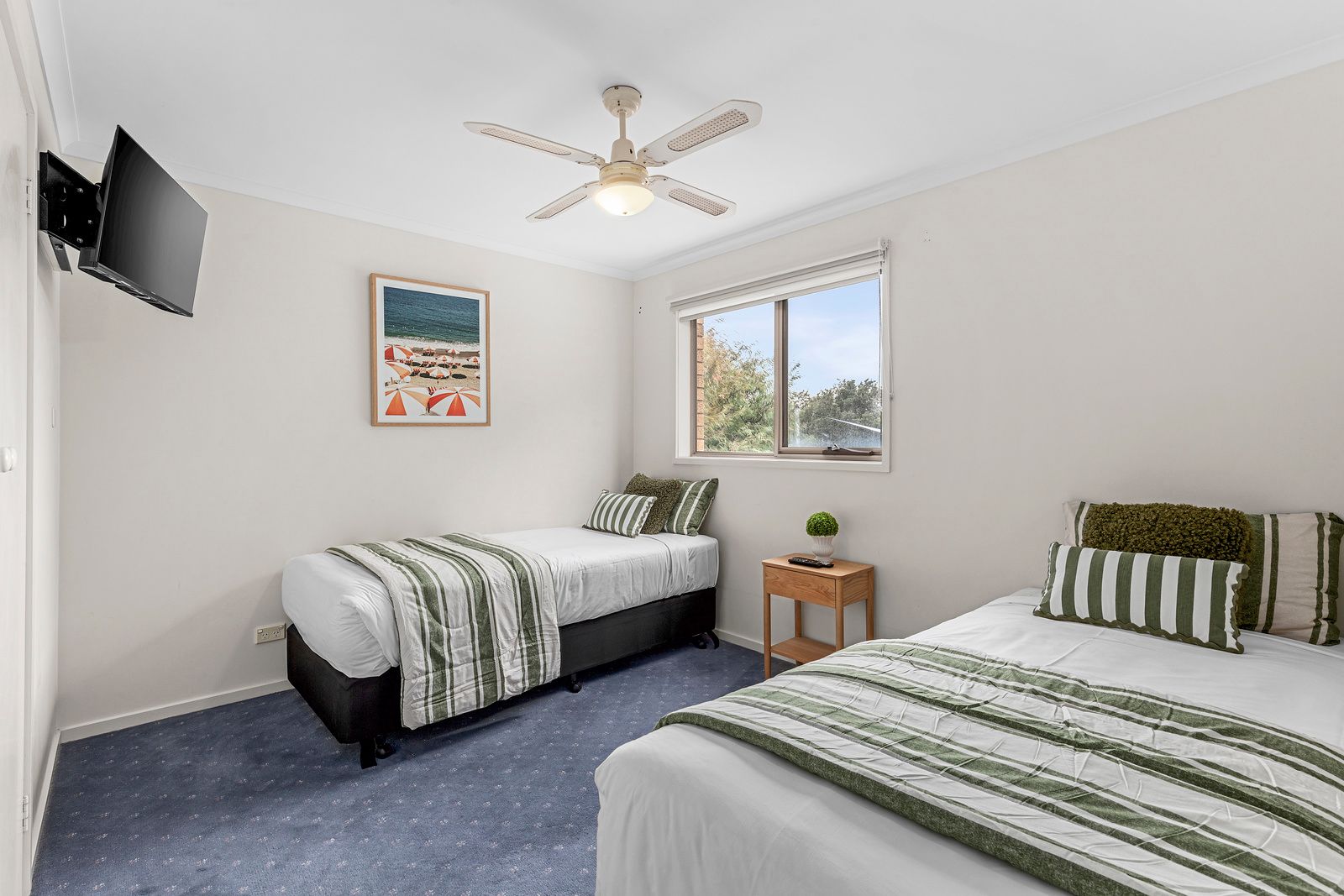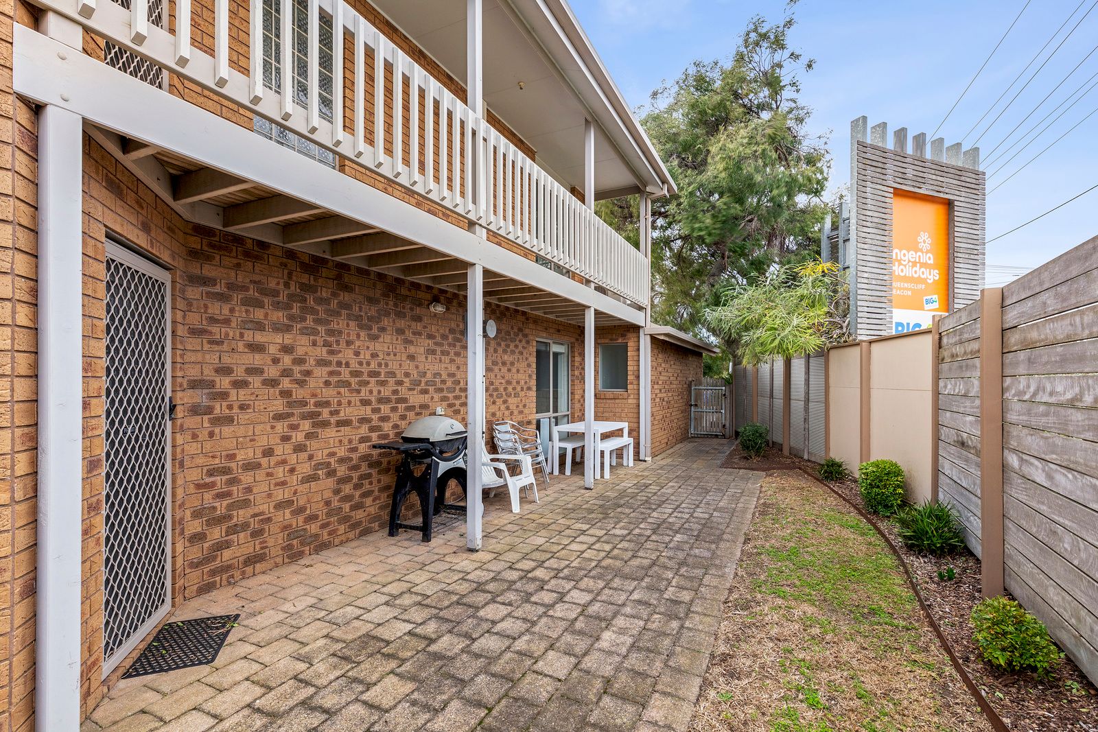 Perfect for families or groups, this two-storey retreat sleeps up to eight guests. Upstairs, you’ll find a queen bed in the main bedroom, two single beds in the second bedroom, and a full bathroom. Downstairs features two additional bedrooms, each with a queen bed, another bathroom, and a generous open-plan kitchen and living area. Enjoy the convenience of an enclosed garage and unwind in your private courtyard complete with outdoor seating, ideal for relaxed coastal living.