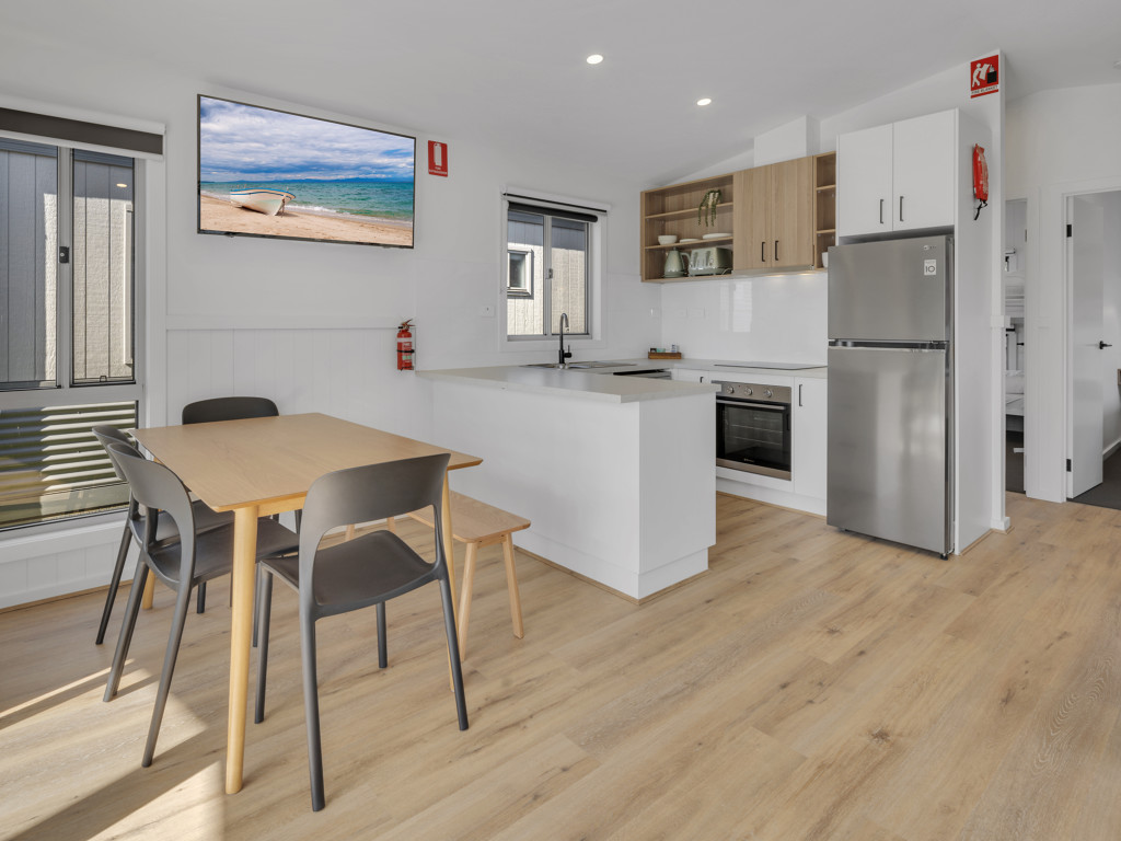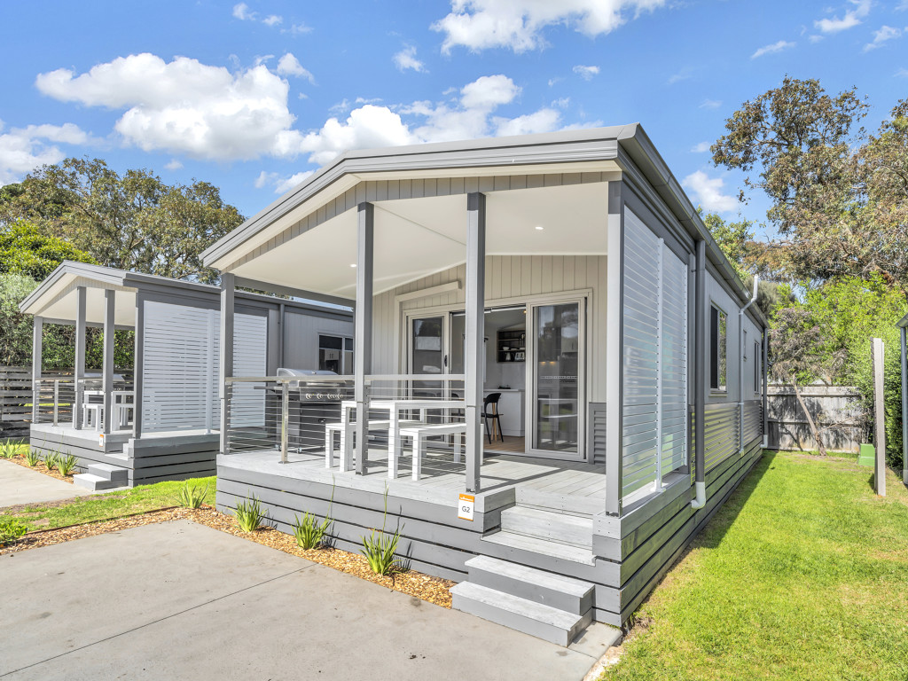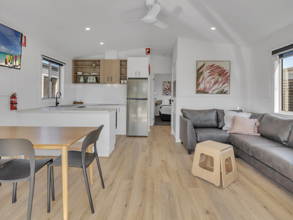 Enjoy a stay in modern comfort. Our 2 Bedroom Lonsdale Cabins sleep up to six guests with a queen bed in the main bedroom and two bunks in the second bedroom, as well as a bathroom with separate toilet, an open plan living area, a kitchen and a private deck.